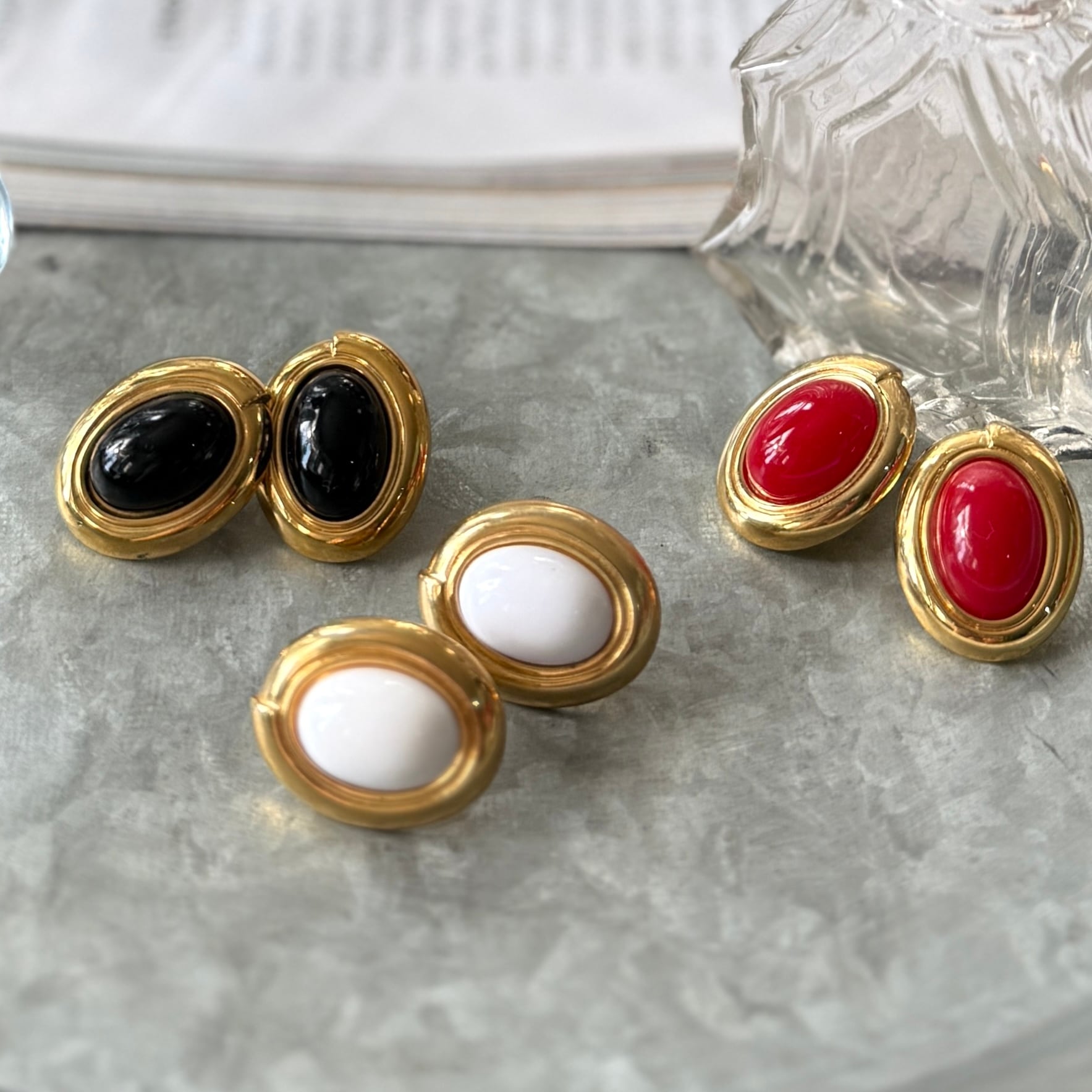 赤いカボションが印象的なゴールドトーンオーバル型イヤリング。