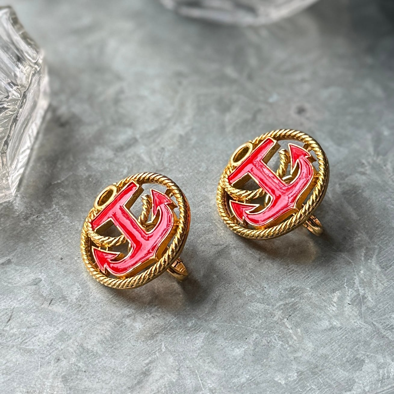 ゴールドトーンをベースに赤いエナメルペイントされたアンカーモチーフのクリップイヤリング。