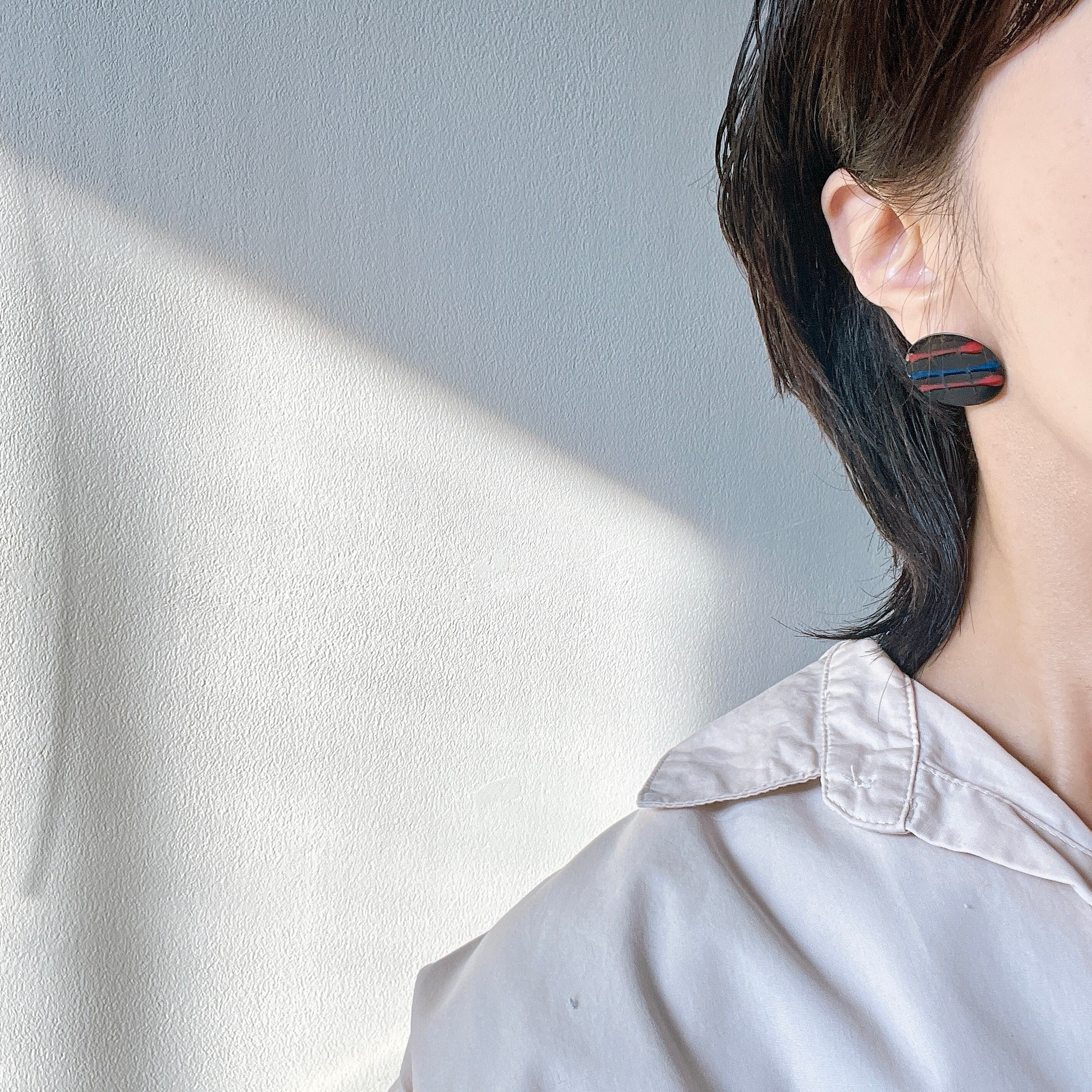 P645-ヴィンテージピアス U.S.A. 1980s Blue and pink checkered pattern black round plate pierced earrings | eslup_boutique