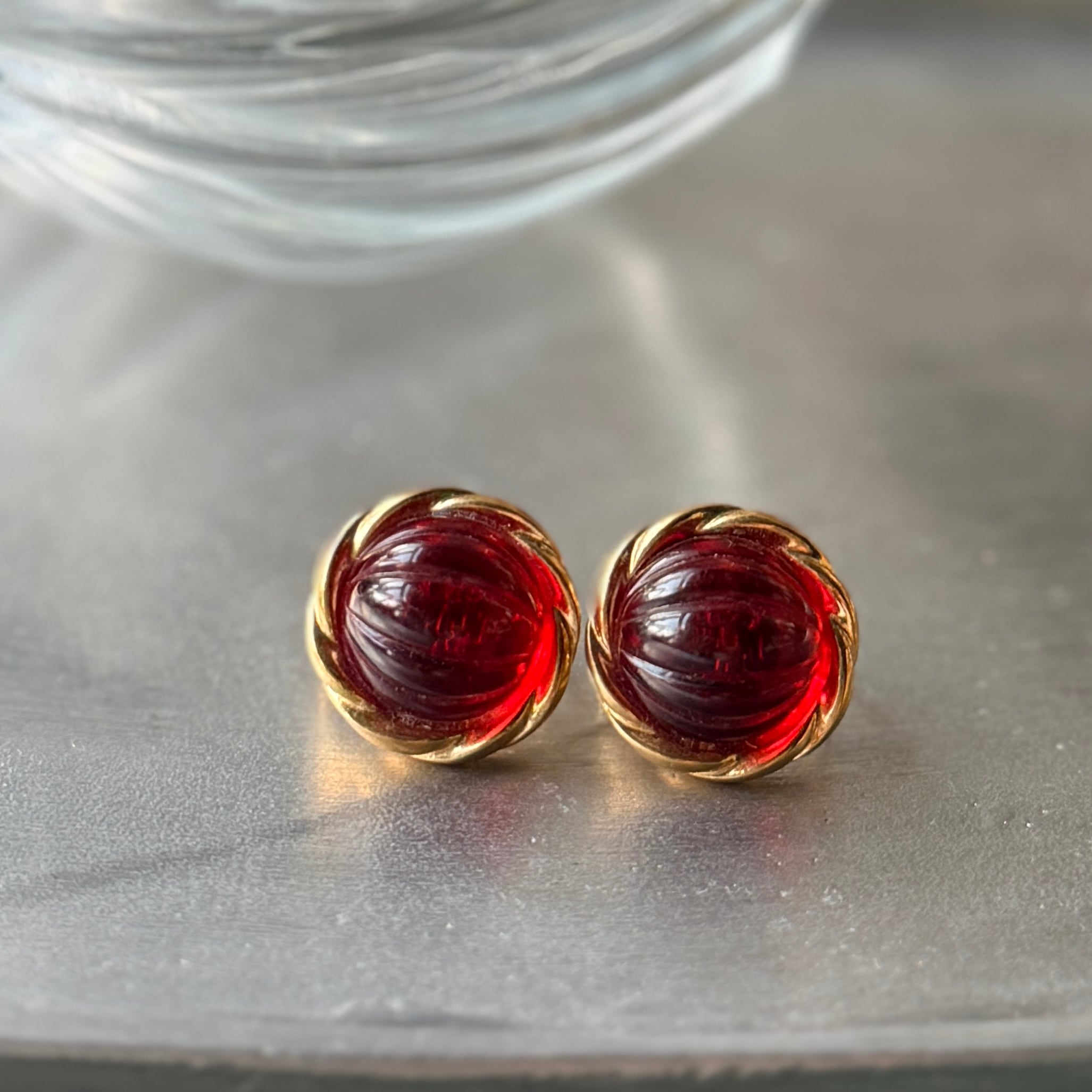 ゴールドトーンをベースにレッドカラーグラスのクリップイヤリング。