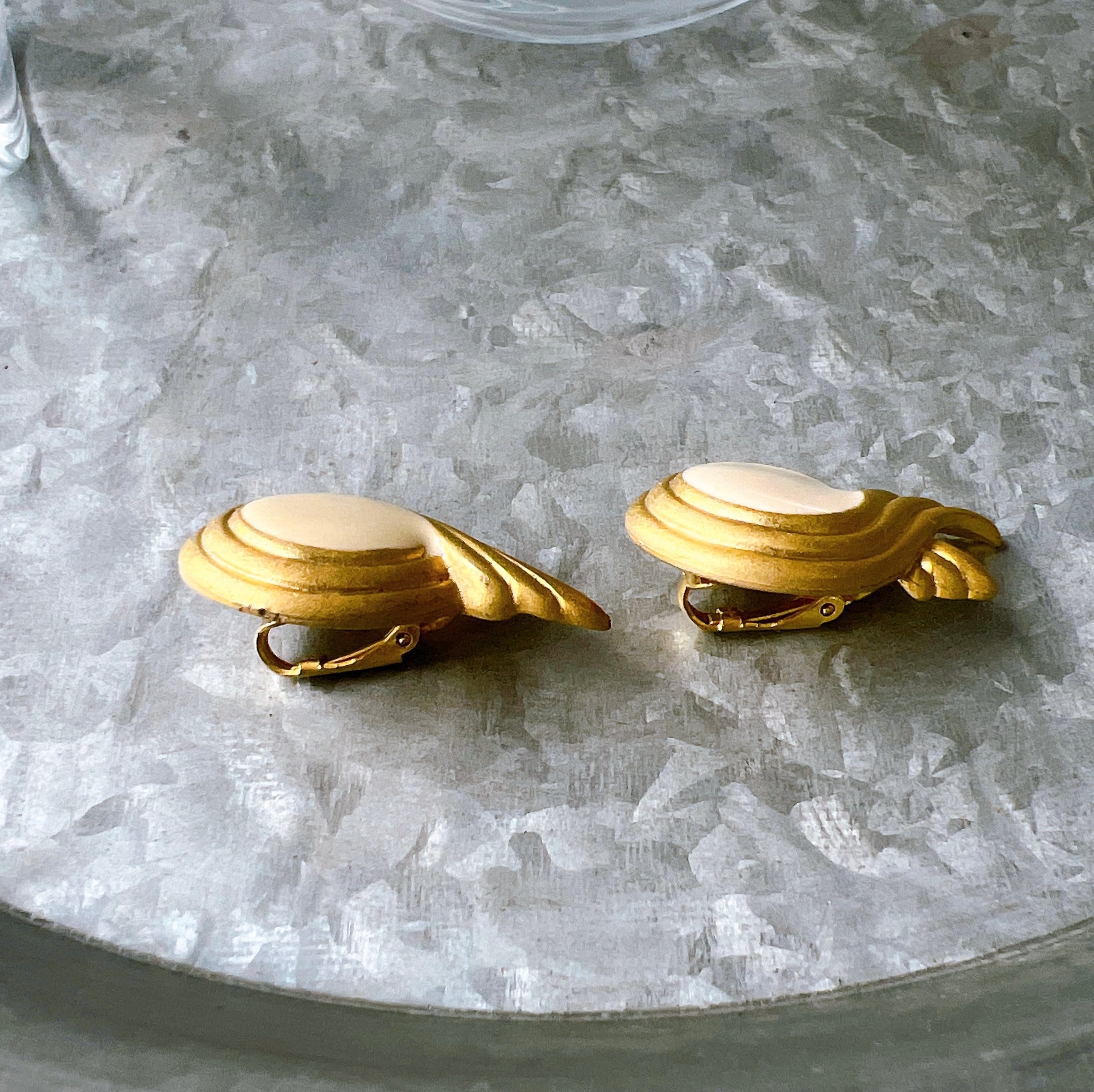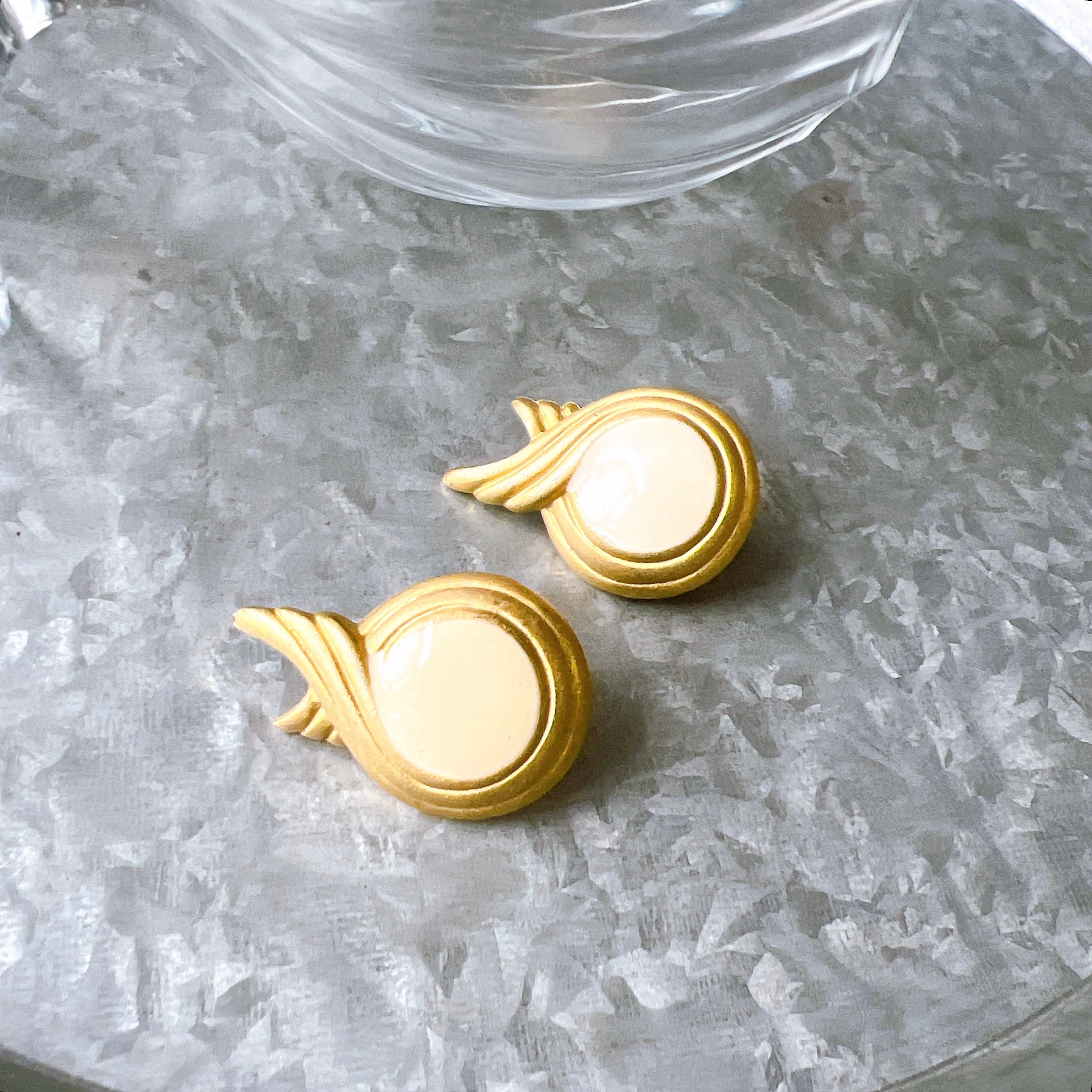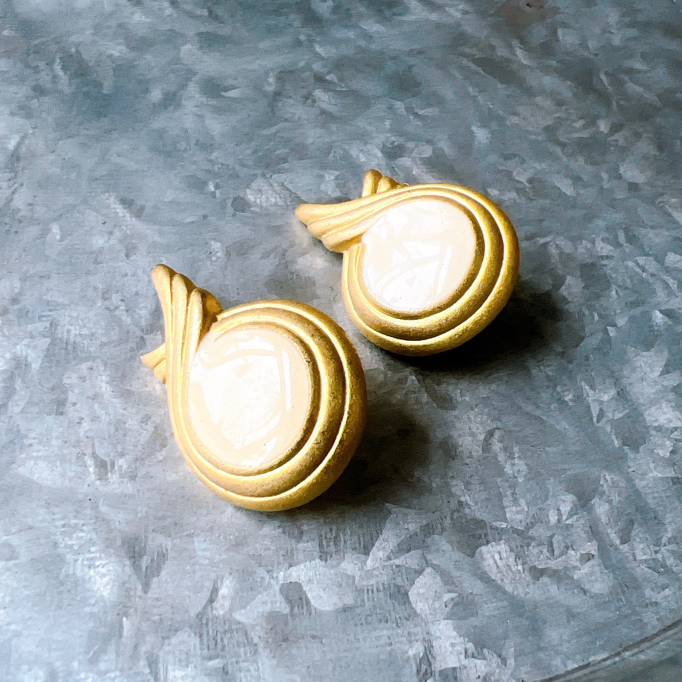 ゴールドトーンをベースに、アイボリーカラーのエナメルペイントされたイヤリング。