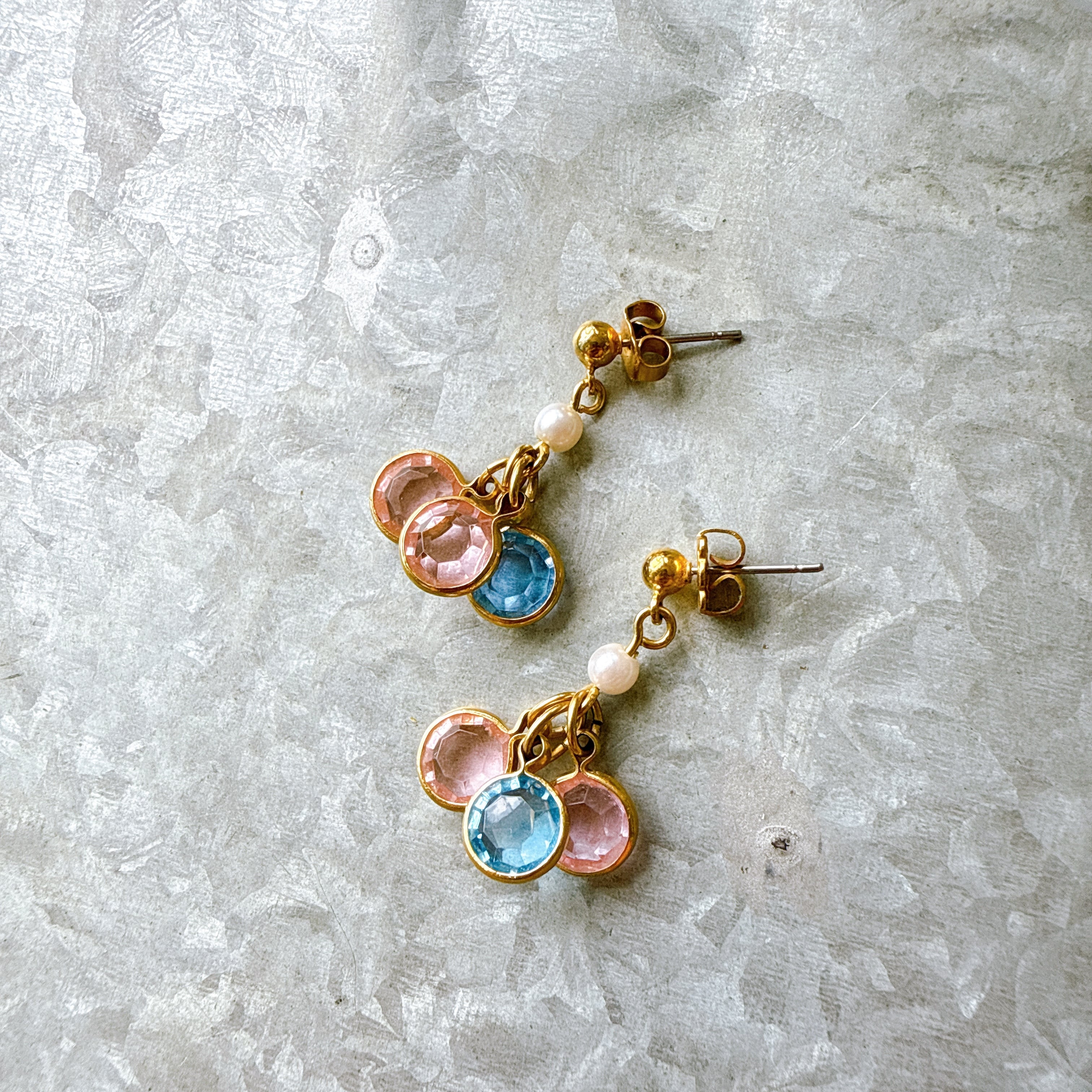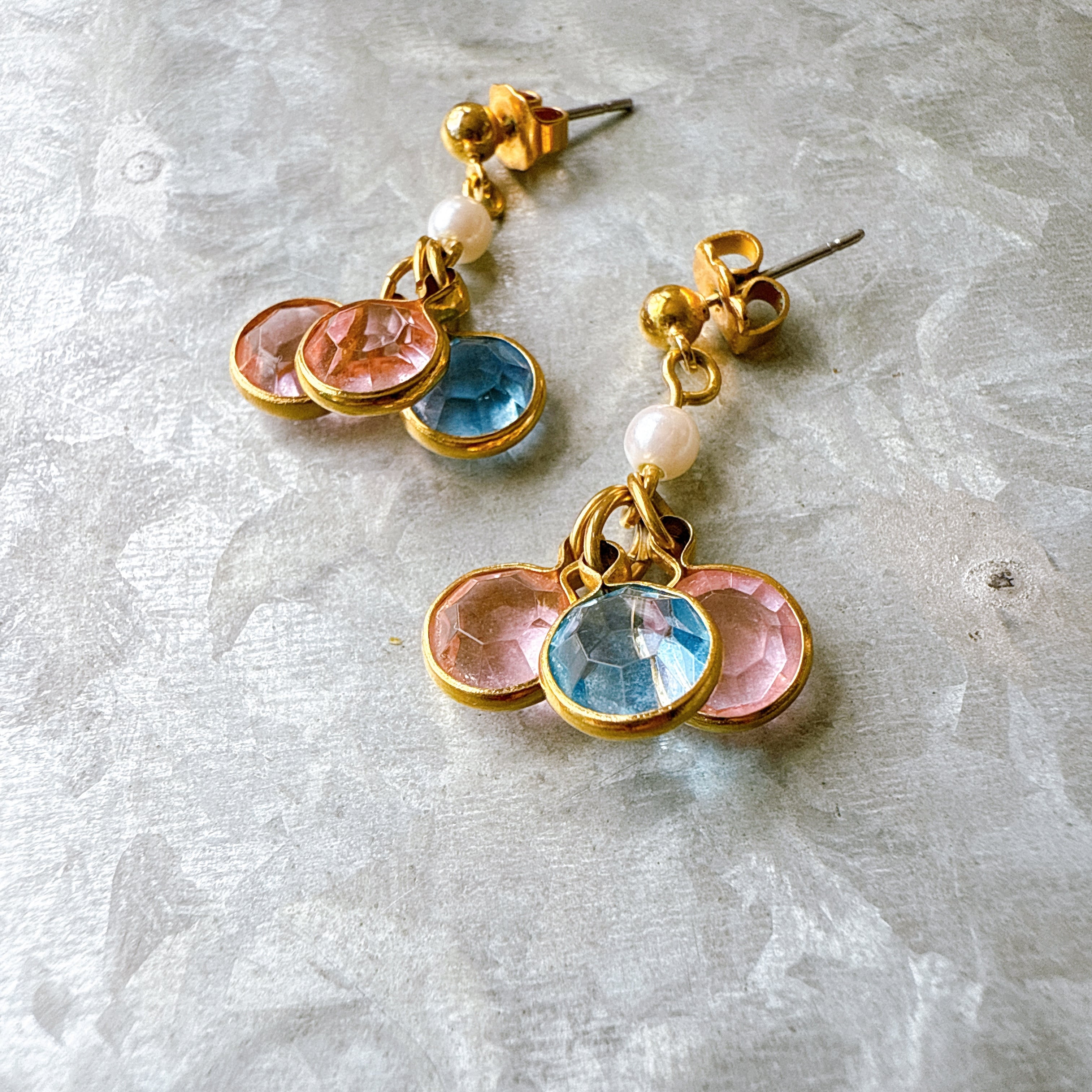 ピンクとライトブルーのクリスタルカットグラスが軽やかなゴールドトーンハンギングピアス。