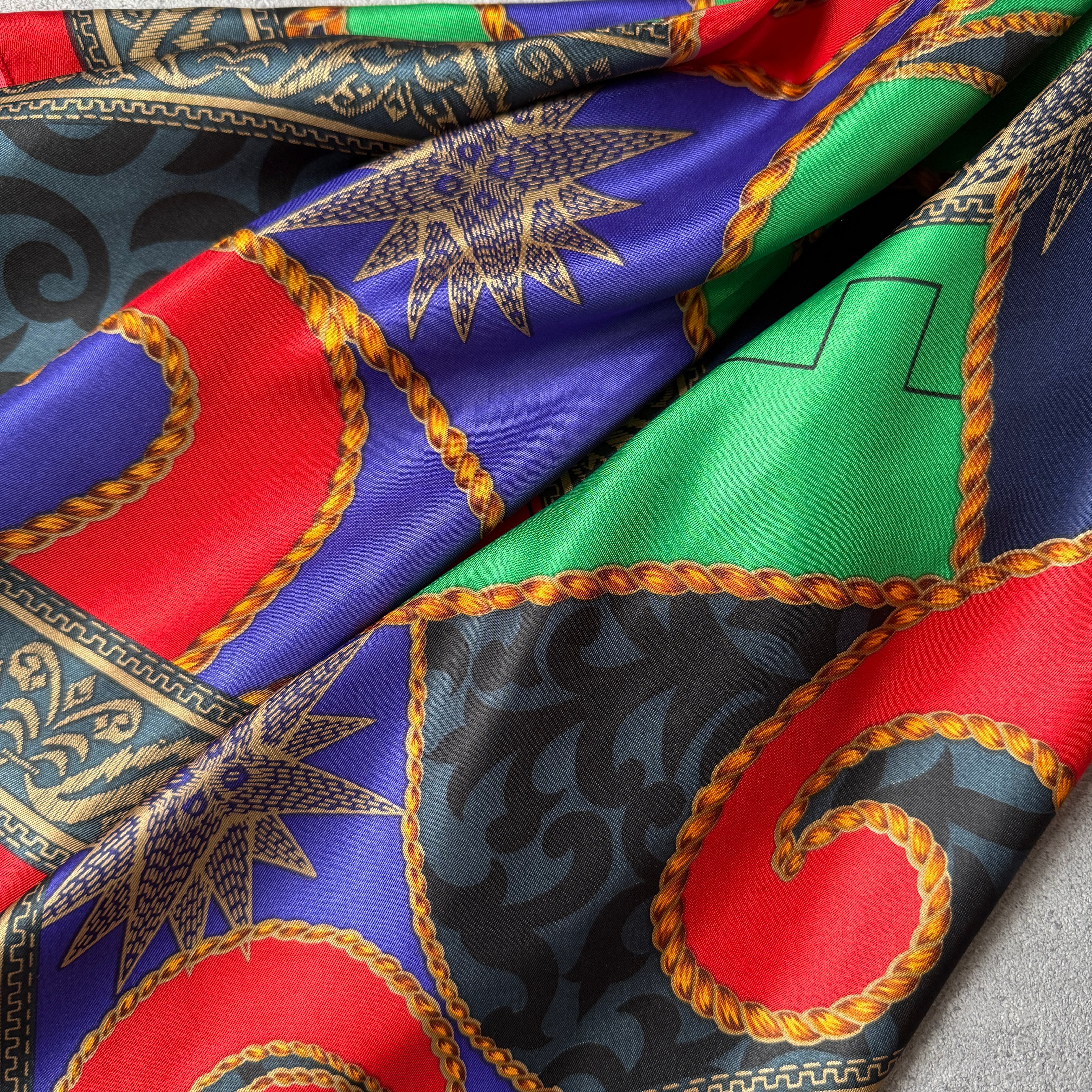 華やかな色彩と曲線が交錯するエキゾチックなデザインが魅力的なスクエアスカーフ。