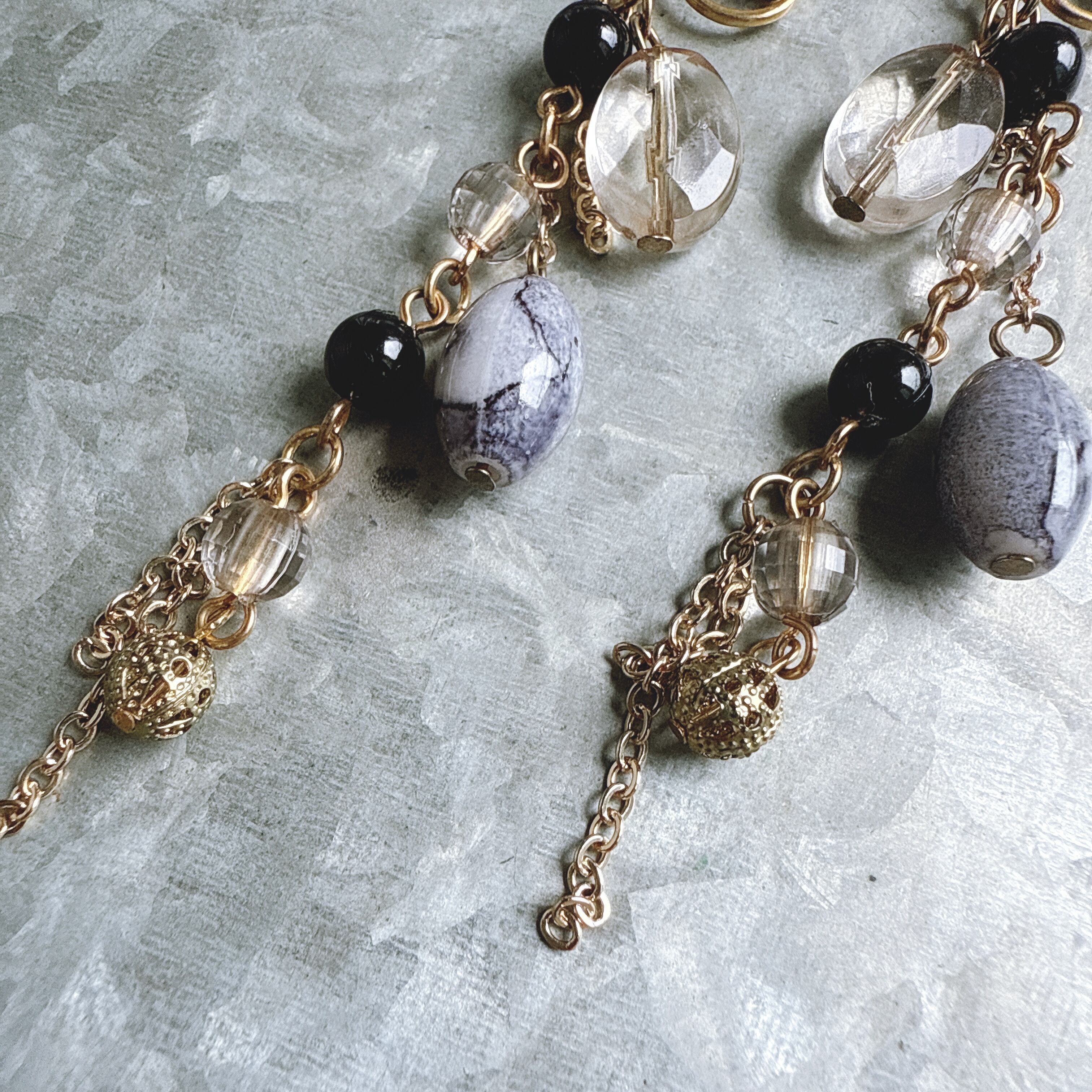 ゴールドトーンのチェーンにマルチデザインのビーズがぶら下がったハンギングイヤリング。