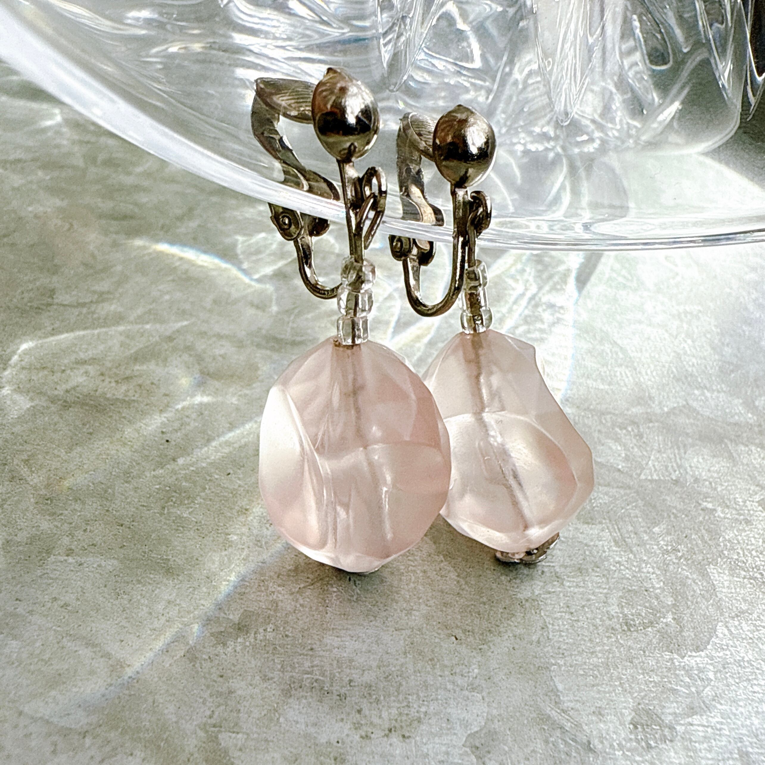 淡いピンクの半透明なビーズハンギングイヤリング。