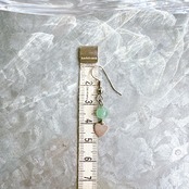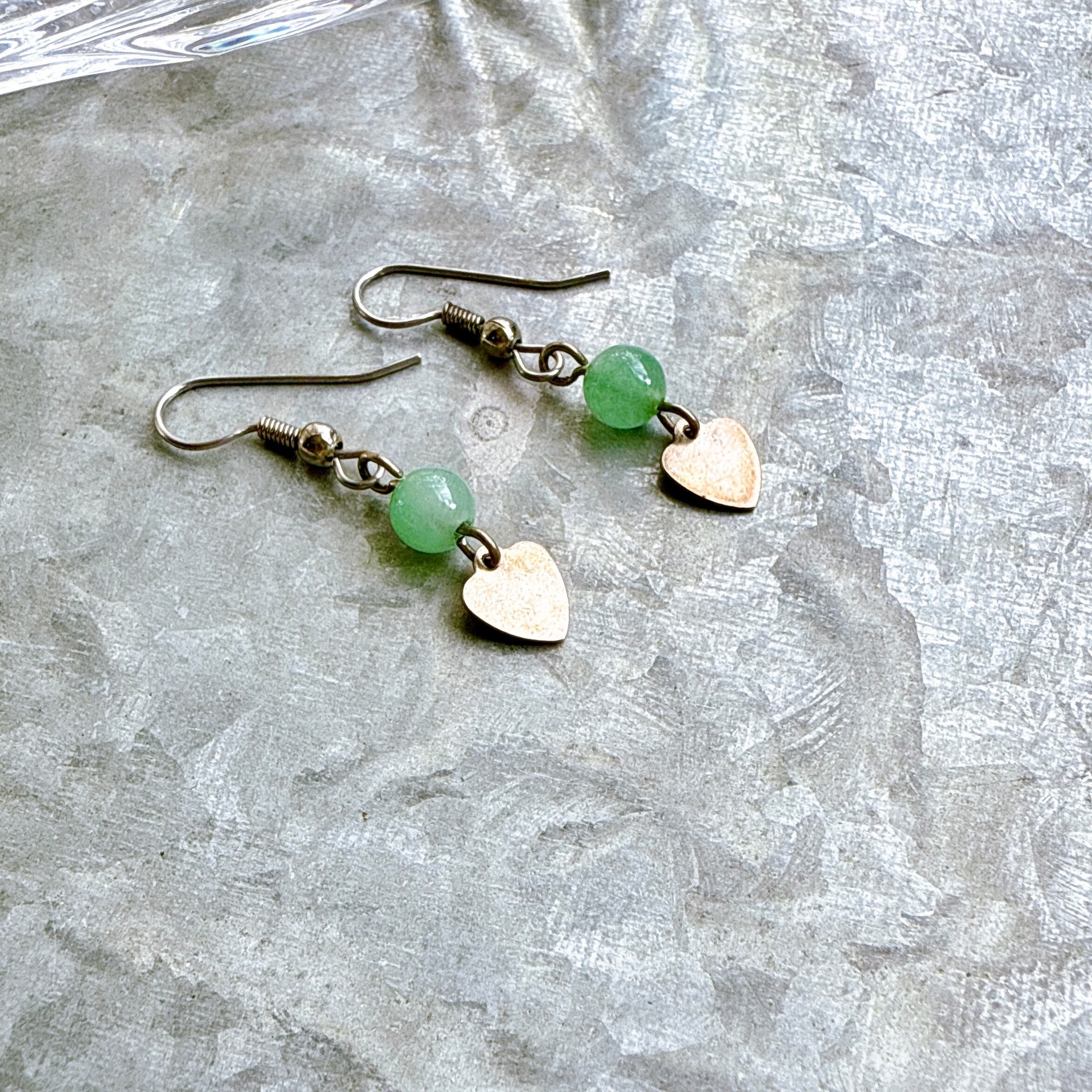 シルバートーンをベースに、セージグリーンのグラスビーズ、ハートプレートがぶら下がるハンギングピアス。
