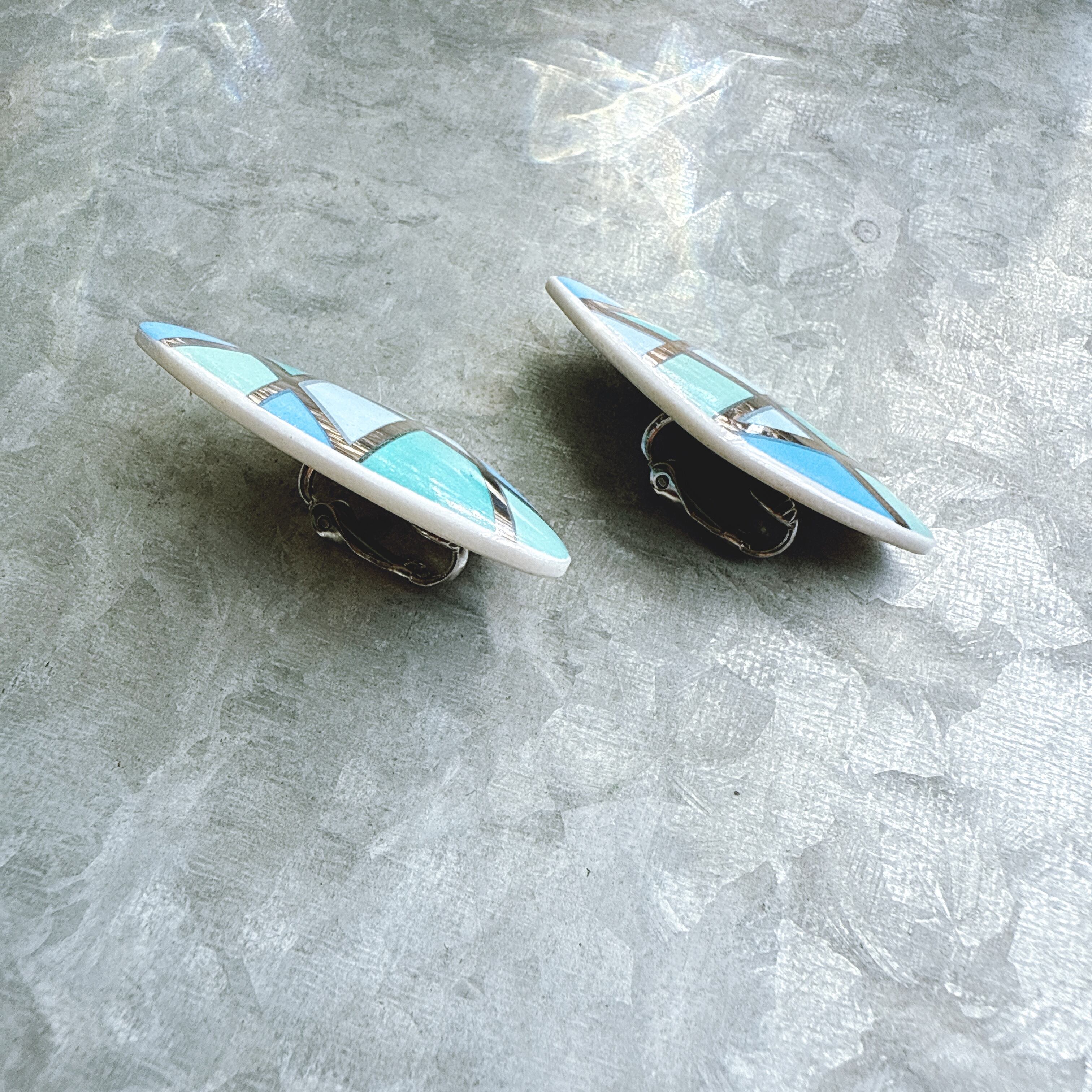 "Shades of Blue Shield Mosaic"とタイトルのついたセラミック製イヤリング。