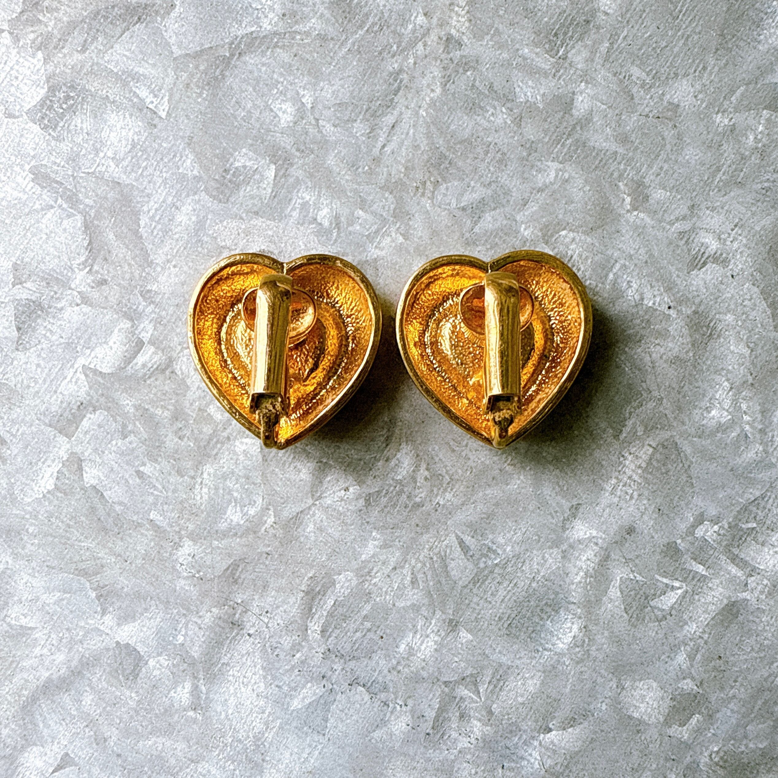深く艶のあるゴールドトーンのハート型フレームが、1980年代の華やかでレトロなムードを演出。