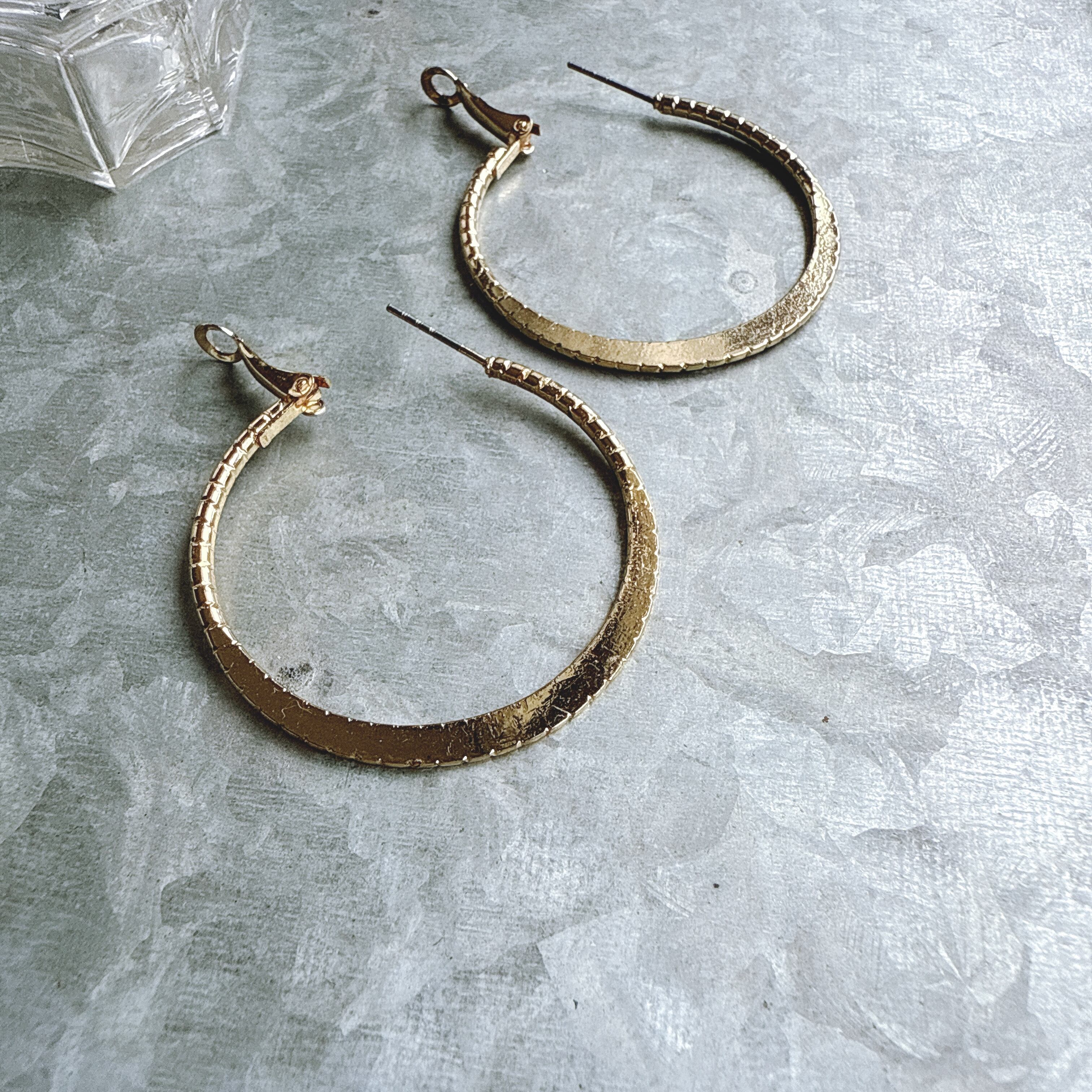 ゴールドトーンのフープピアス。