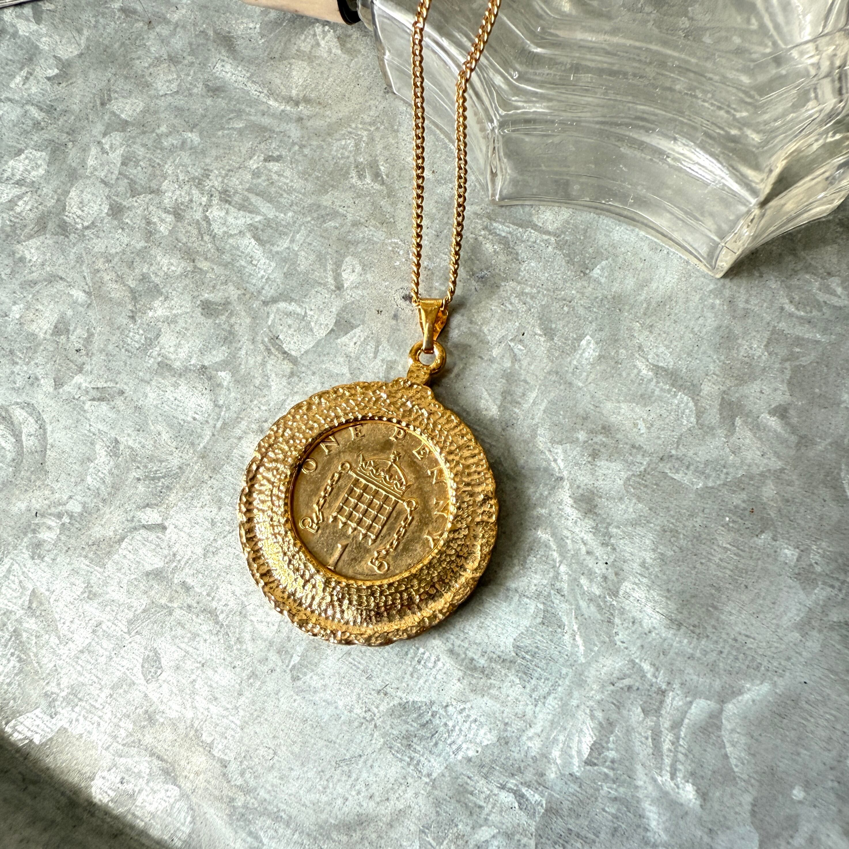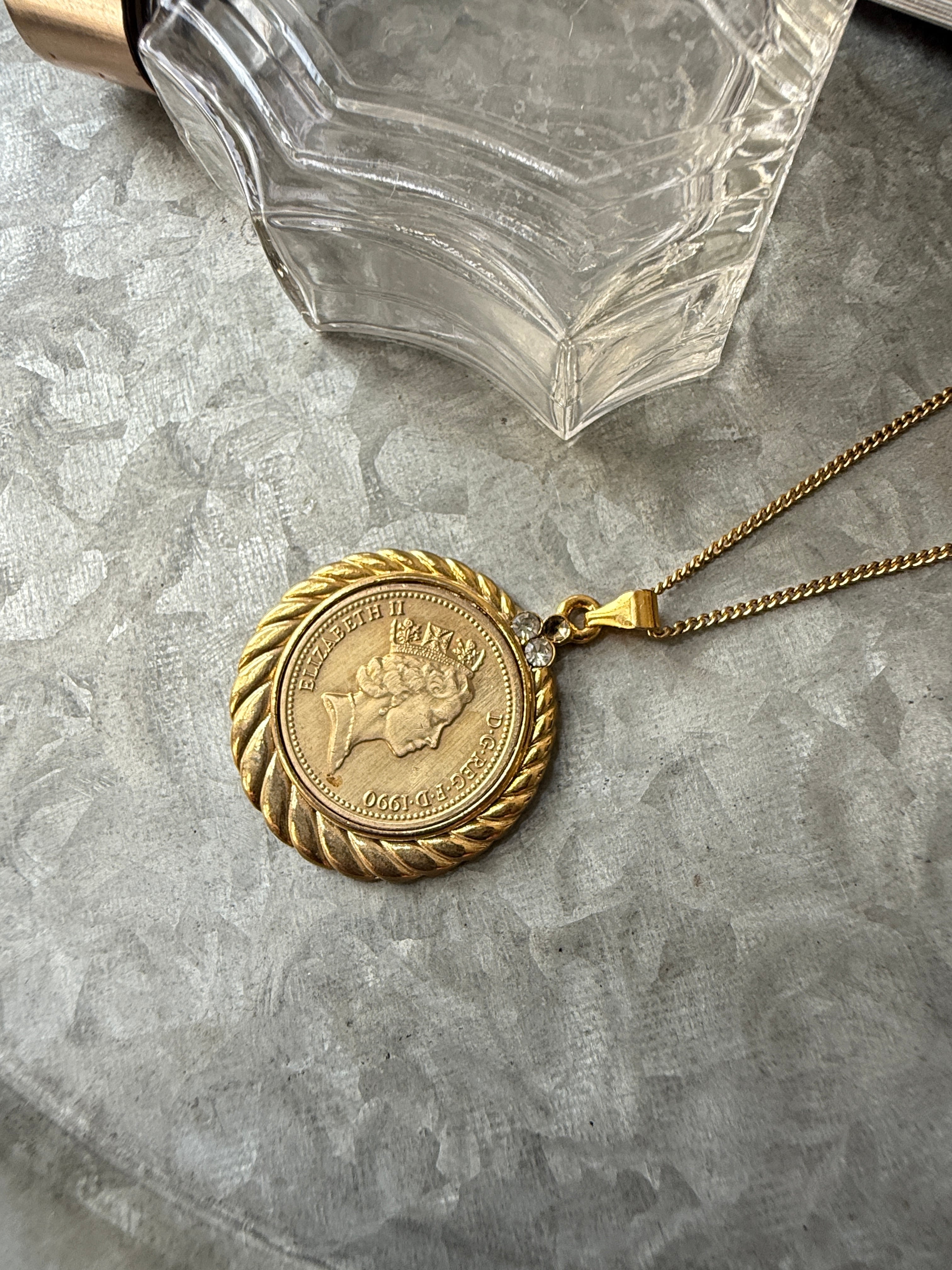 N290-ヴィンテージネックレス・U.S.A. 1980s Queen Elizabeth II One Penny Coin Charm Gold Tone Necklace | eslup_boutique
