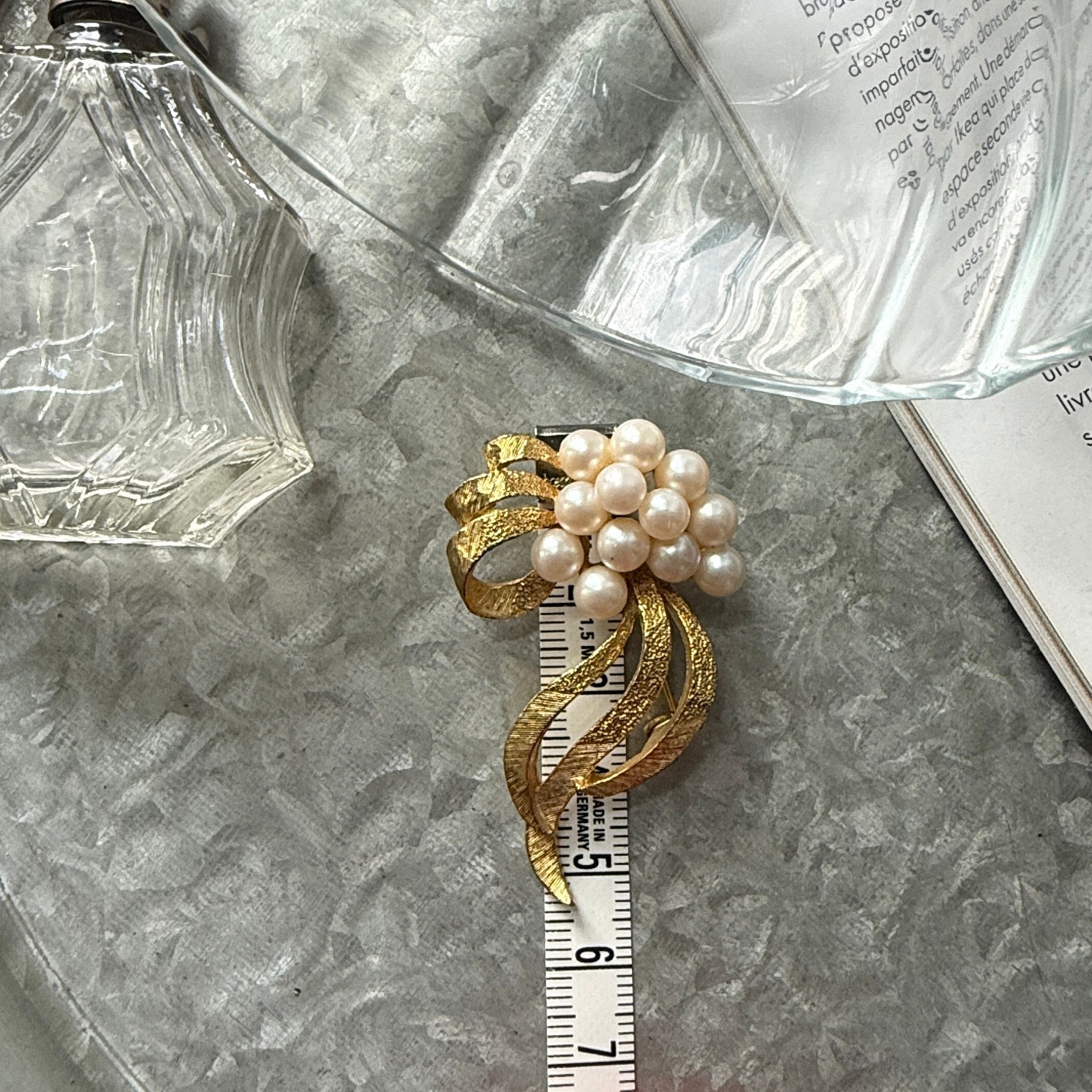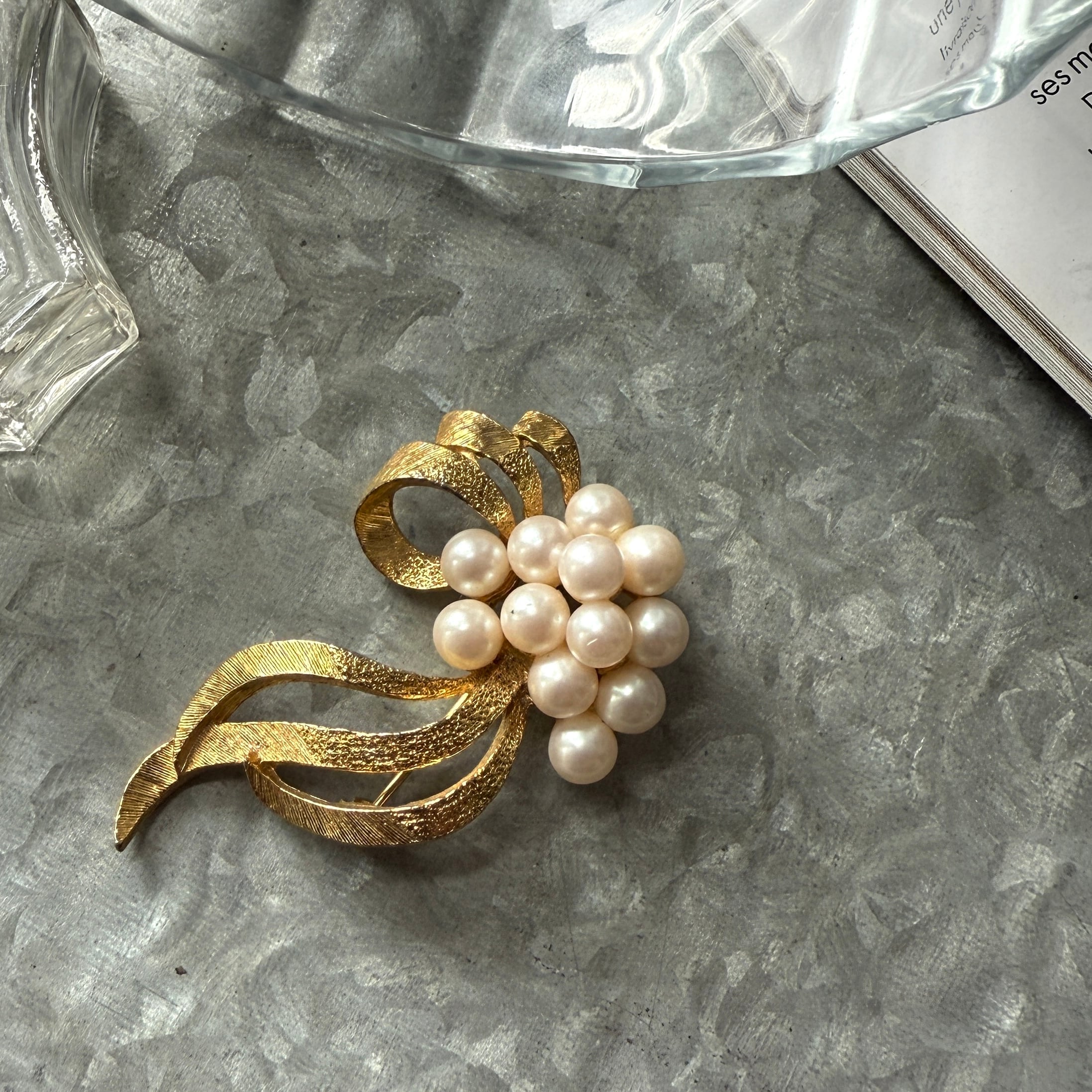 花束をモチーフにしたフェイクパールとゴールドトーンブローチ。