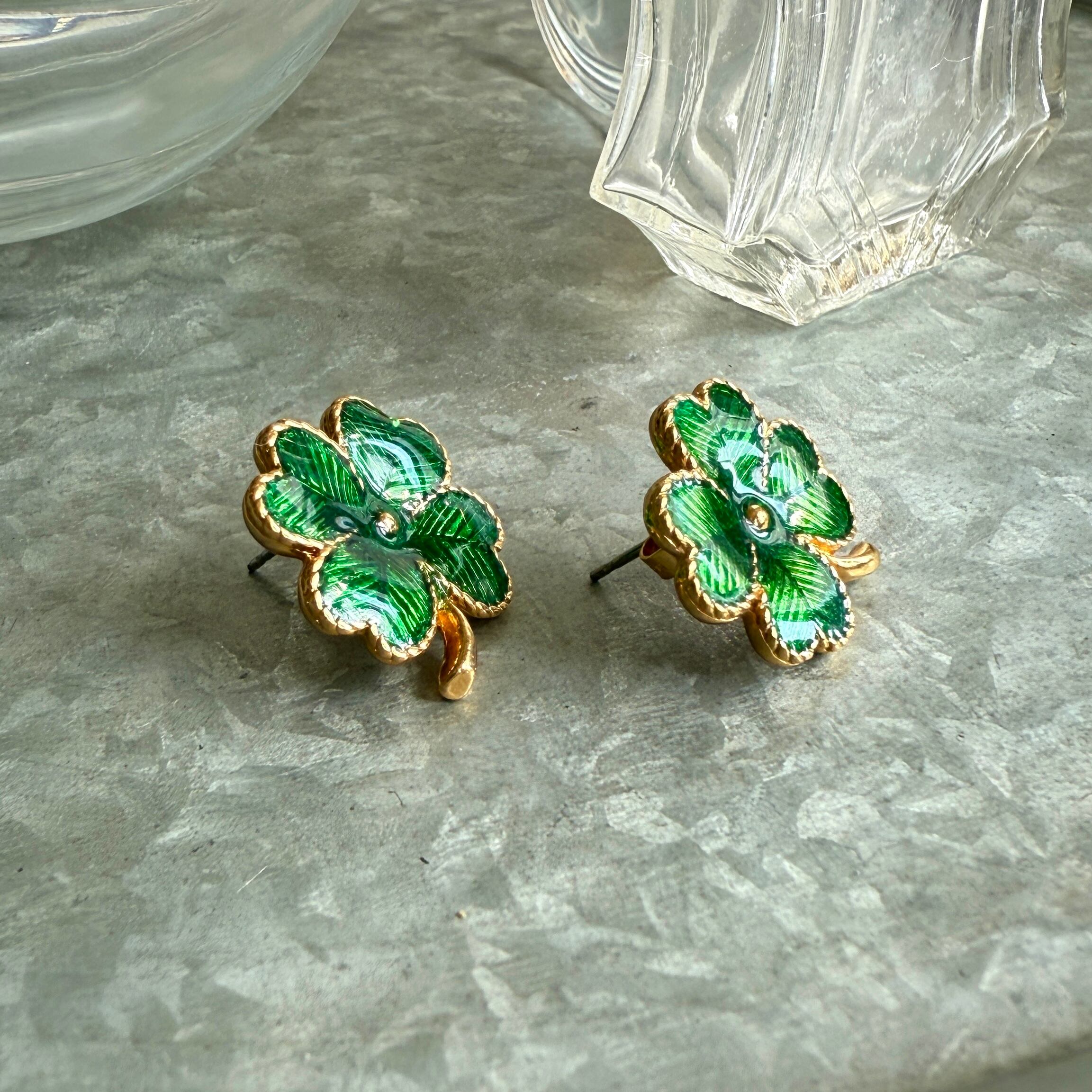 ゴールドトーンをベースに、グリーンエナメルペイントされたラッキークローバーピアス。