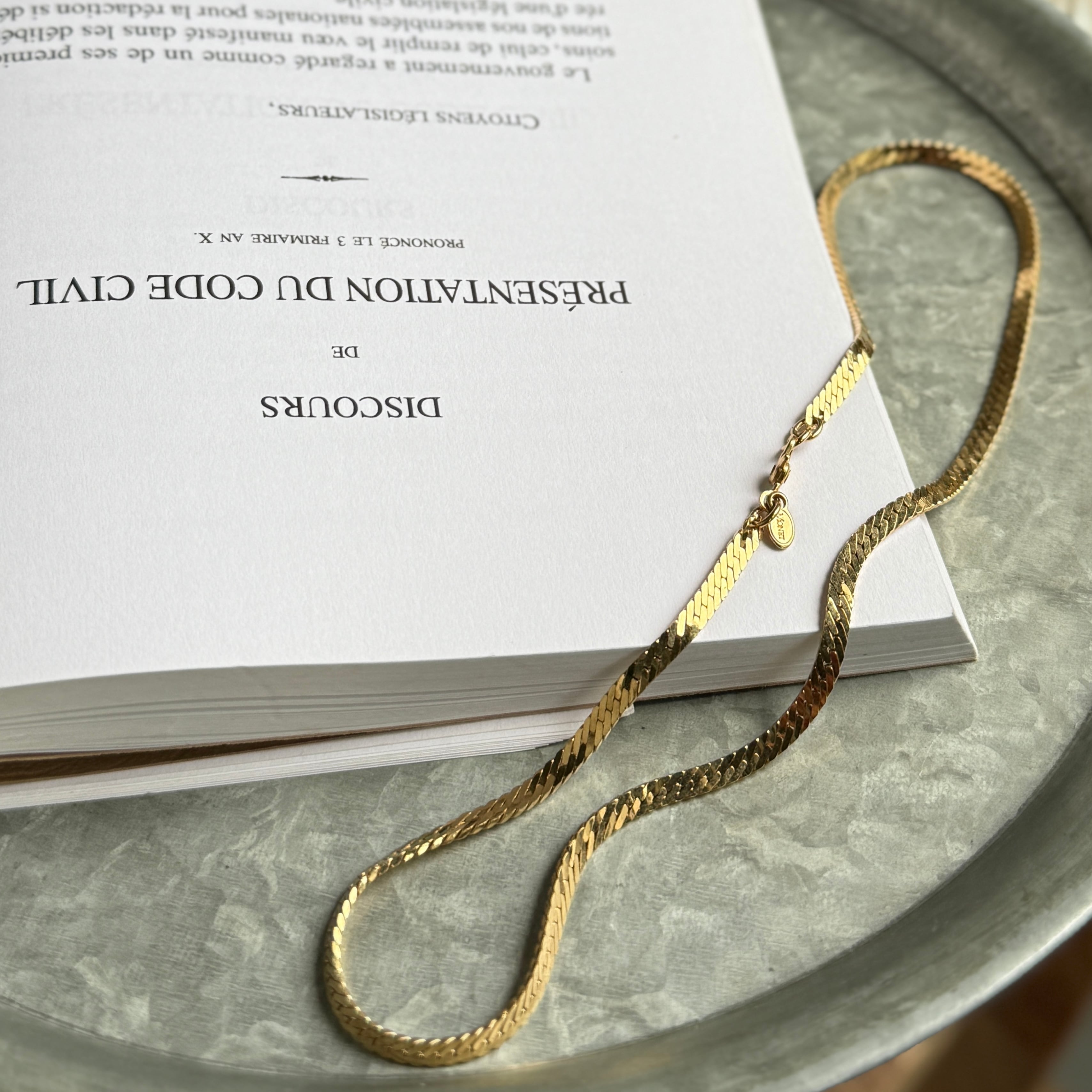 ゴールドトーンのフラットチェーンネックレス。
