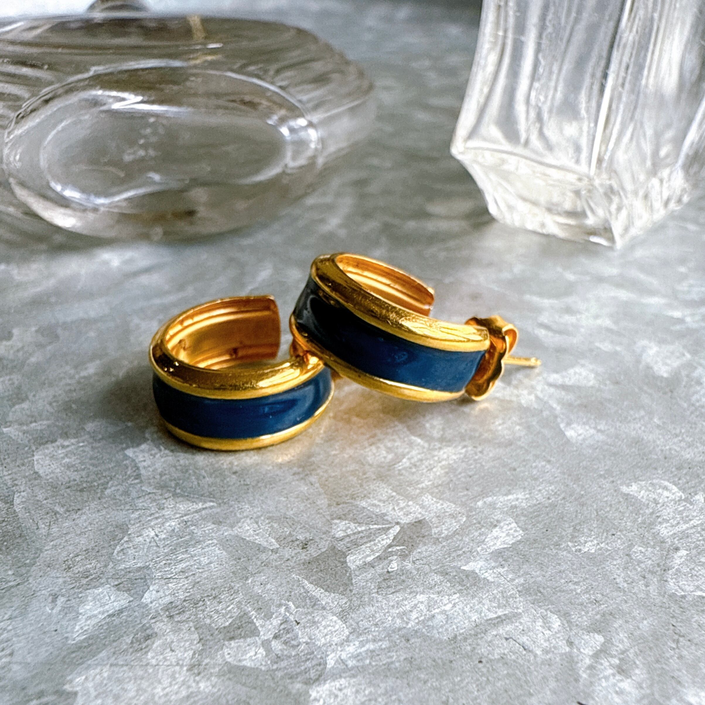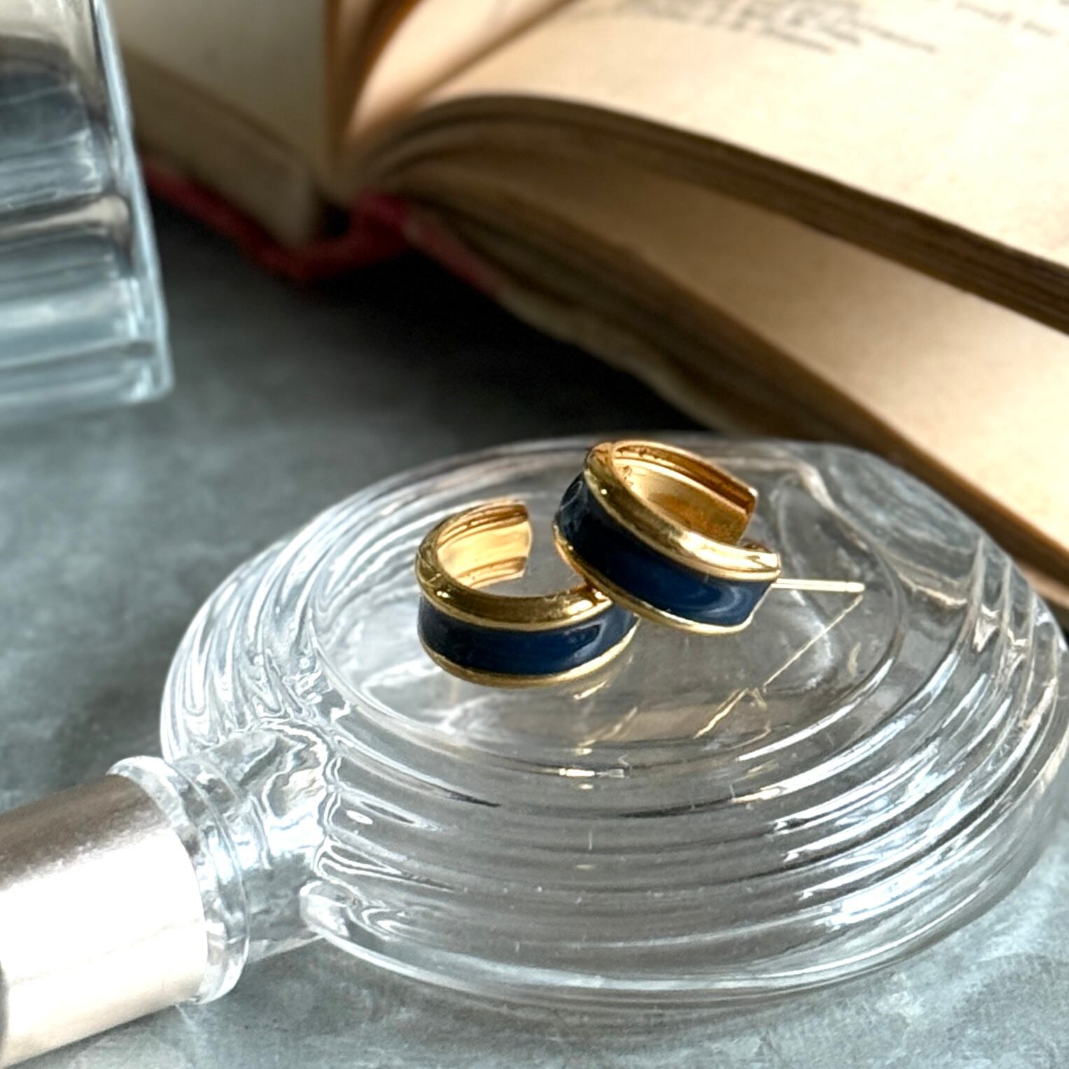 P715-ヴィンテージピアス U.S.A. 1970〜80s " Simply Whispers " Gold Tone Navy Enamel Paint Hoop Pierced Earrings