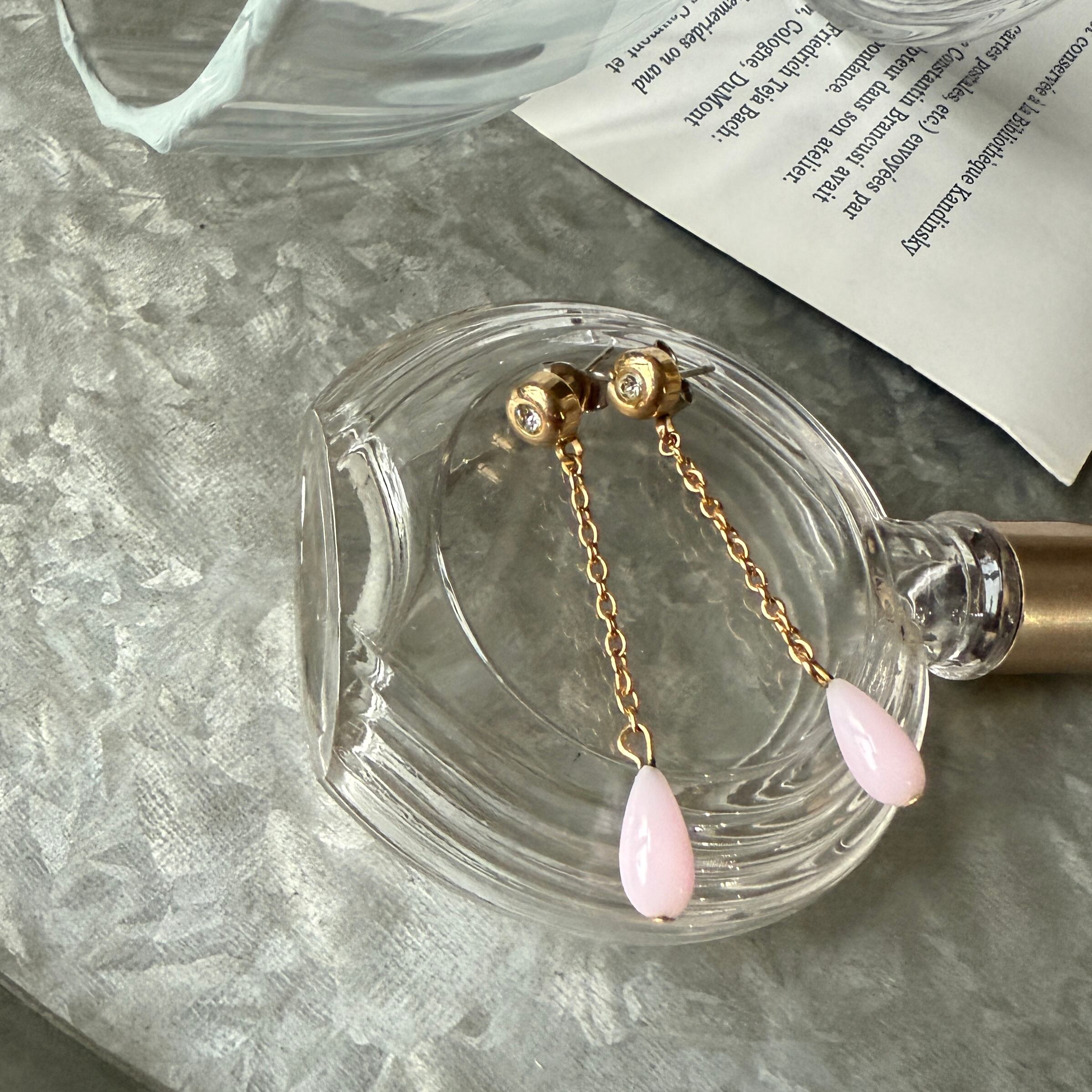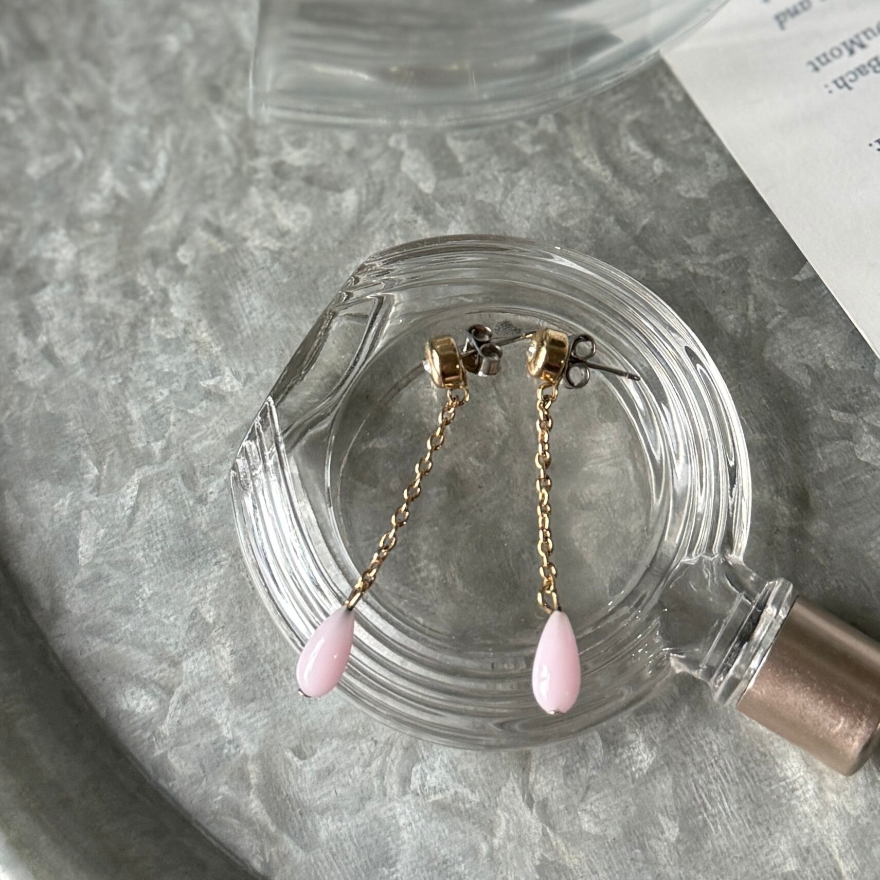 ペールピンクのドロップビーズがぶら下がる、ゴールドトーンダングルピアス。