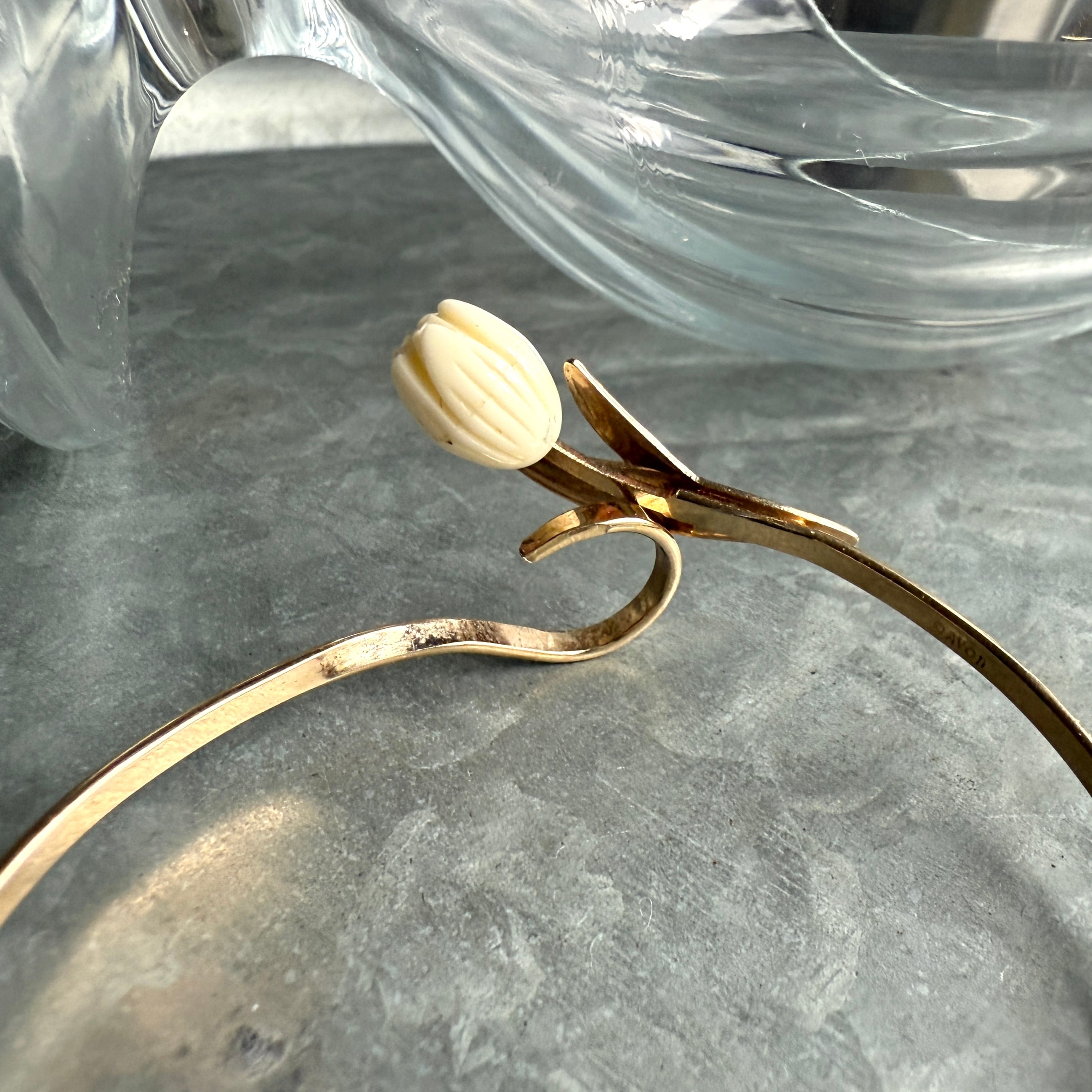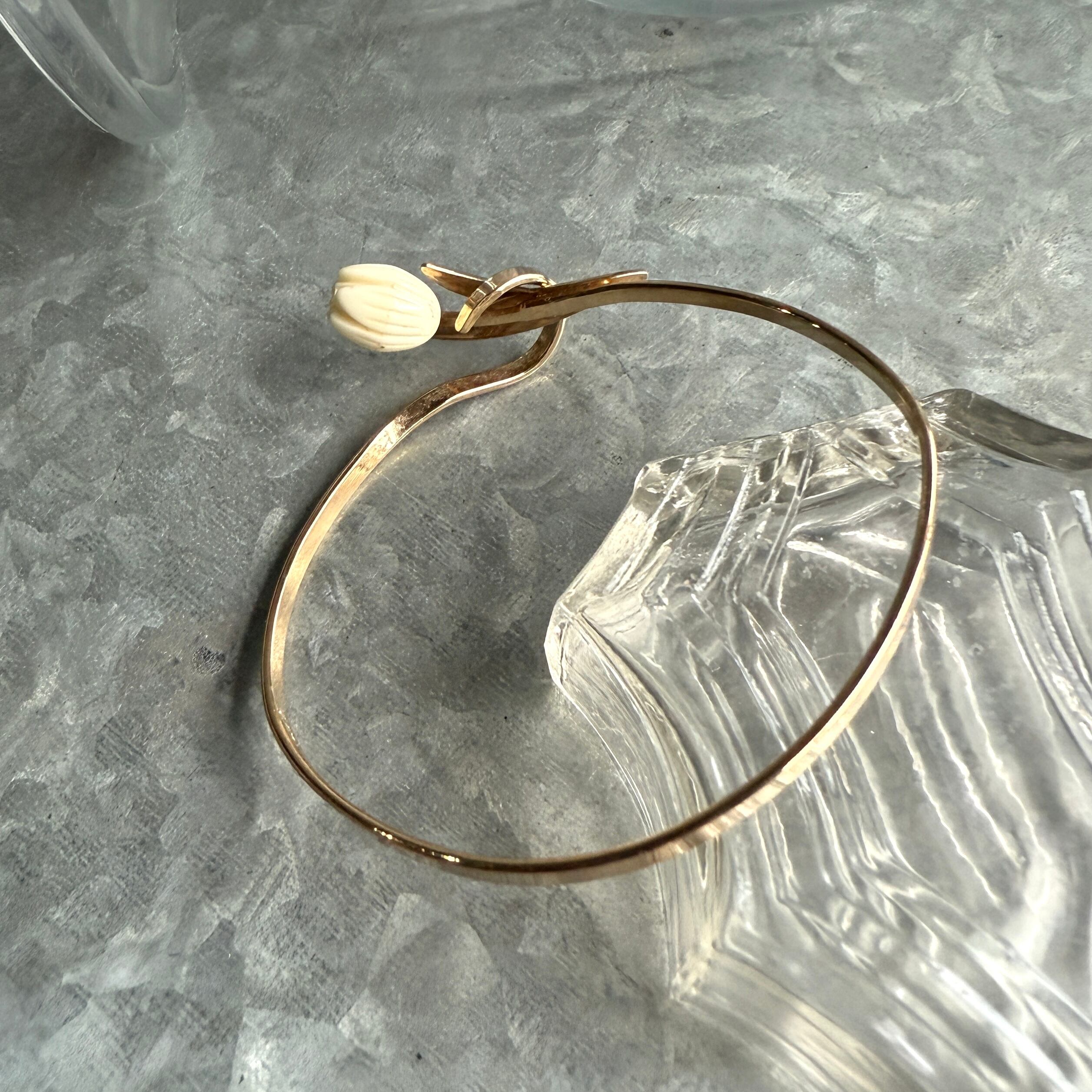 チューリップが可憐な、ゴールドトーンブレスレット。艶めくテクスチャーと、曲線的なチューリップのリーフを表現したゴールドトーン。