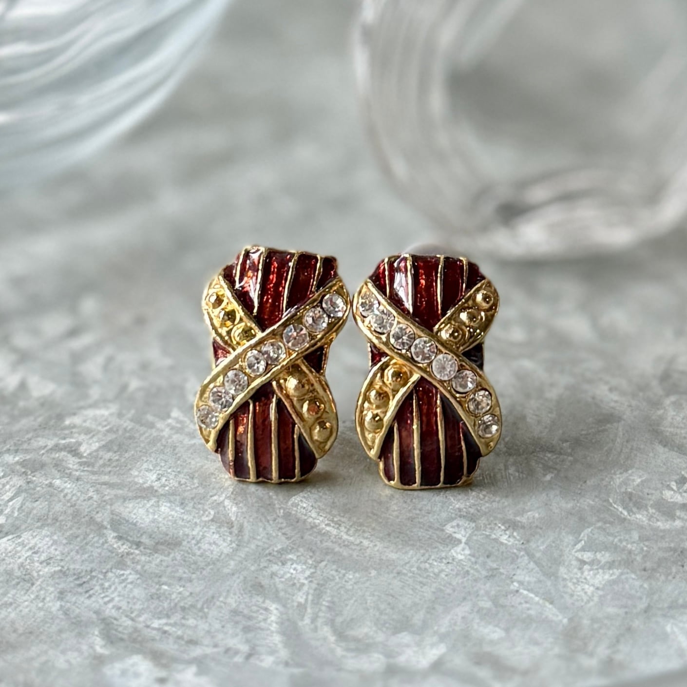 ブラウンのエナメルペイントと、ラインストーンが煌めくゴールドトーンクリップイヤリング。