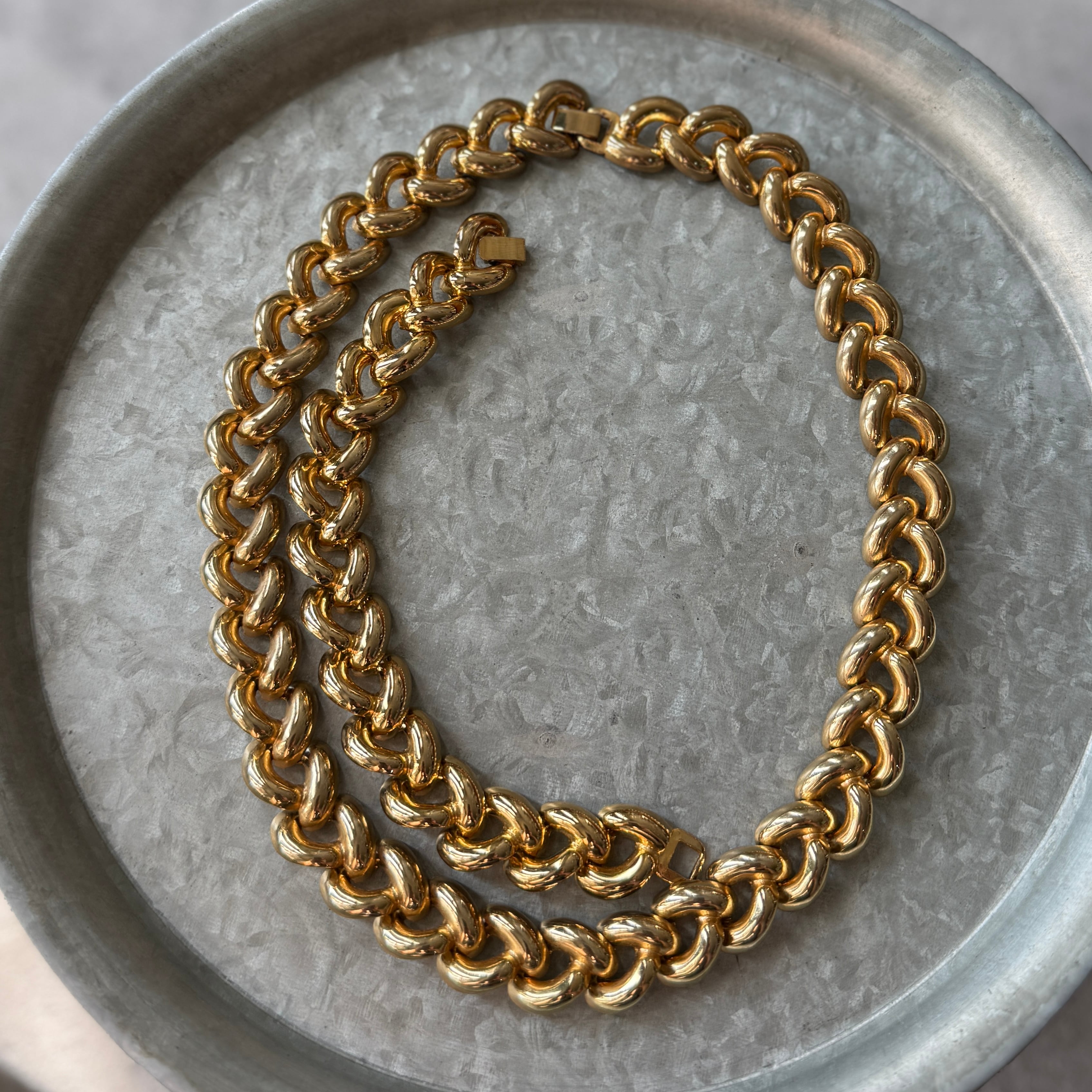 艶のあるテクスチャーで、ハート型のように三つ編みデザインのリンクチェーン。