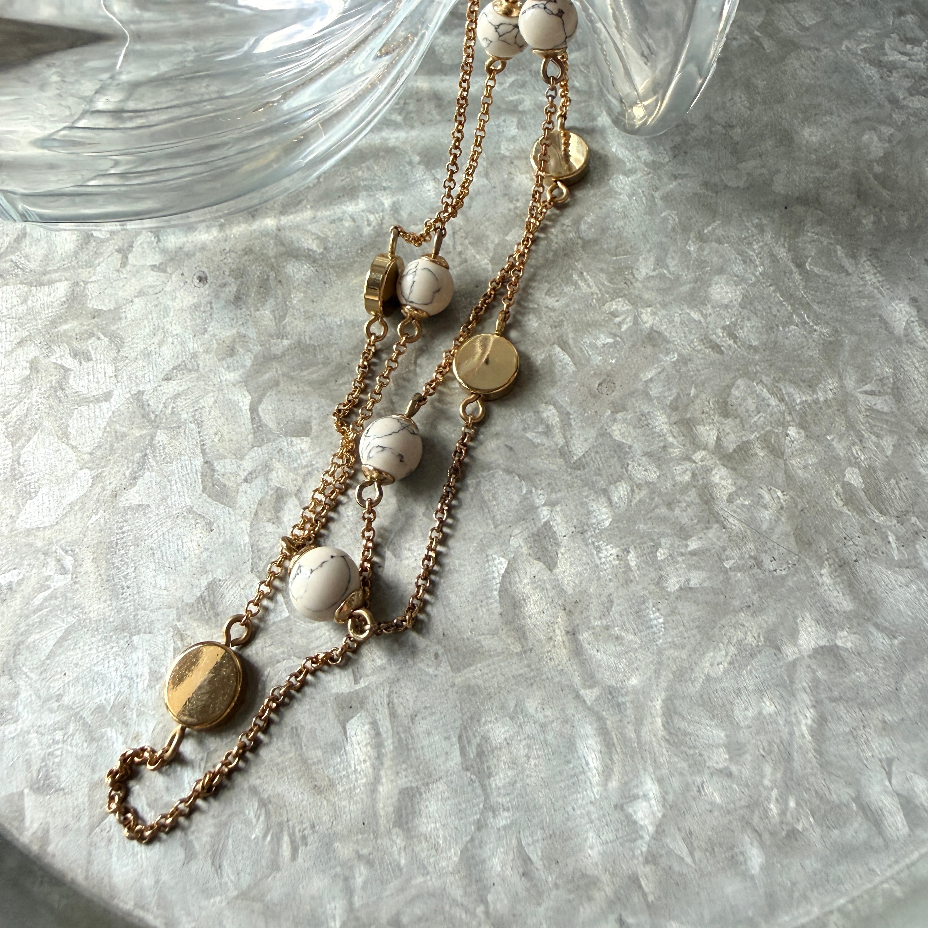 ホワイトマーブルストーンビーズがアクセントになった、ゴールドトーンダブルネックレス。