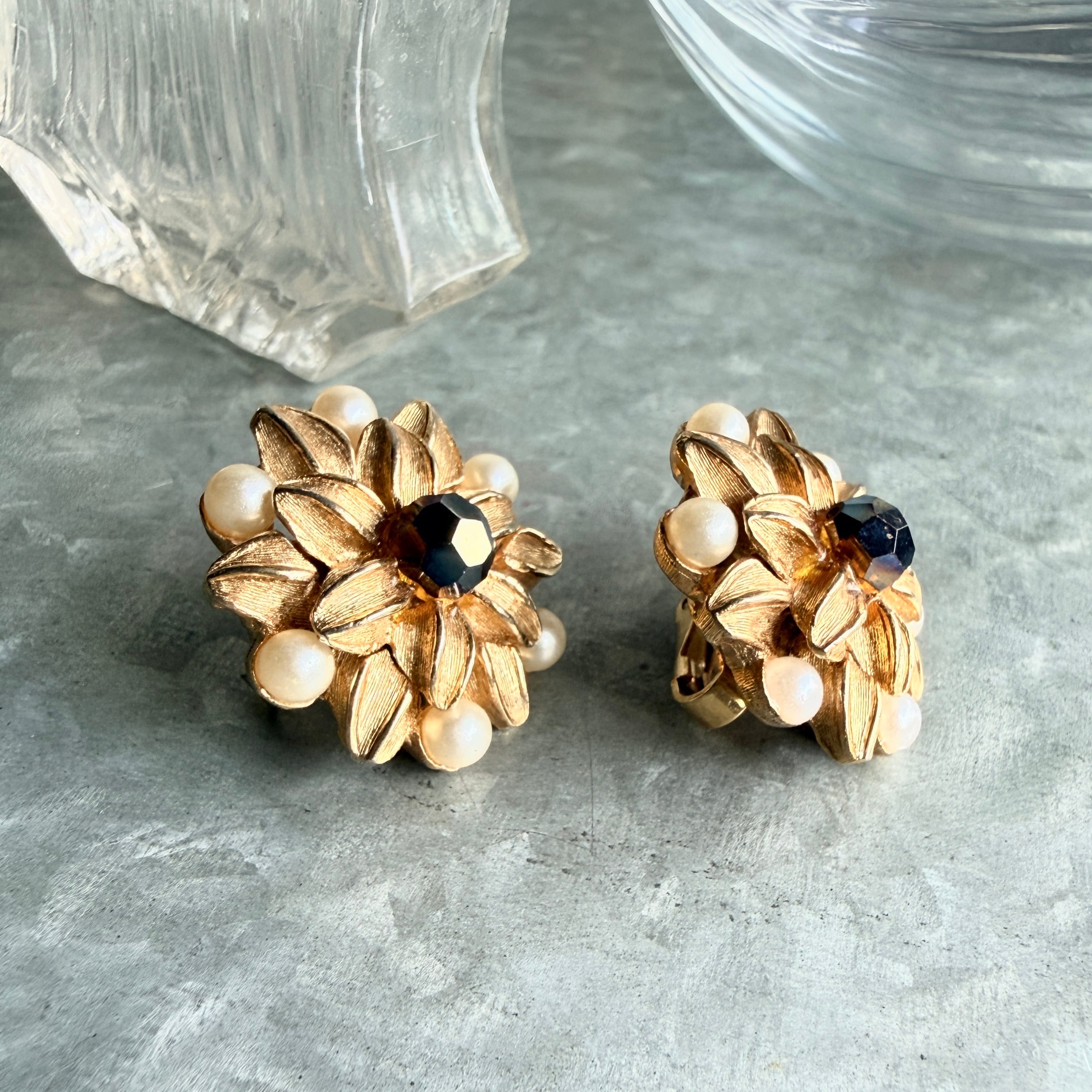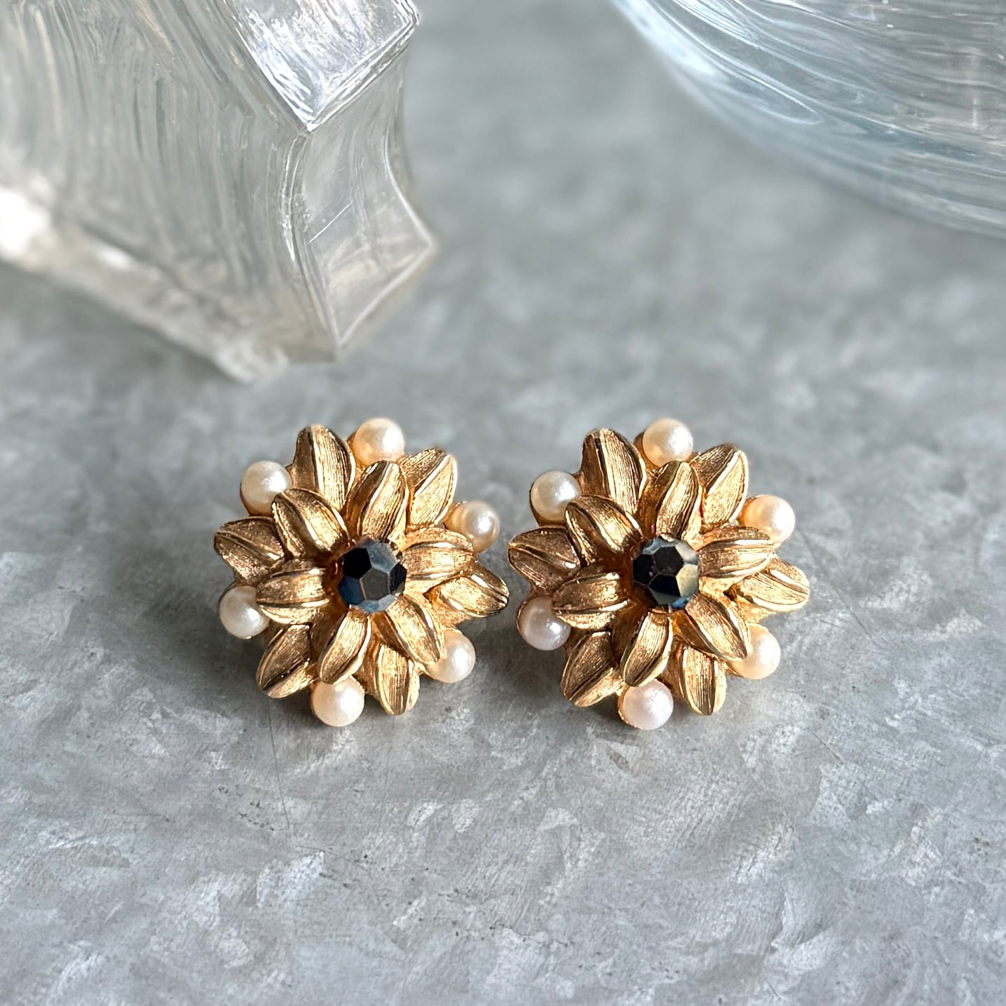 YT54-【 Crown TRIFARI 】クラウントリファリ・ヴィンテージイリング 1950's Faux Pearl Rhinestone Flower Earrings | eslup_boutique