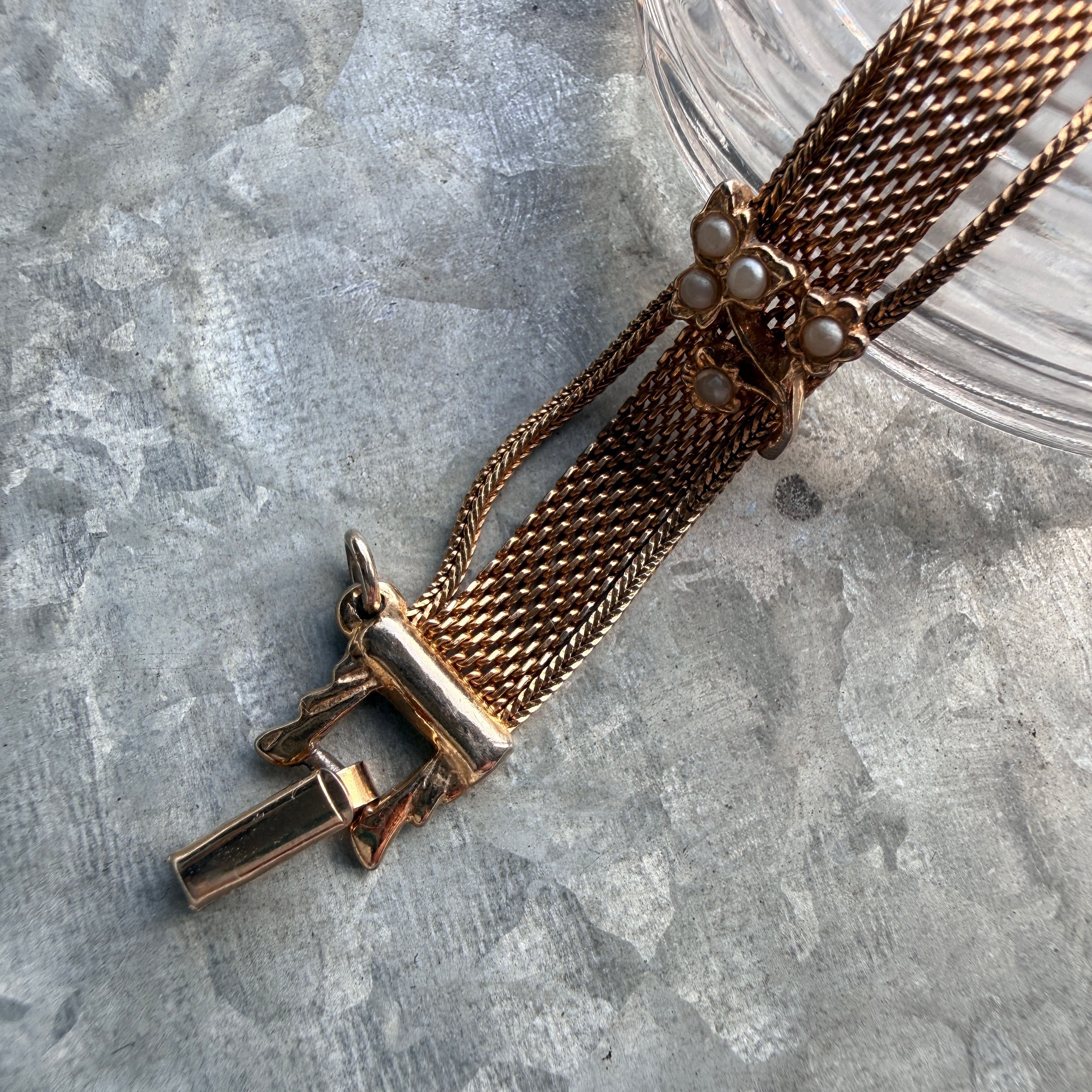 しなやかさのある細かなメッシュベルトに、フェイクパールの小花が品よく並ぶ、レトロで上品なブレスレット。