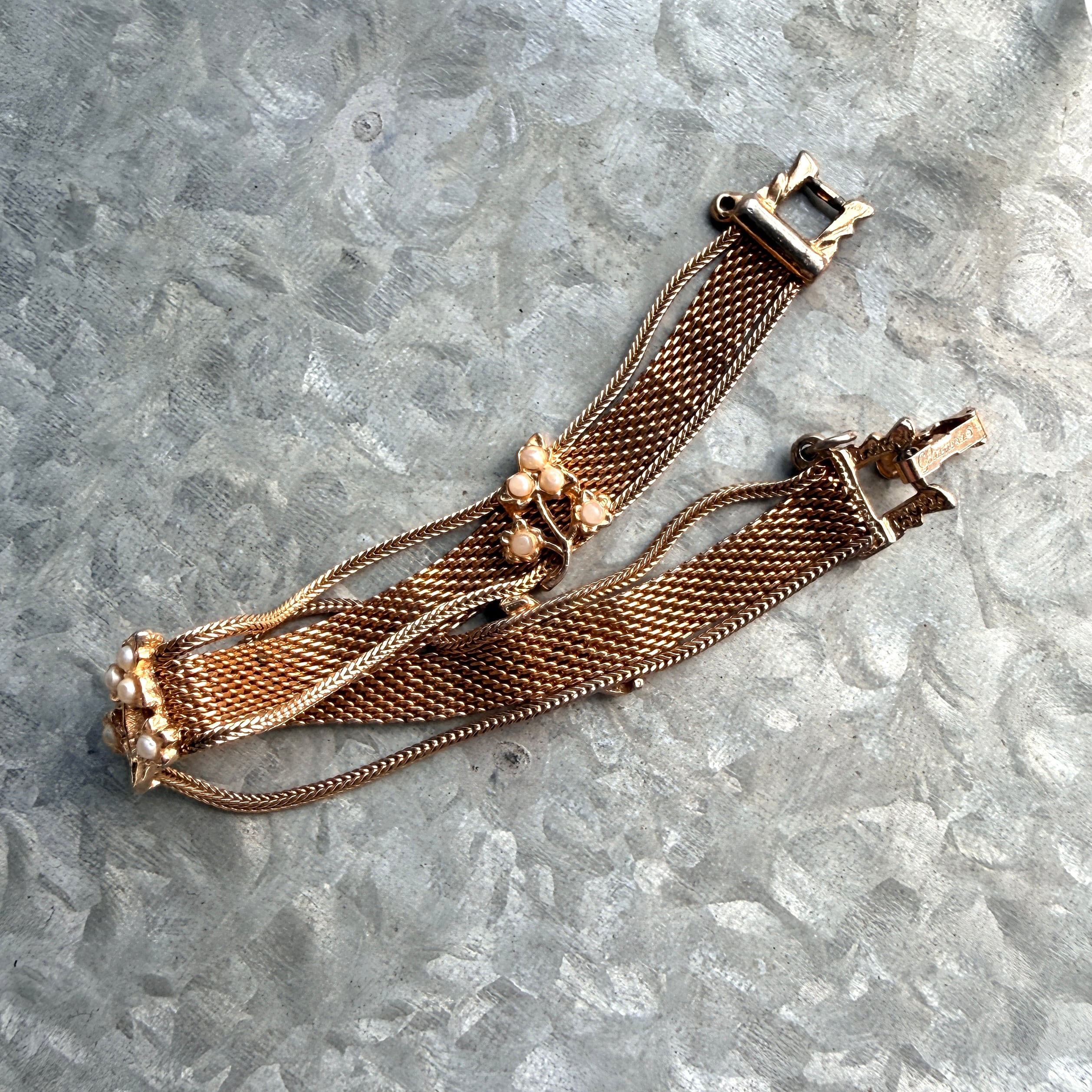 B174-【 Goldette 】ゴールデット・ヴィンテージブレスレット U.S.A. 1960's Gold Tone Mesh Pearl Flower Bracelet | eslup_boutique