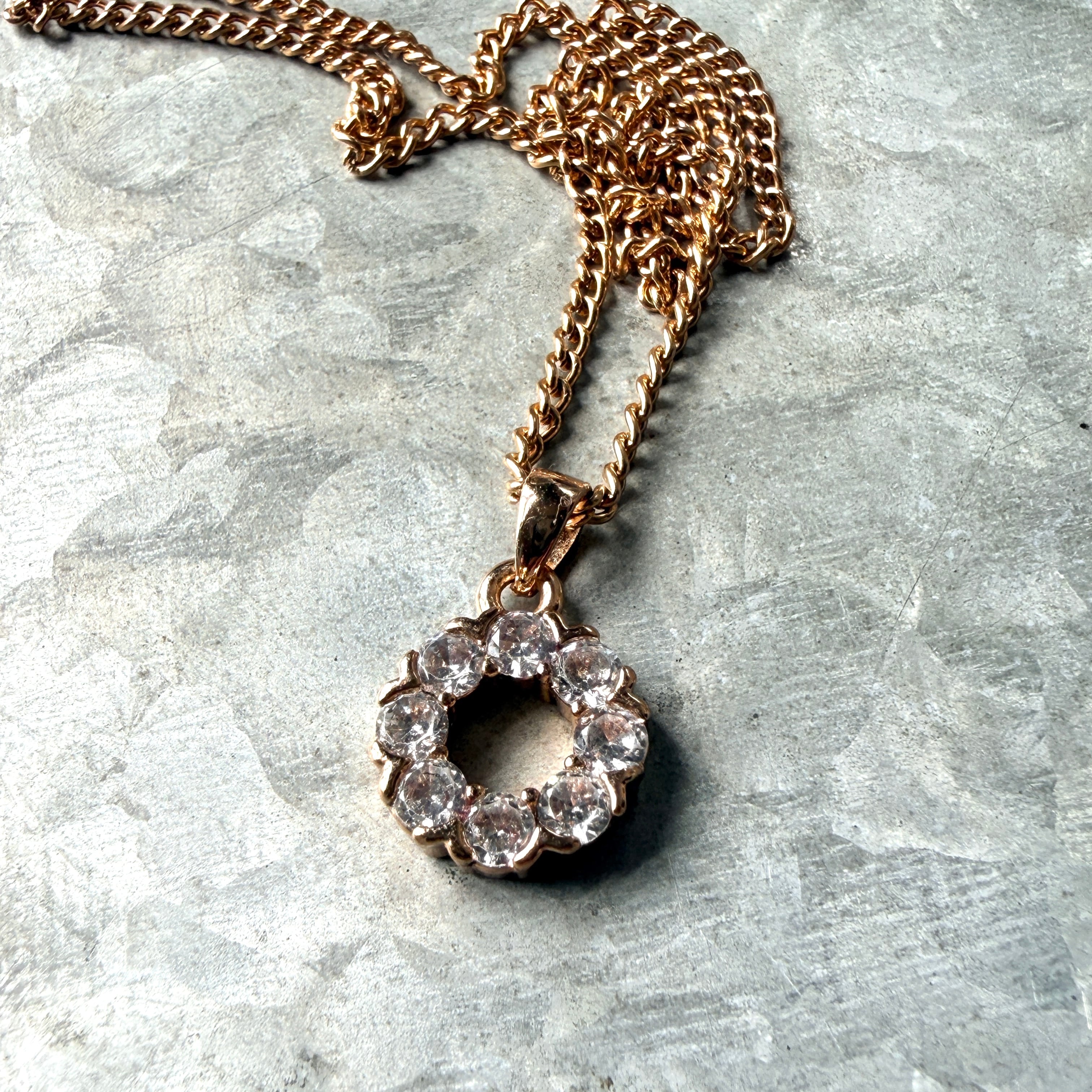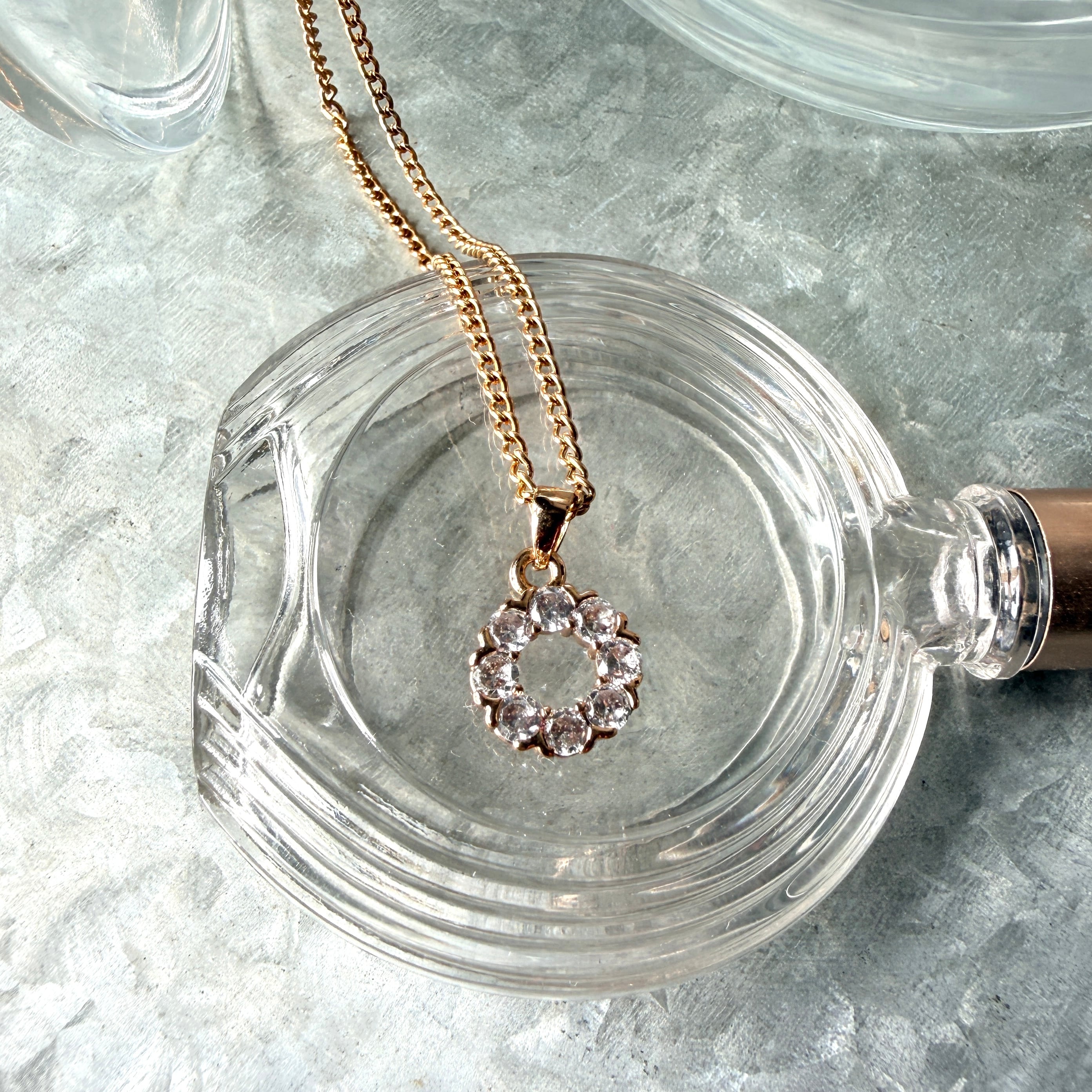 クリアなラインストーンが煌めくゴールドトーンフープペンダントネックレス。