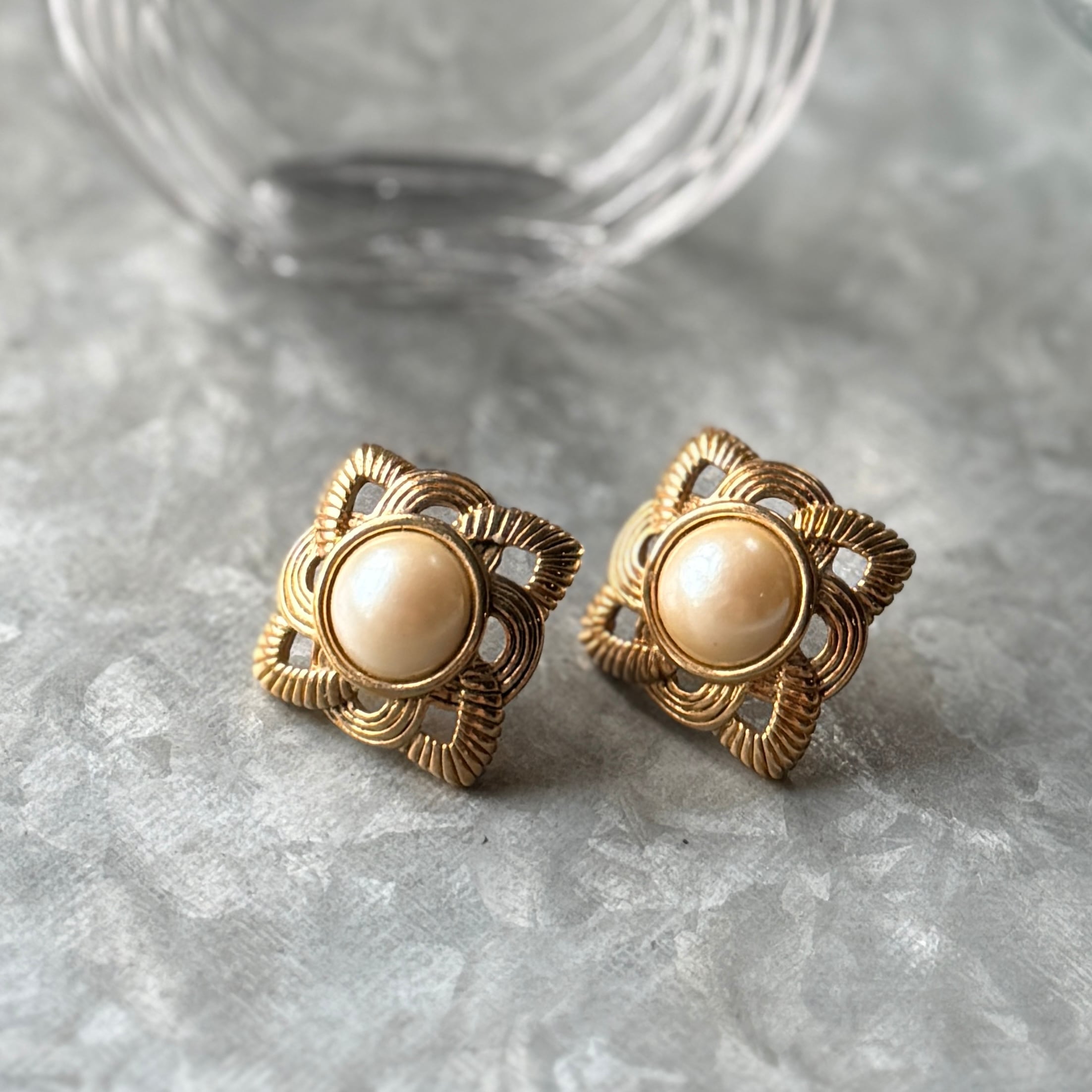 PA429-【 AVON 】エイボン・ヴィンテージピアス 1987 " Parisian Impression " Gold Tone Square Openwork Fake Pearls Pierced Earrings | eslup_boutique