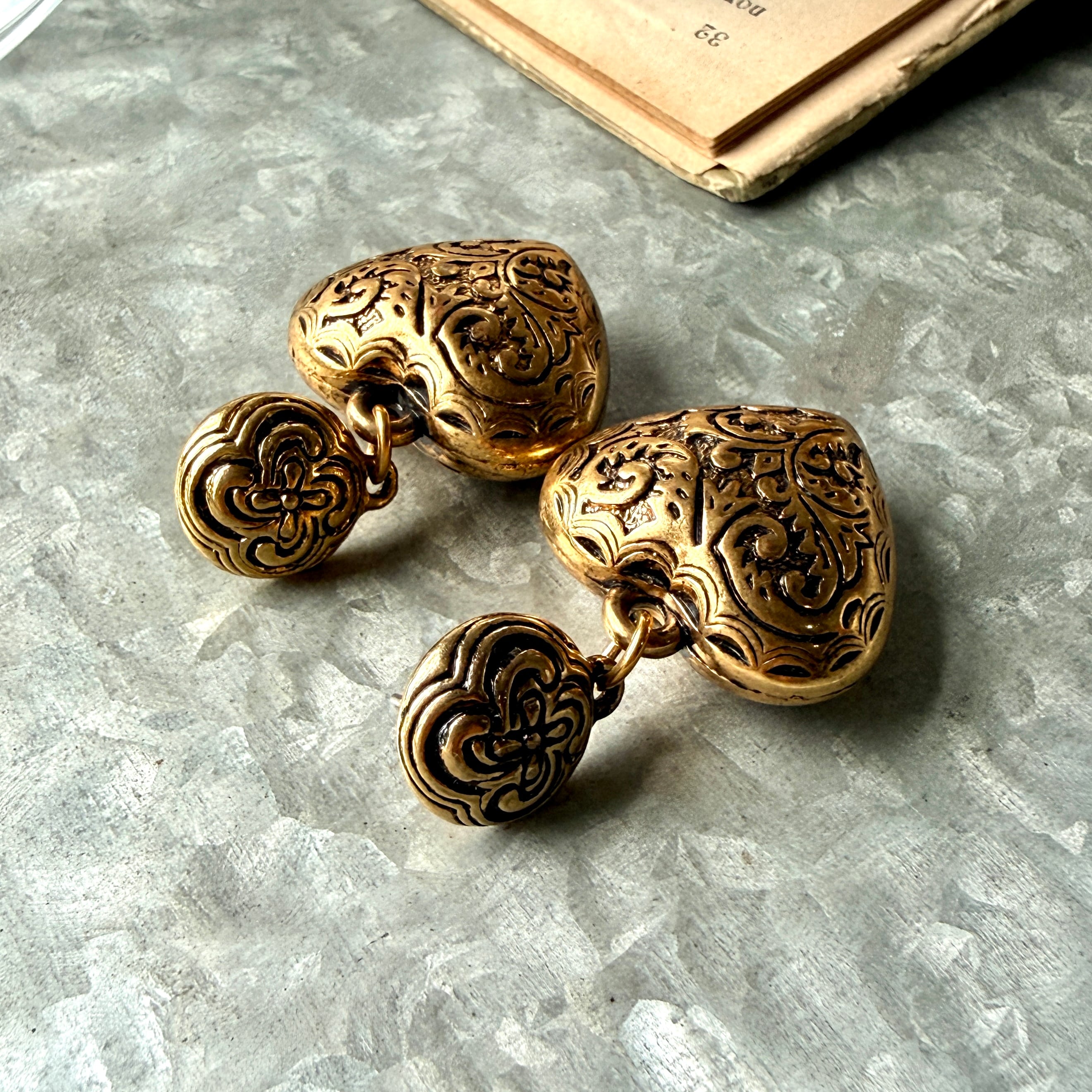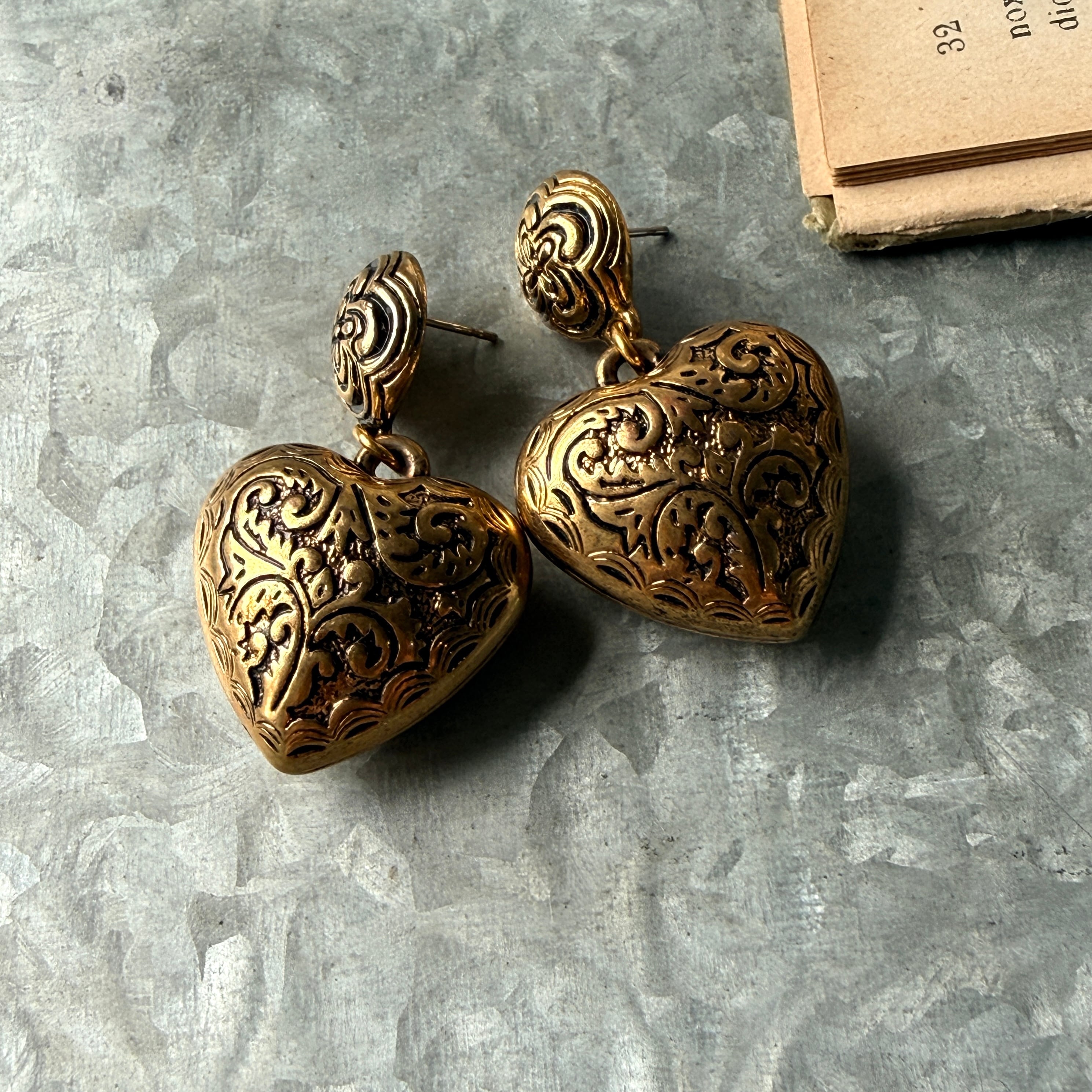 " Etched Heart " とタイトルが付いた、ゴールドトーンのハートダングルピアス。