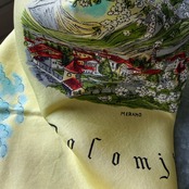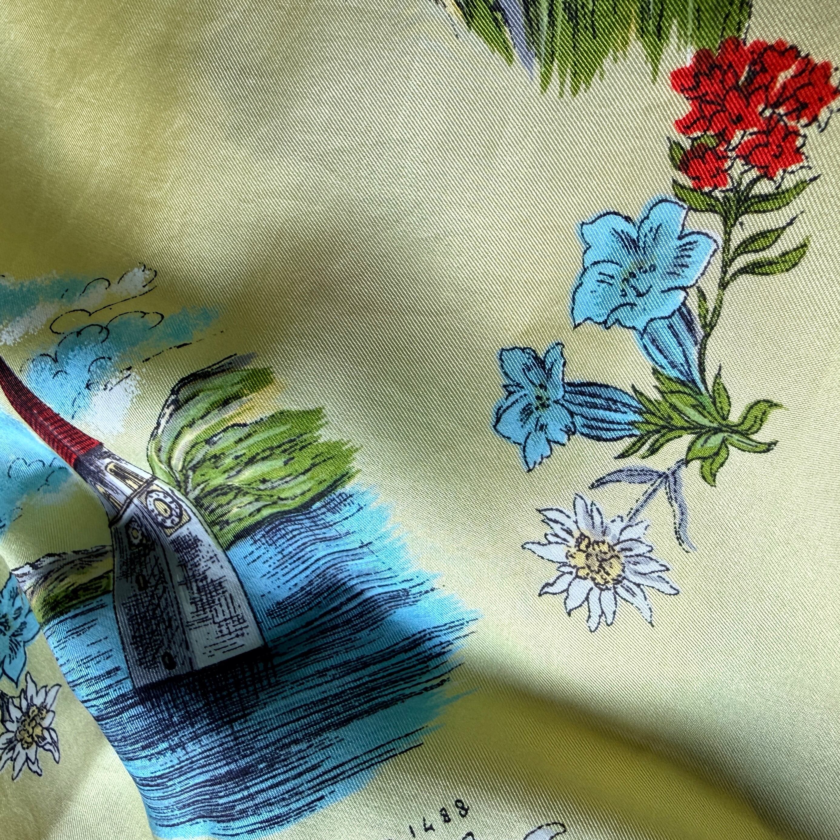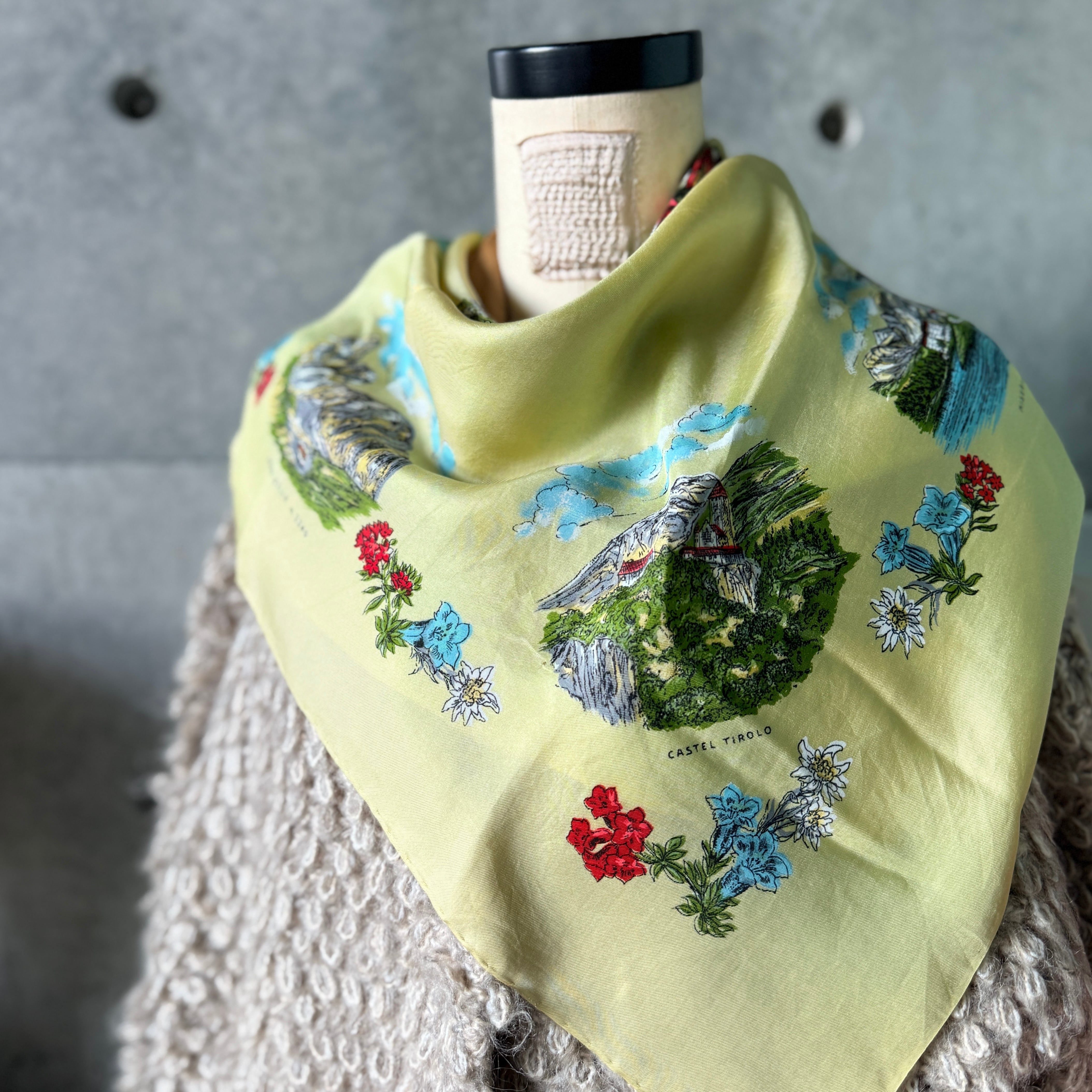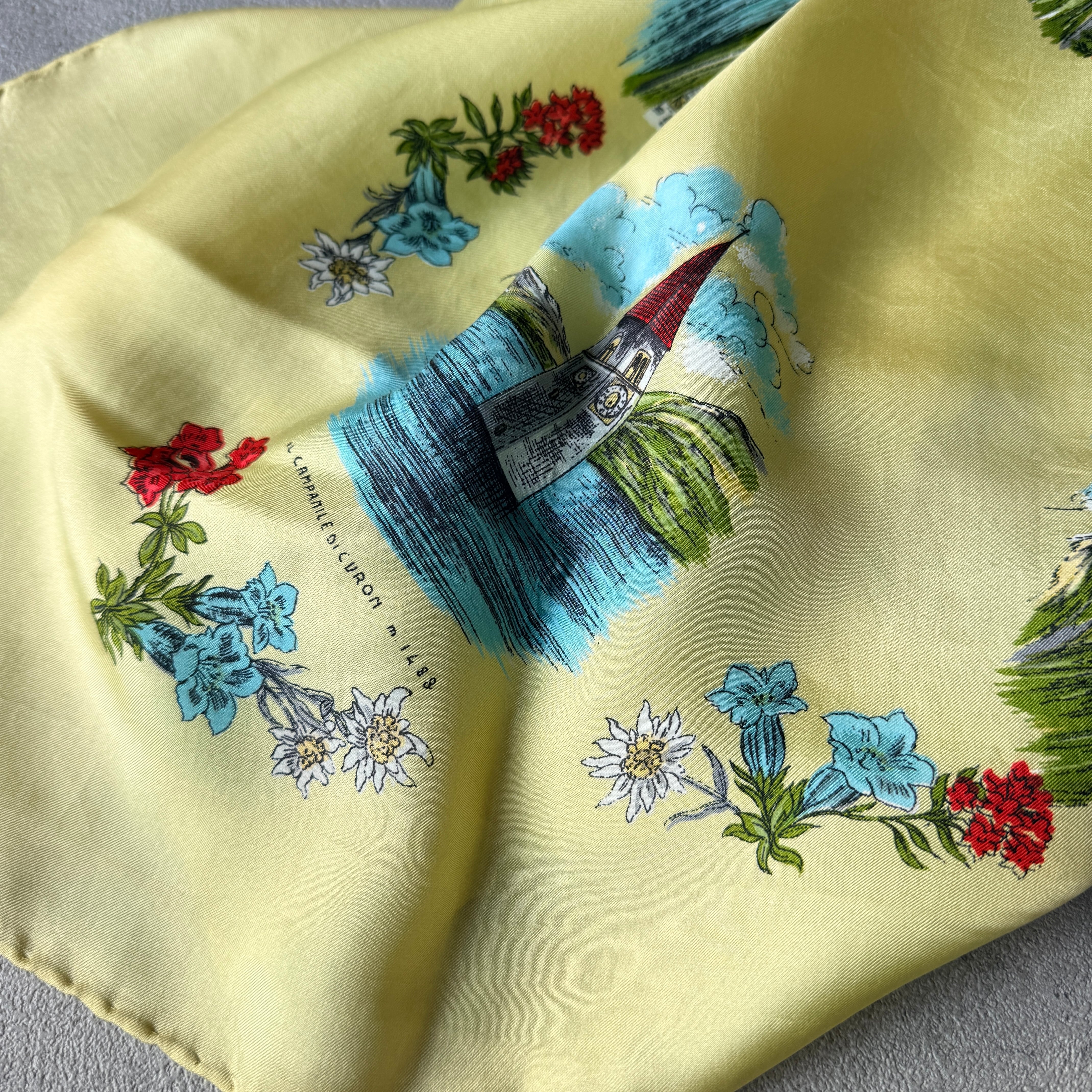 イタリアの観光地ドロミテを描くレトロなプリント。柔らかなイエローベースに、カラフルに街とフローラルが描かれ、レトロな雰囲気たっぷりです。