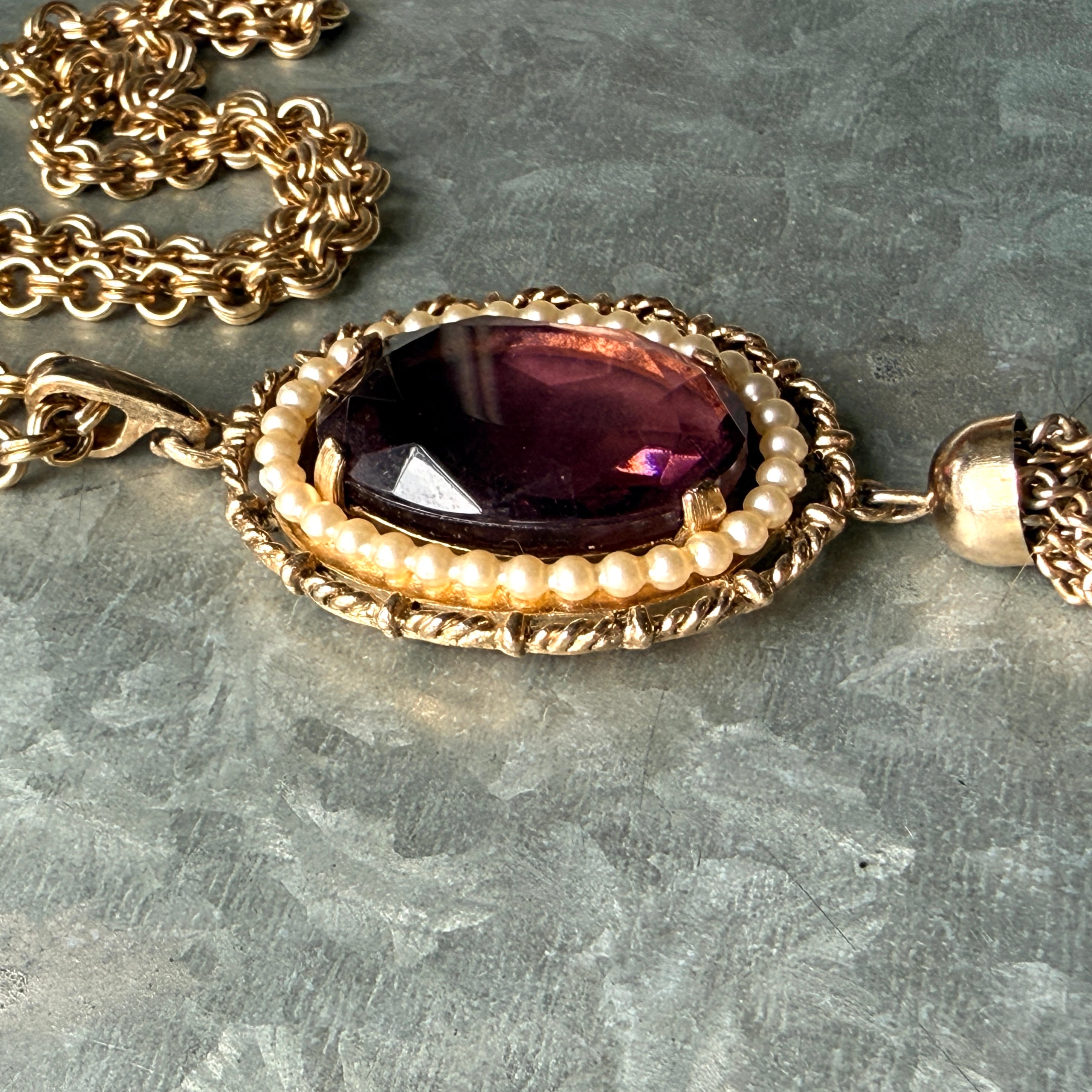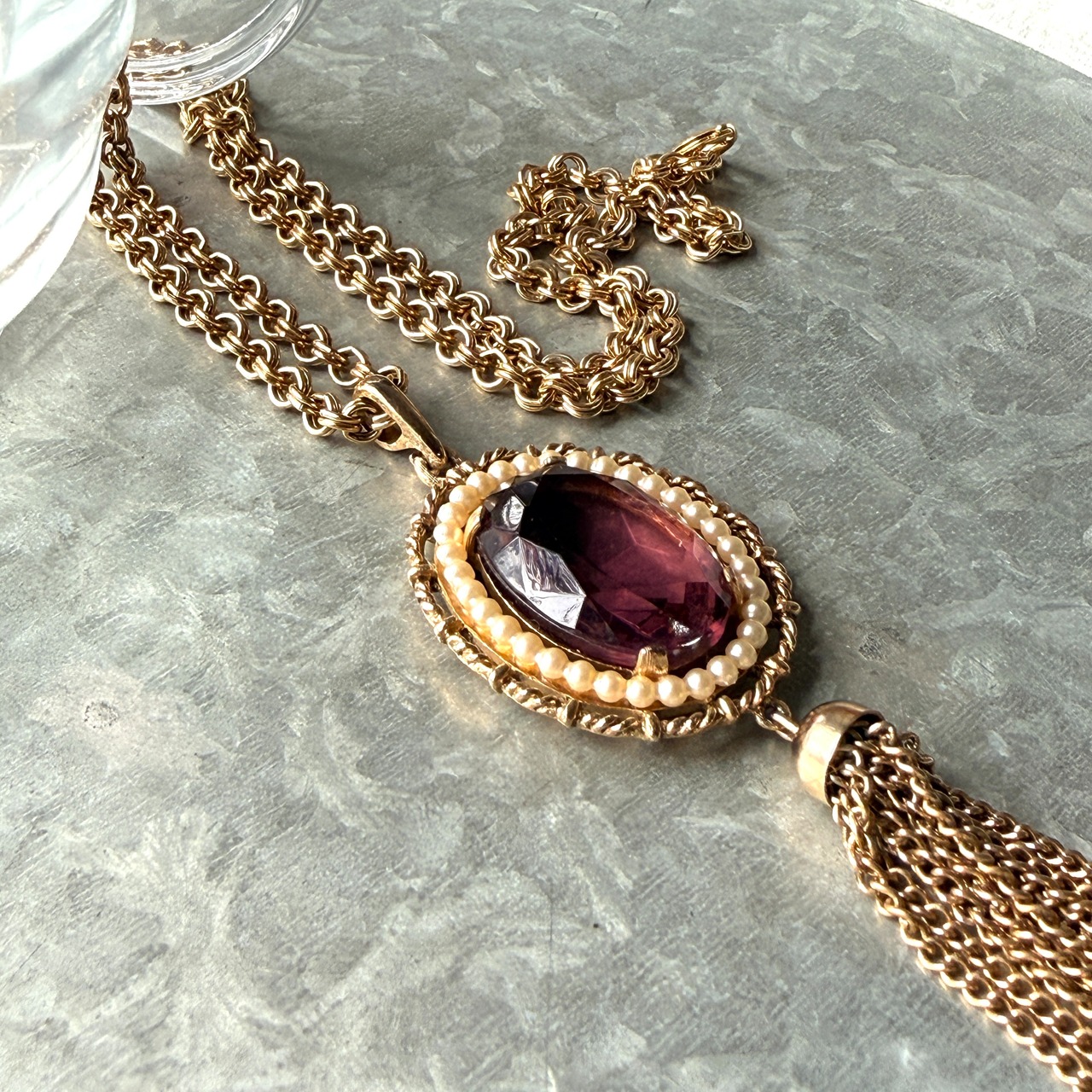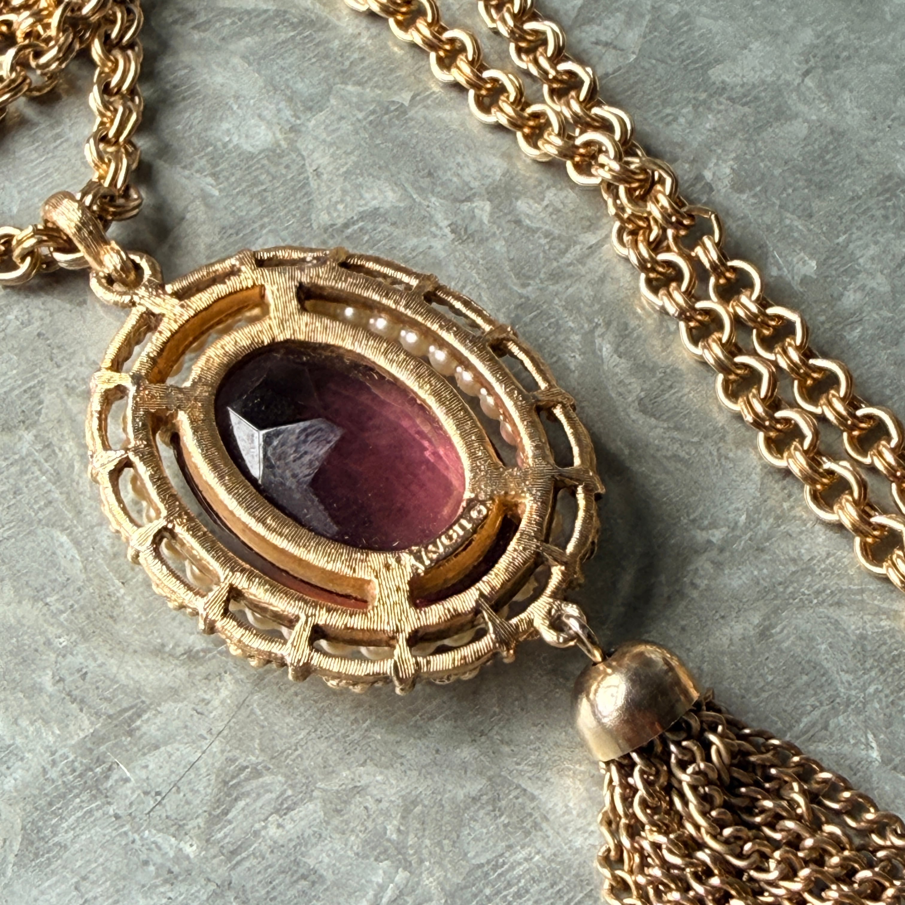 NA143-【 AVON 】エイボン・ヴィンテージネックレス 1972 Victorian Style Amethyst Pendant Necklace with Faux Pearl Tassel | eslup_boutique