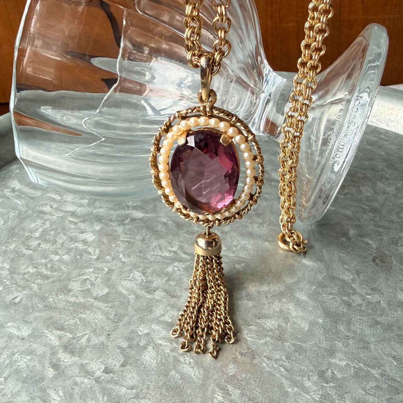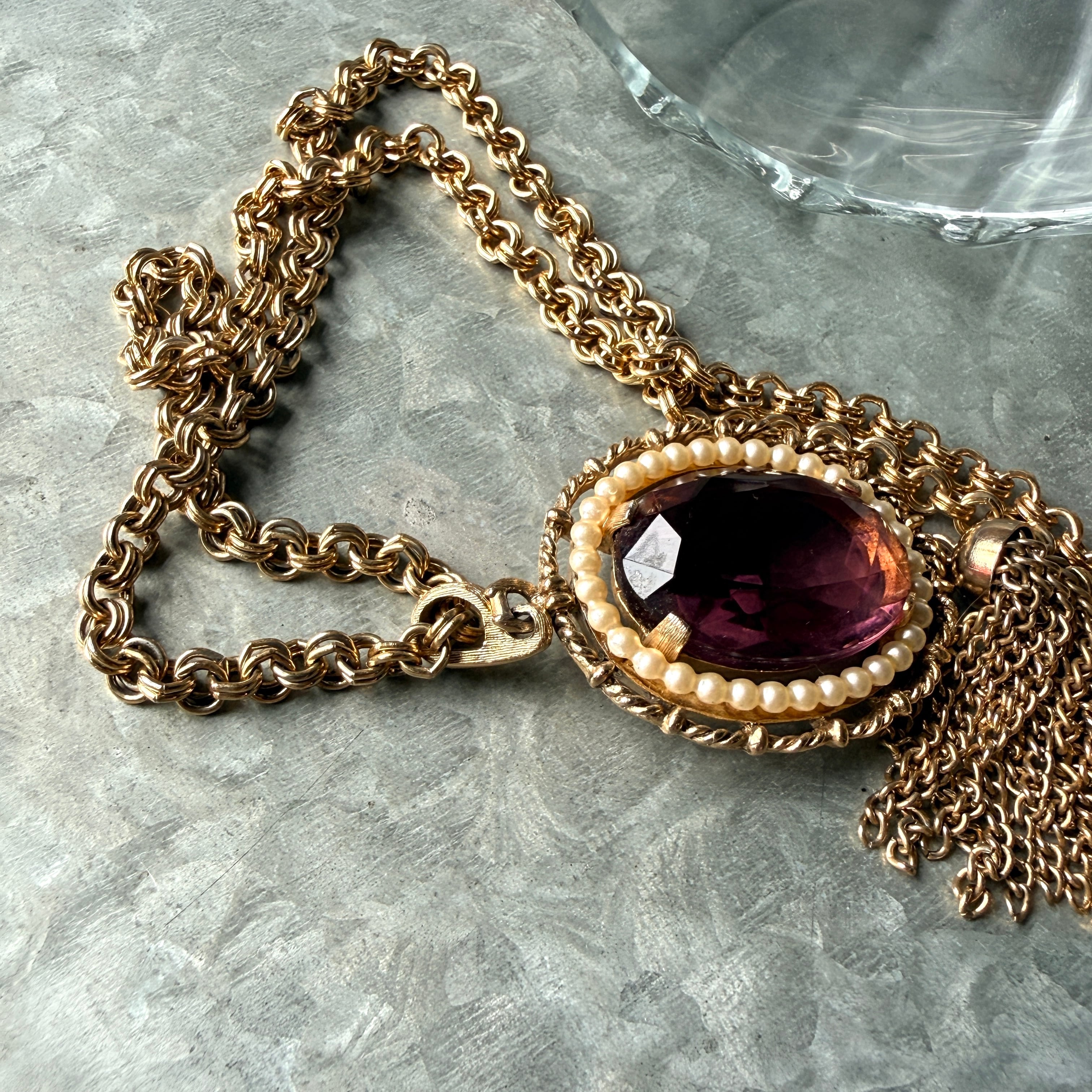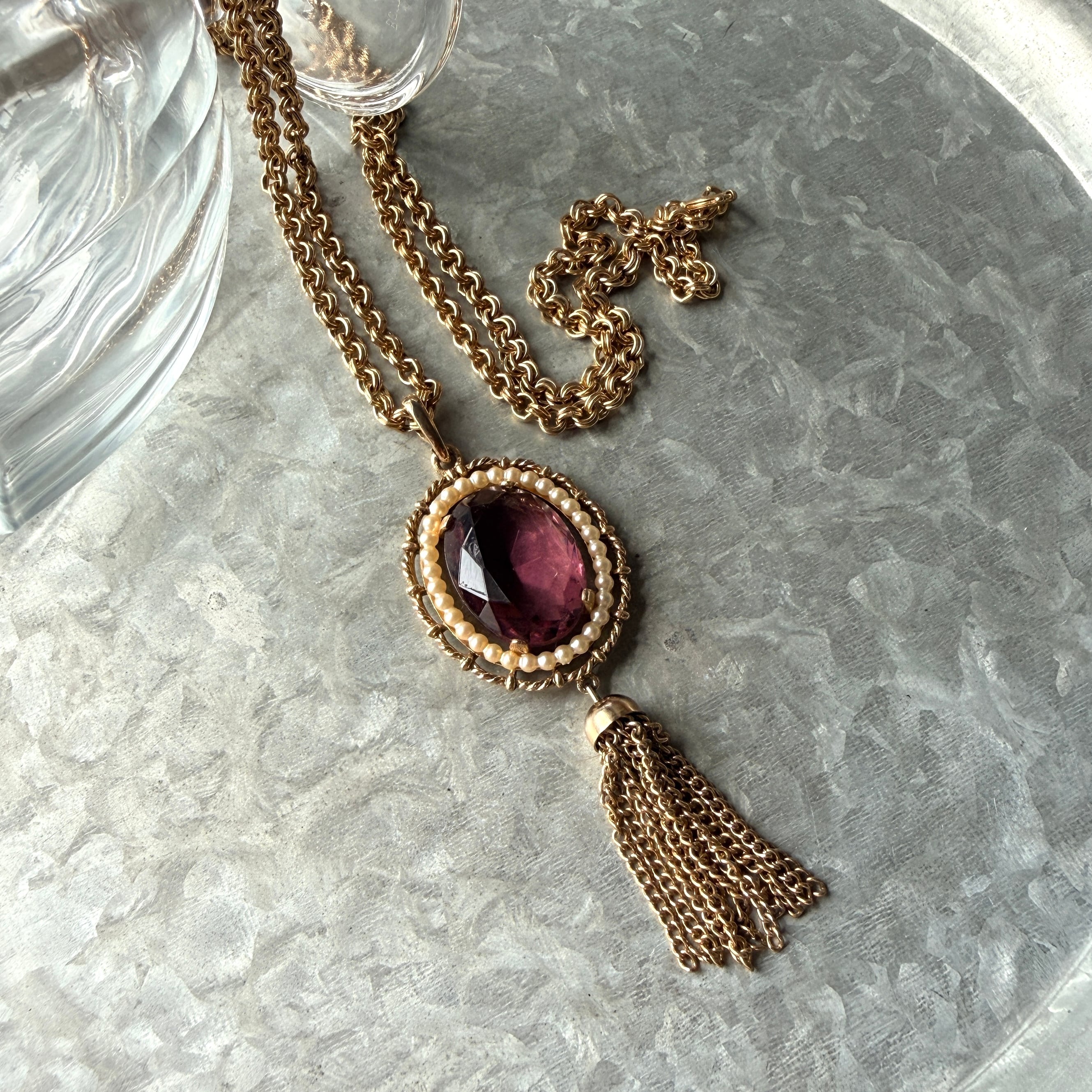 NA143-【 AVON 】エイボン・ヴィンテージネックレス 1972 Victorian Style Amethyst Pendant Necklace with Faux Pearl Tassel | eslup_boutique