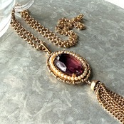 アメジストカラーのカットグラスとタッセルが印象的なゴールドトーンペンダントネックレス。