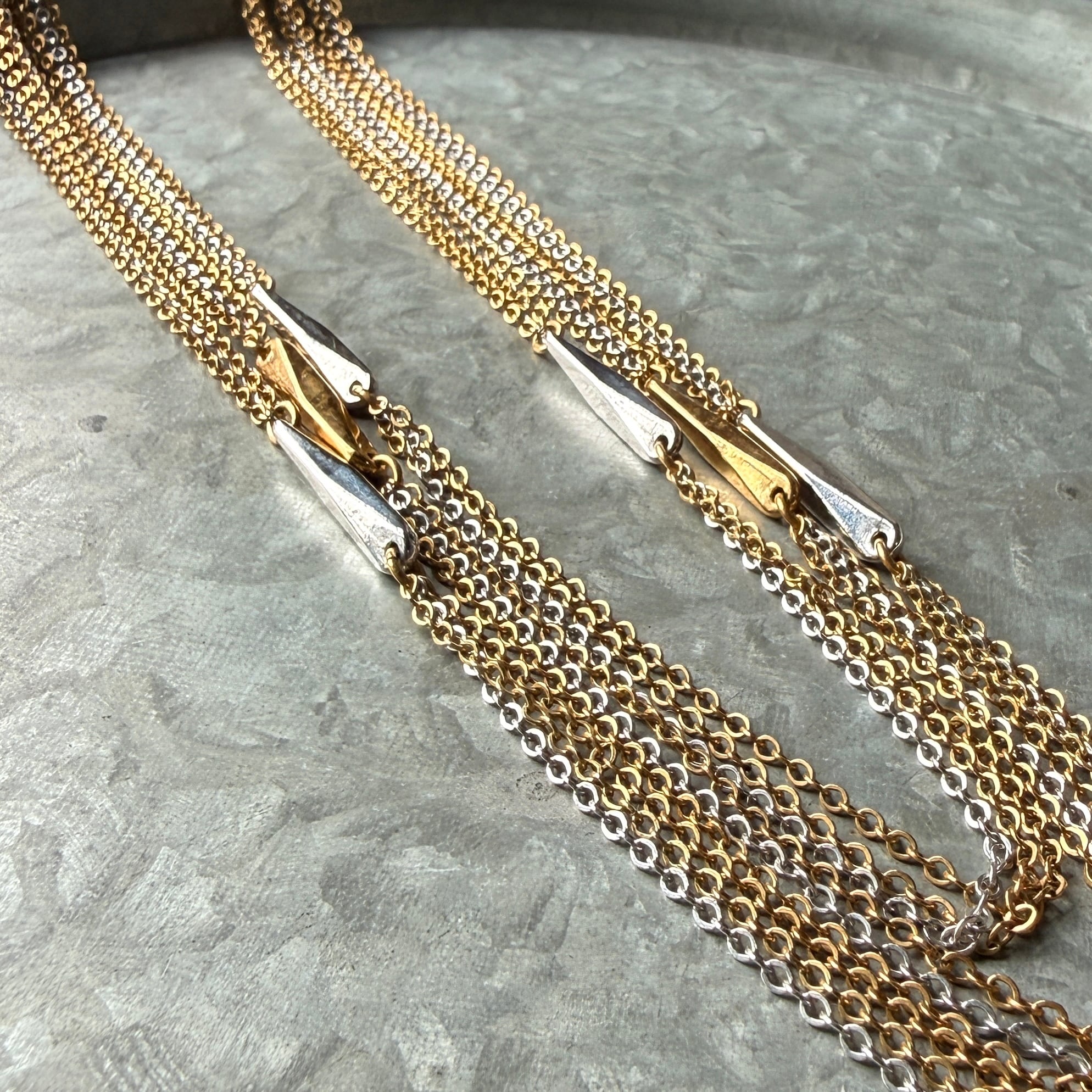 ゴールドとシルバートーンのコンビになったトリプルチェーンショートネックレス。