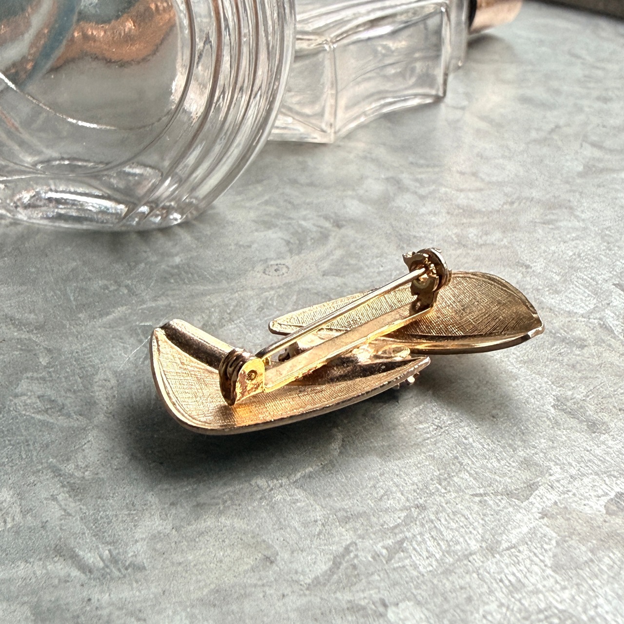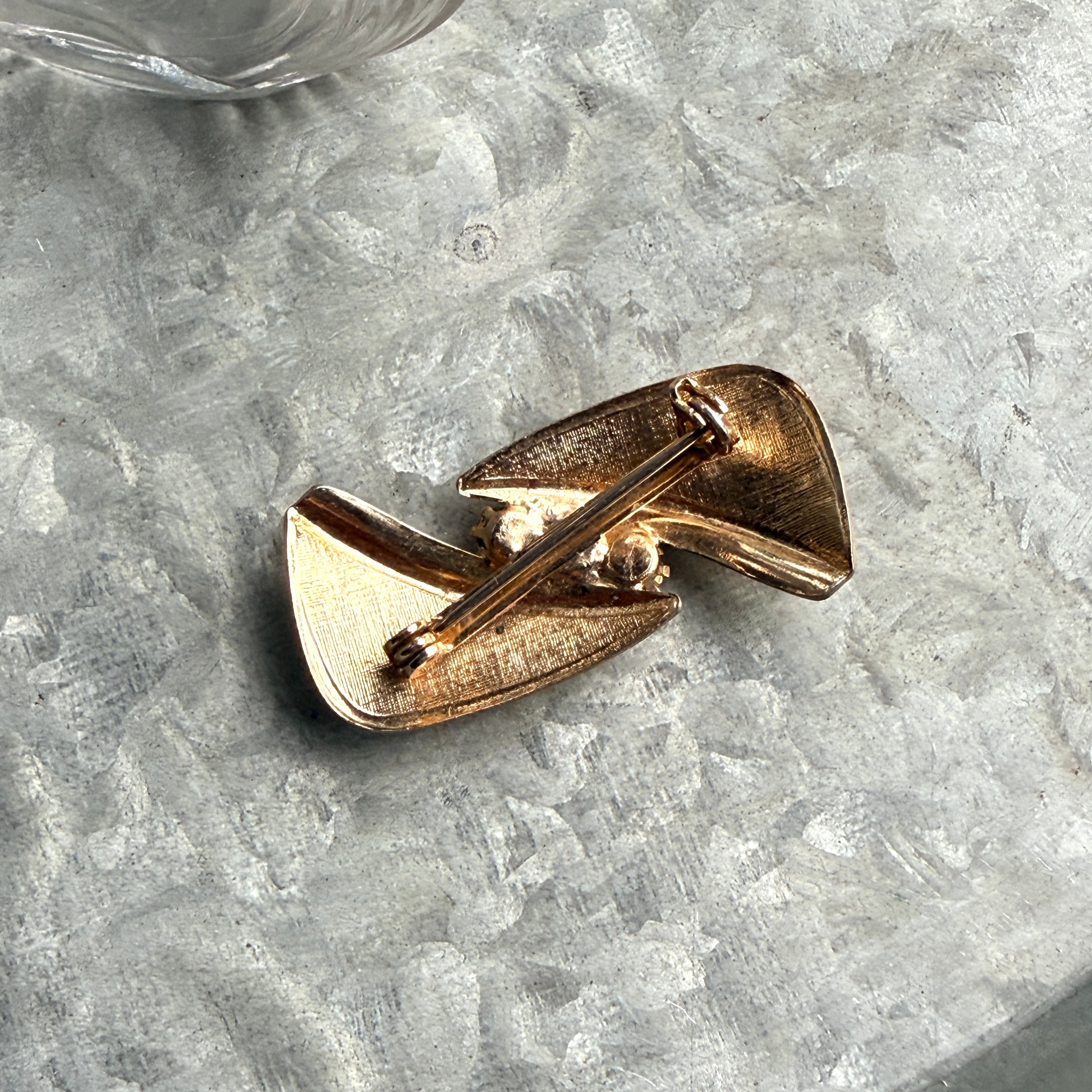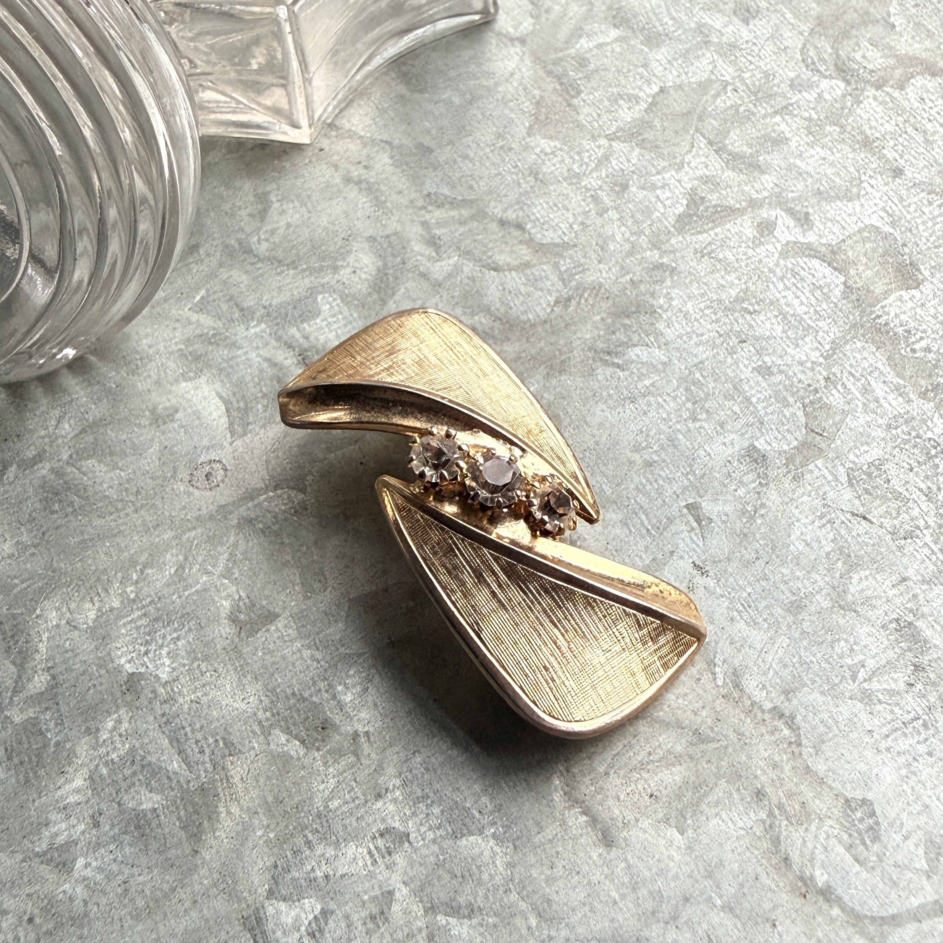 ゴールドトーンとラインストーンのリボンのようなフォルムのブローチ。