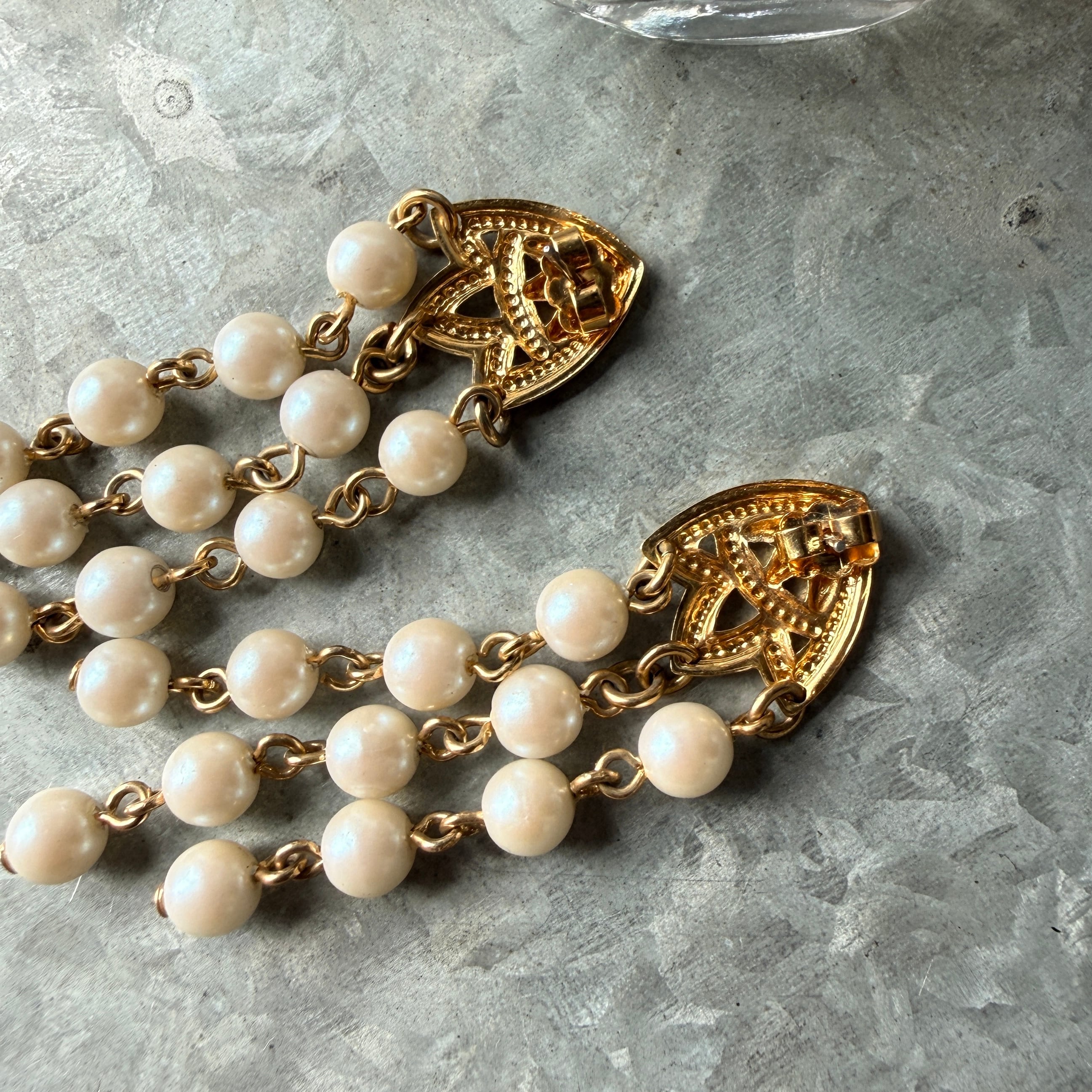 PA437-【 AVON 】エイボン・ヴィンテージピアス 1980〜90s Gold Tone Faux Pearl Fringe Pierced Earrings | eslup_boutique