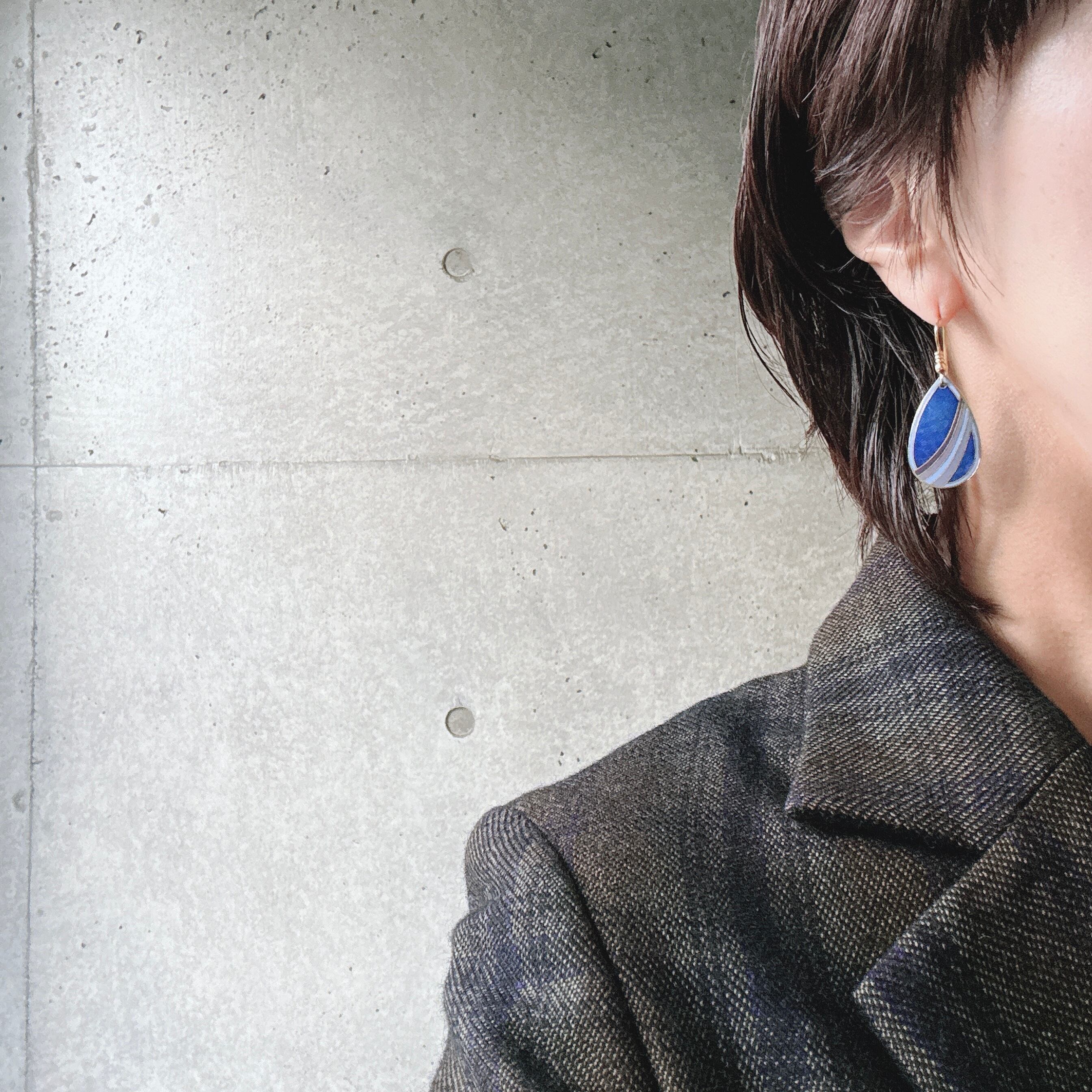 ゴールドトーンをベースに、七宝風エナメルペイントデザインが特徴的なドロップ型ダングルピアス。ロイヤルブルーを中心に、ブルー、ラベンダーなどグラデーションにカラーリングされた抽象的なデザイン。