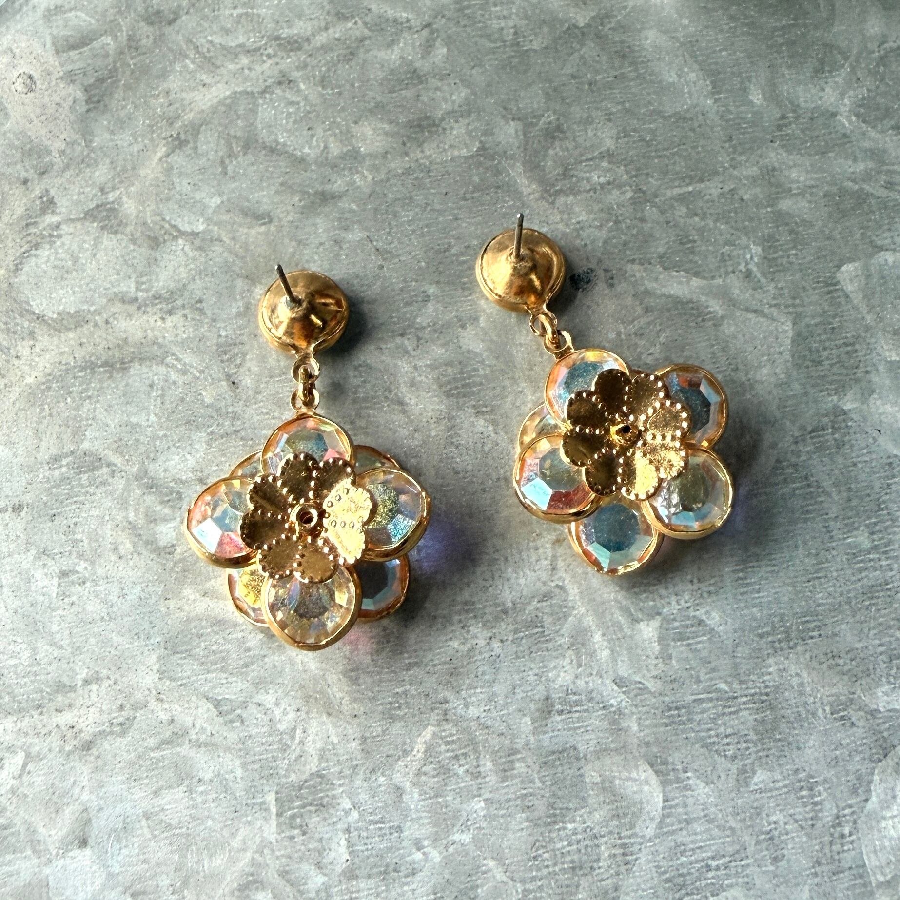 オーロラ加工されたクリスタルが美しいフローラルダングルピアス。