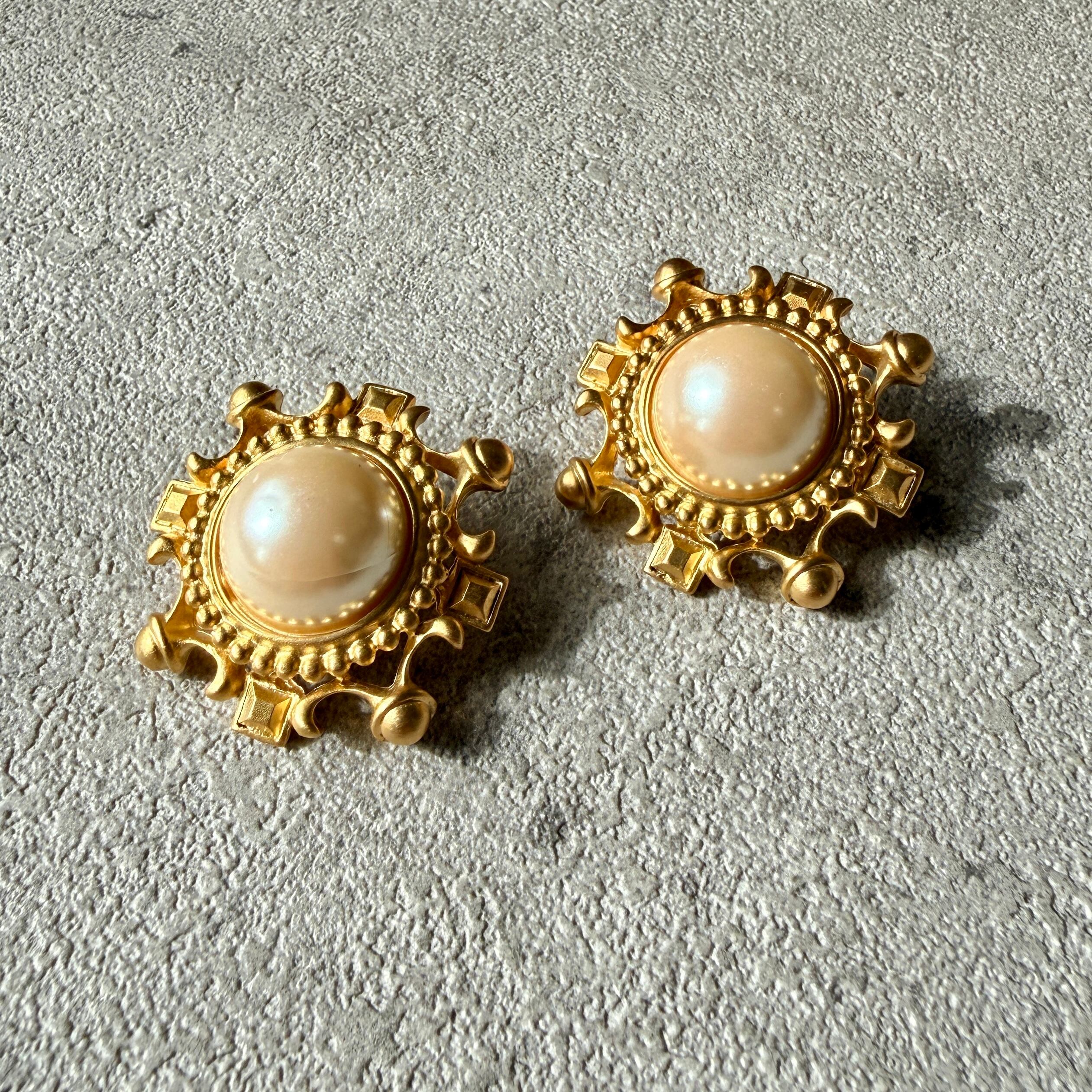 柔らかな照りのあるふっくらとした立体感あるパールが存在感を放ち、ヴィンテージならではの重厚感と細やかなディテールが、どの角度から見ても美しく耳元を彩ります。