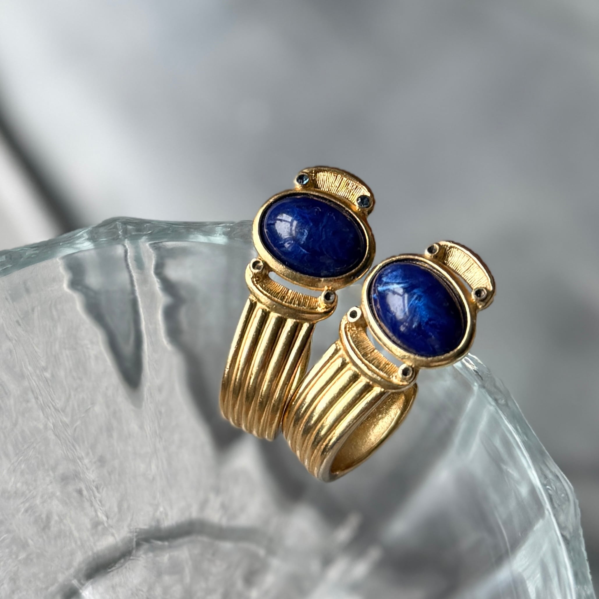 マーブルになった深いブルーのオーバル型カボションの土台は、マットな質感のゴールドトーンの微細なテクスチャーとリブになったフック型のハーフフープ。