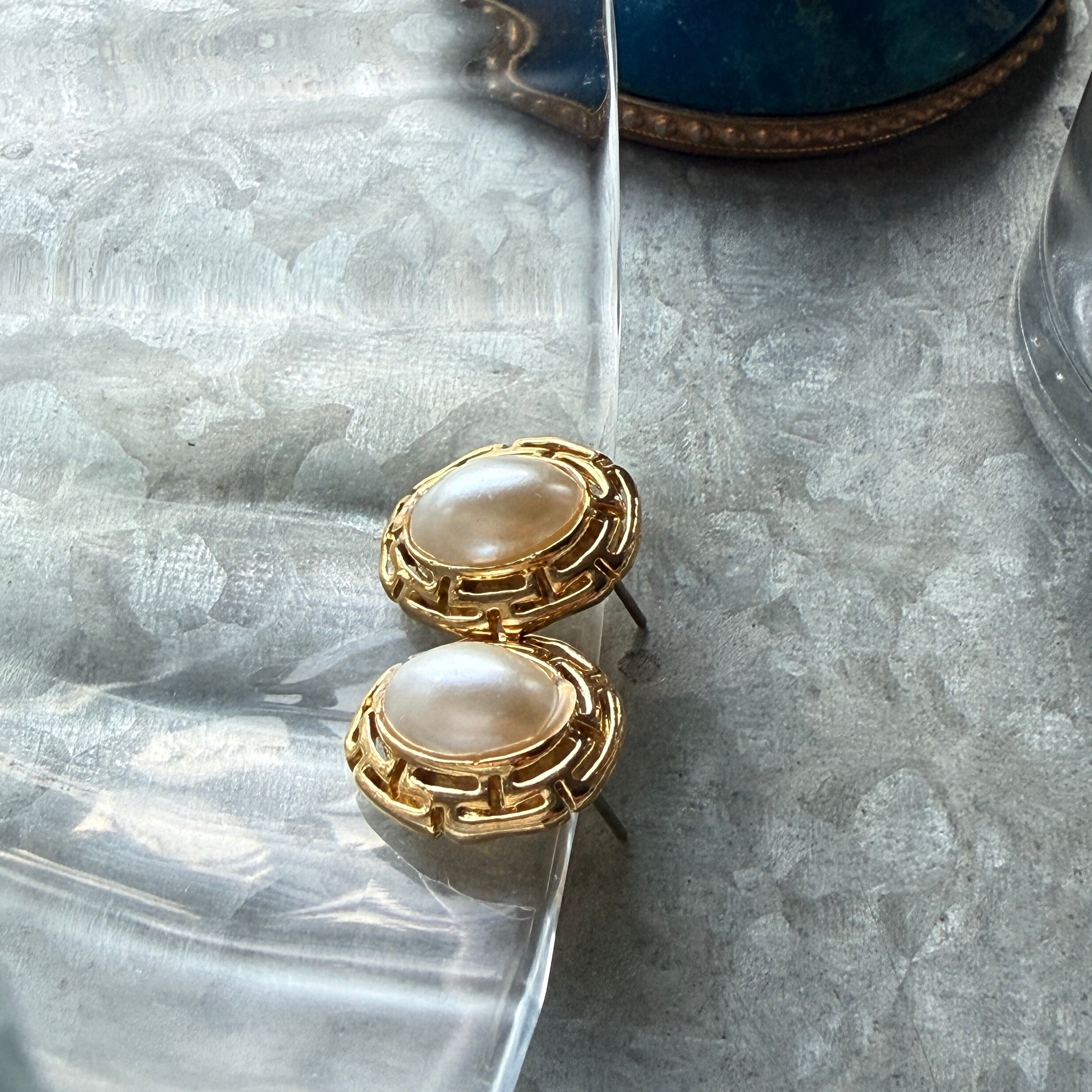 ゴールドトーンのオープンワークデザインのフレームがクラシックで上品なフェイクパールオーバルピアス。