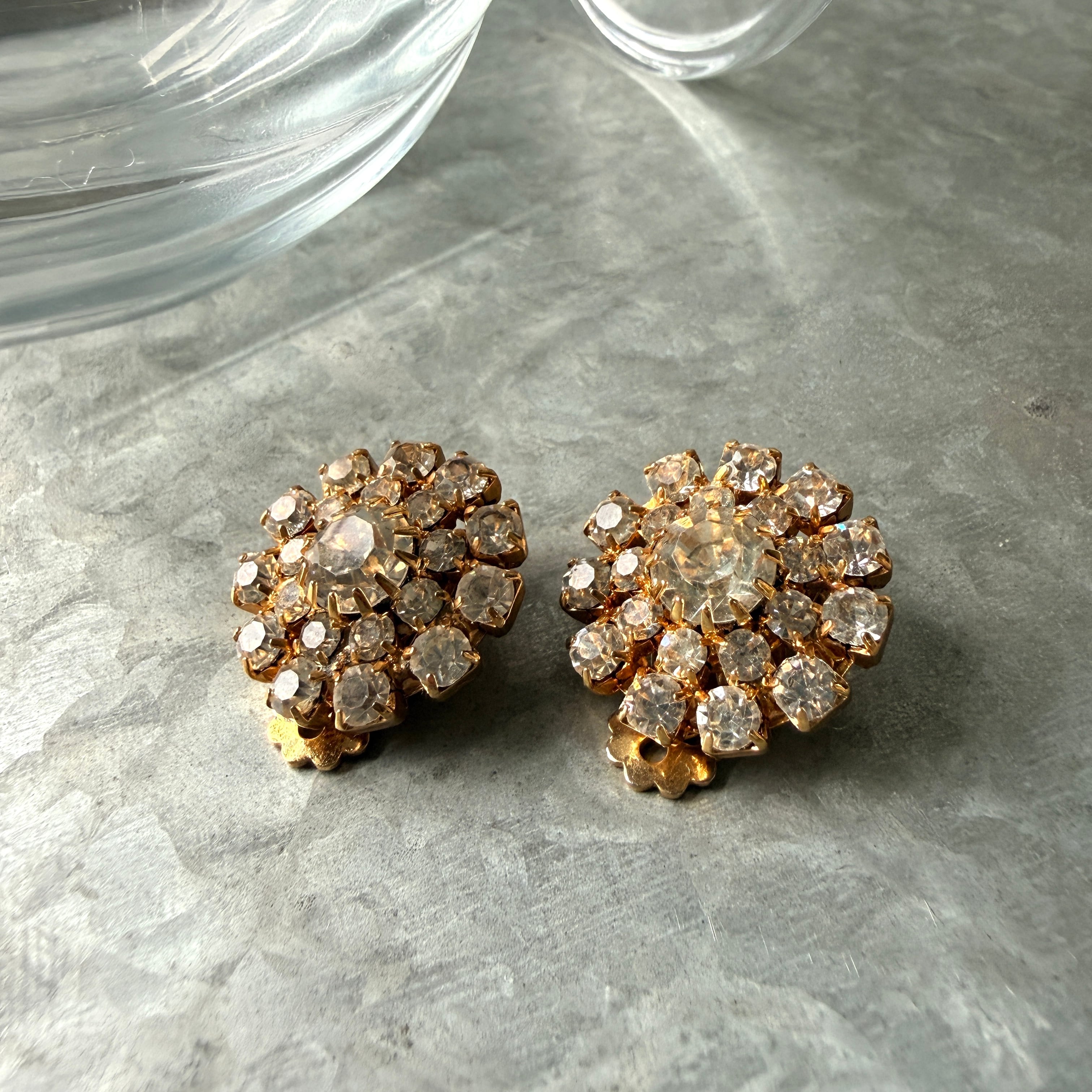 大きめの中央のラインストーンを中心に、大小のラインストーンが花びらのように並び、細かくカットされたクリアグラスが美しく光を集めます。