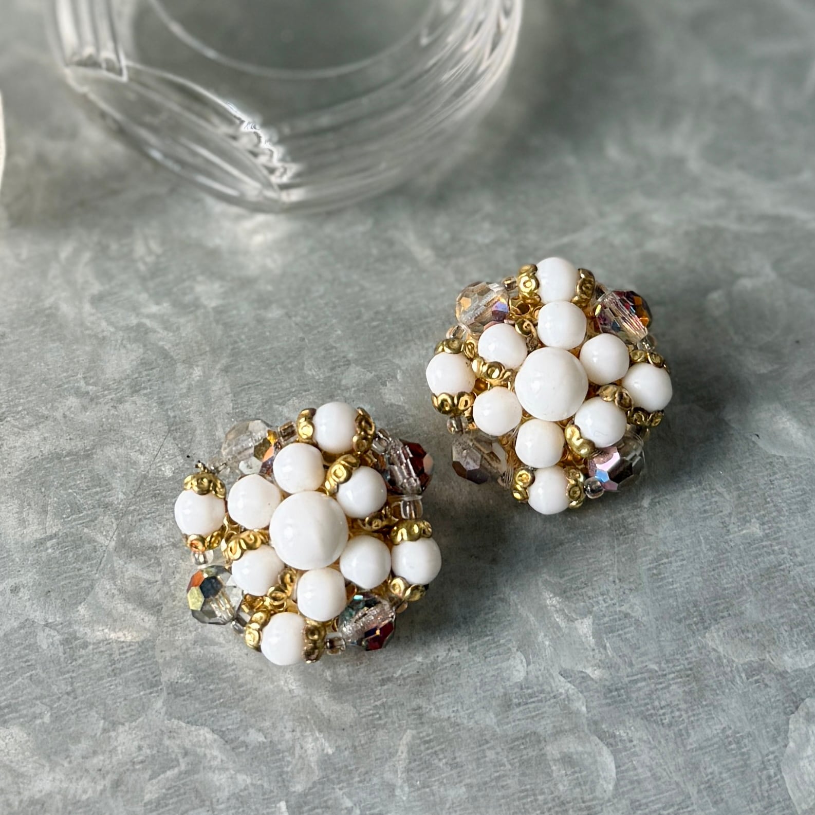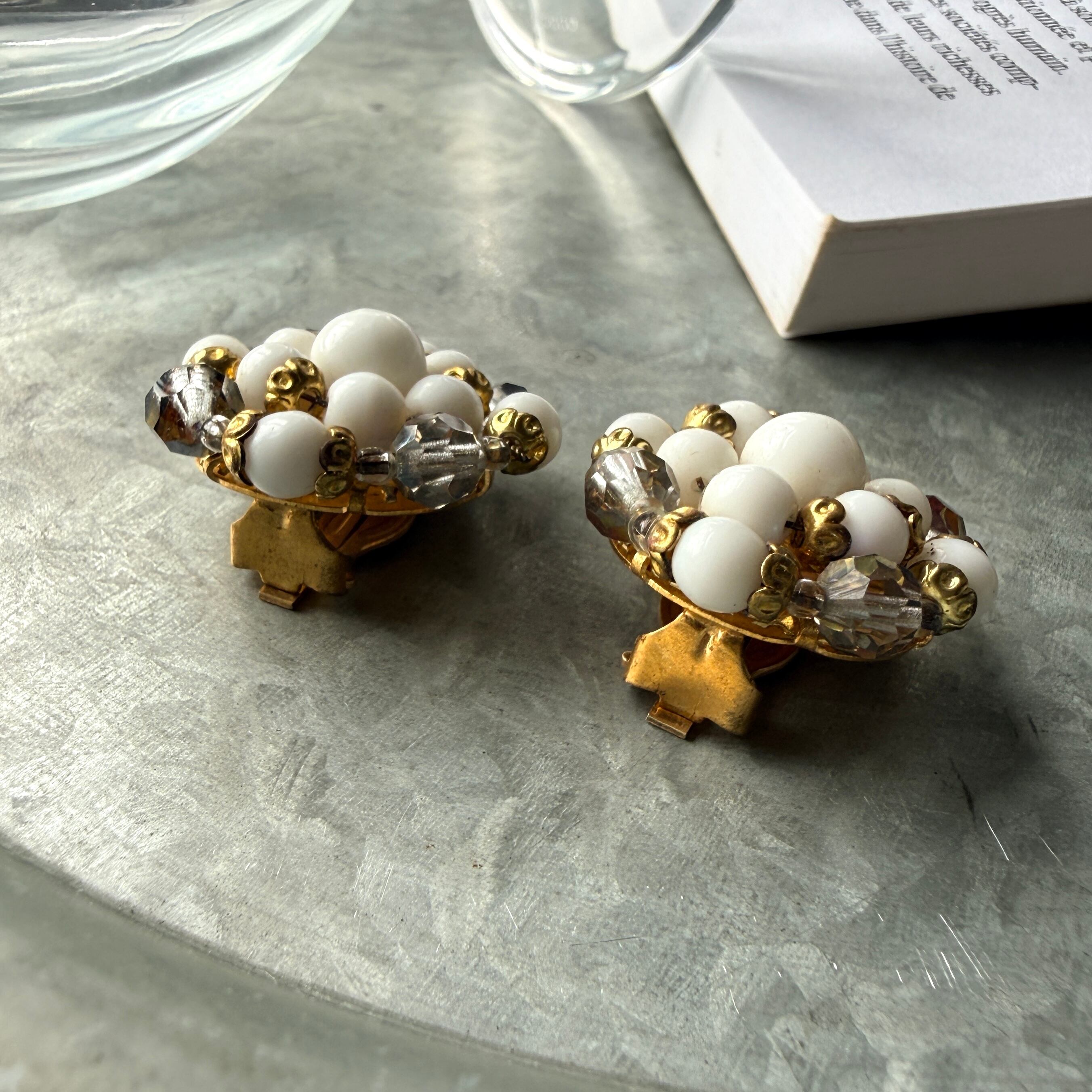 Y1205-ヴィンテージイヤリング U.S.A. 1950〜60's White Clear Gold Bead Cluster Clip Earrings