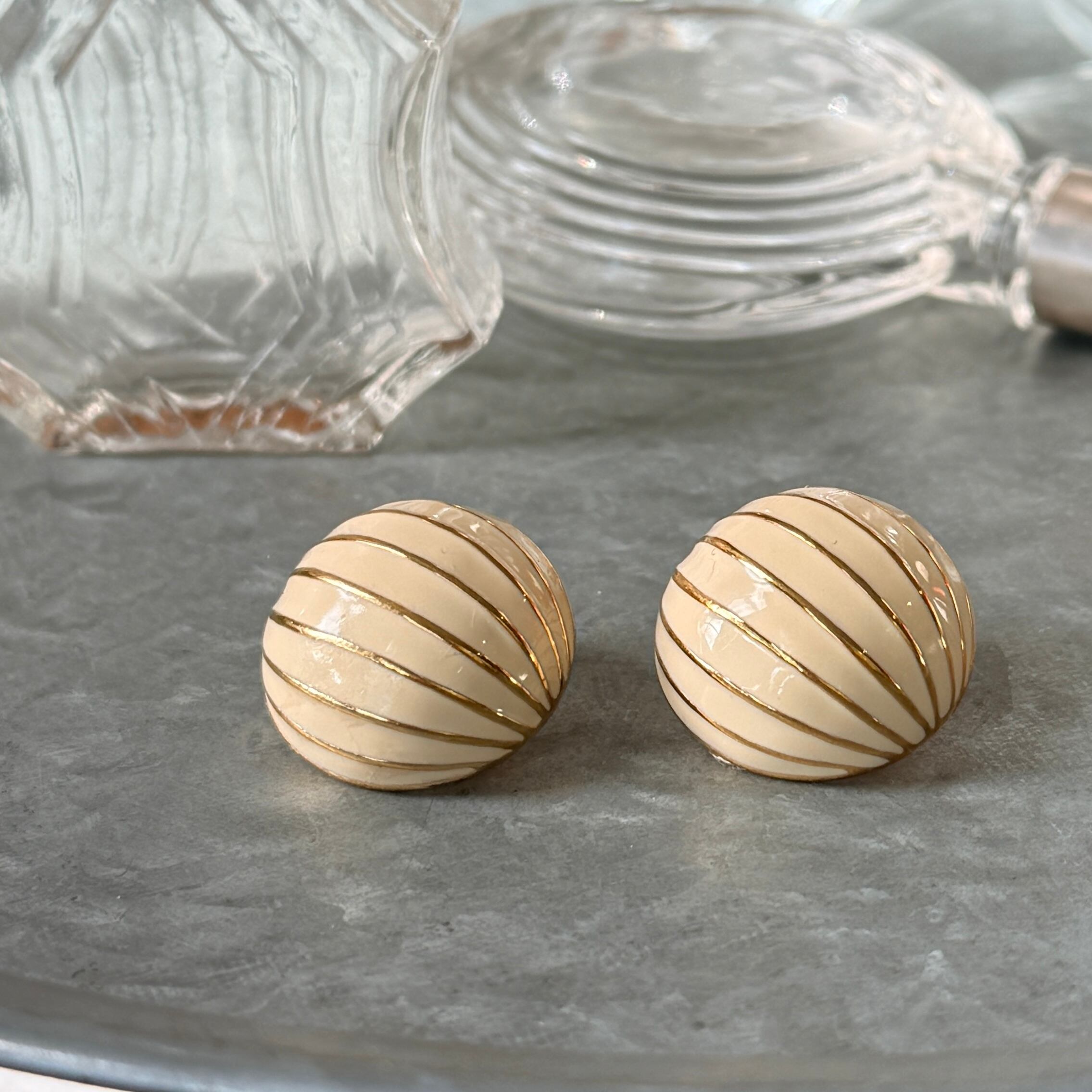 PN35-【 Napier 】ネイピア・ヴィンテージピアス 1980s Ivory Enamel Painted Gold Striped Dome Pierced Earring