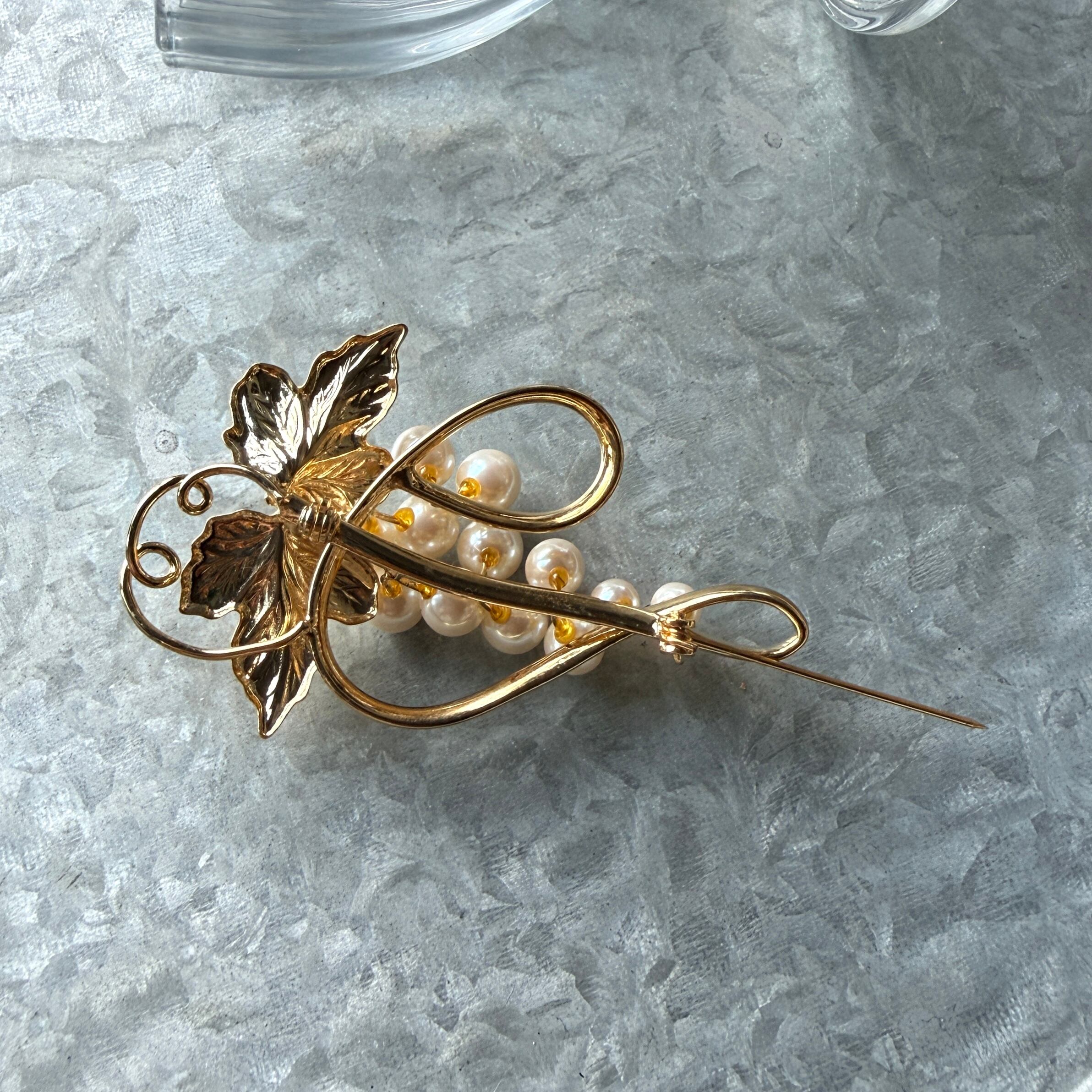 フェイクパールが上品なゴールドトーンのグレープモチーフブローチ。
