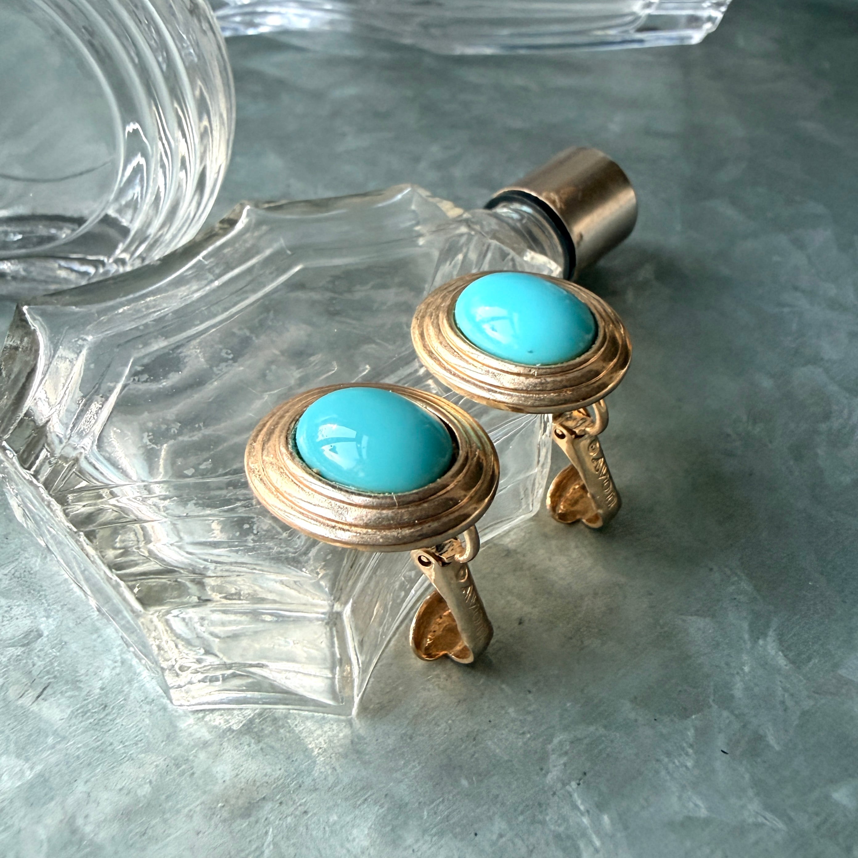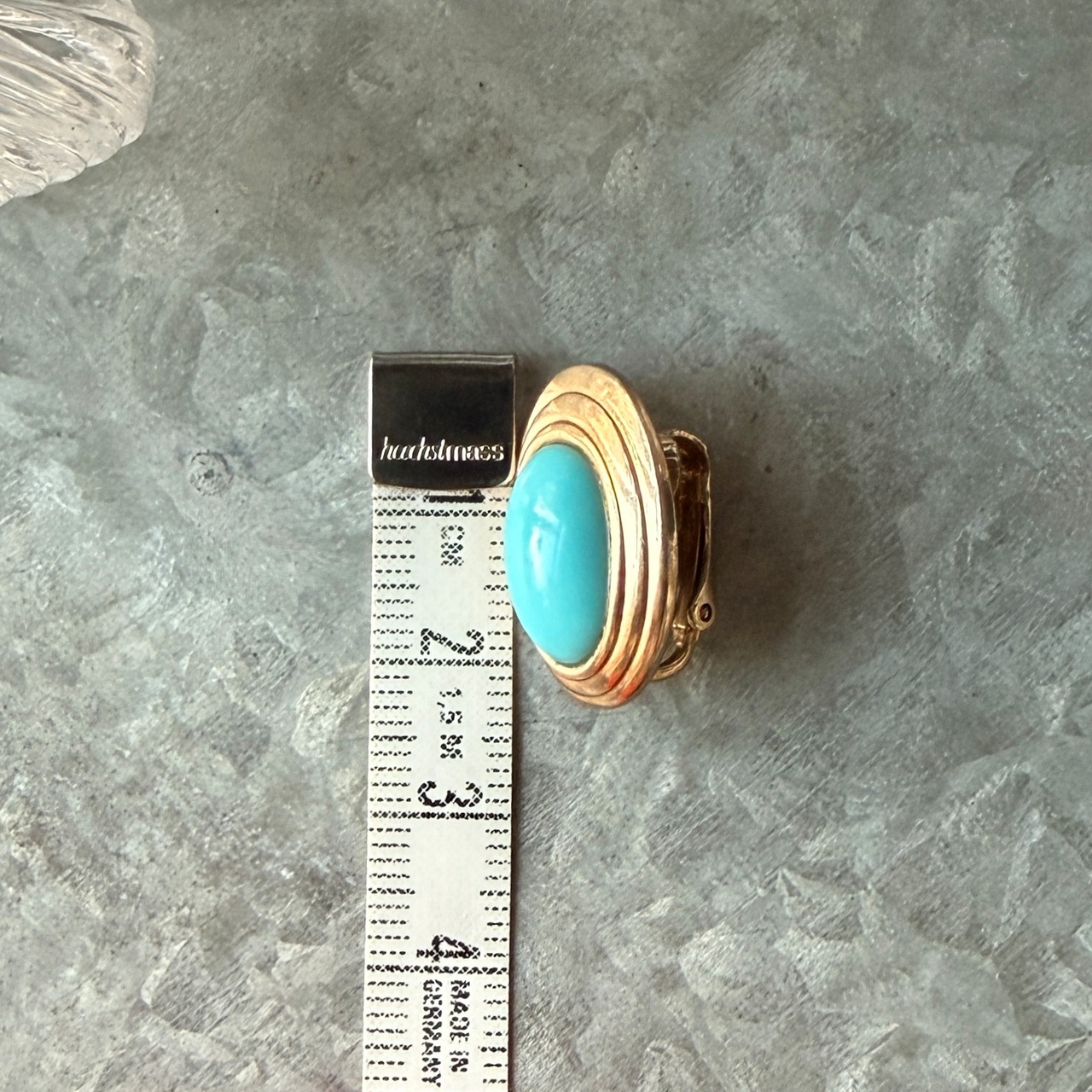 ターコイズブルーのカボションとゴールドトーンオーバルイヤリング。