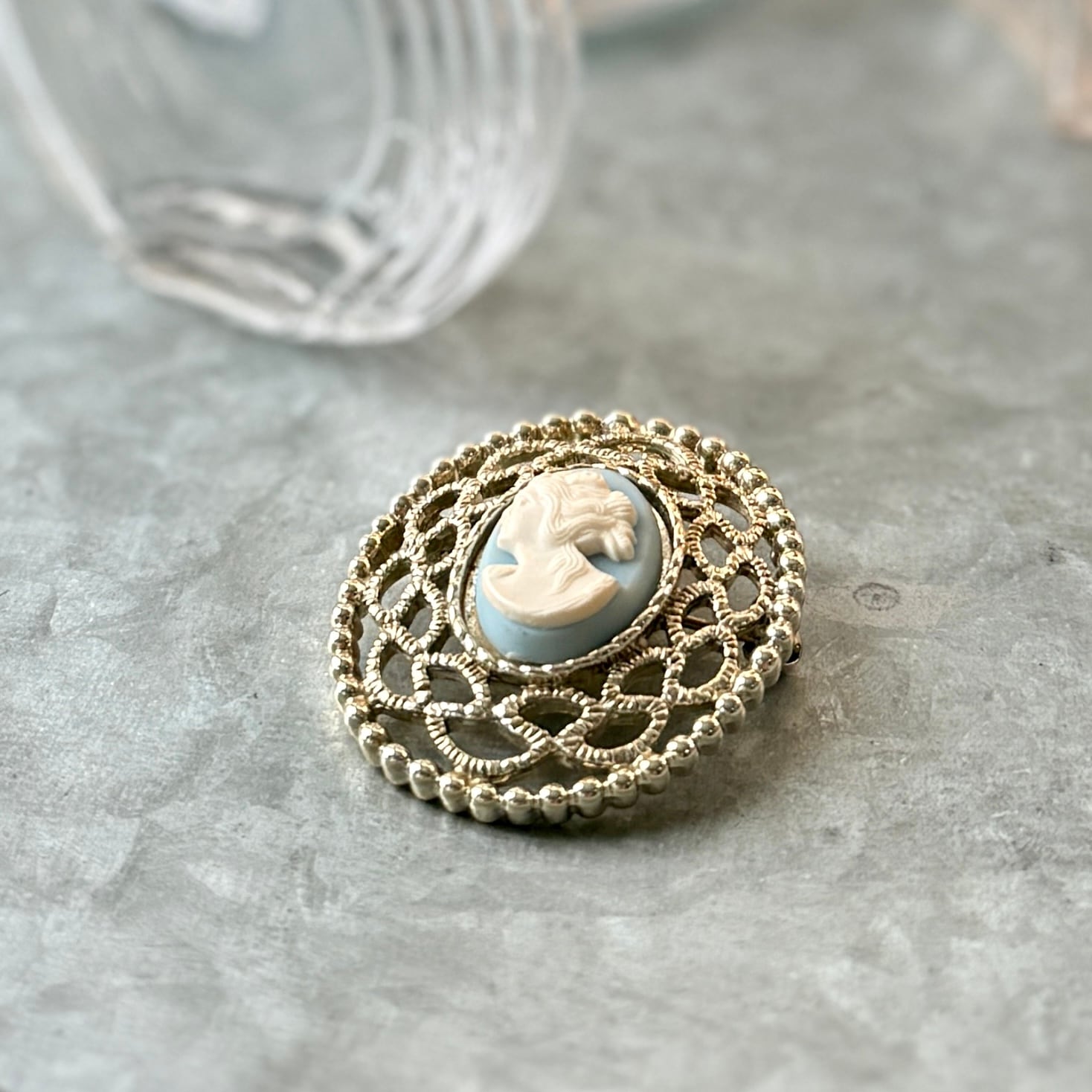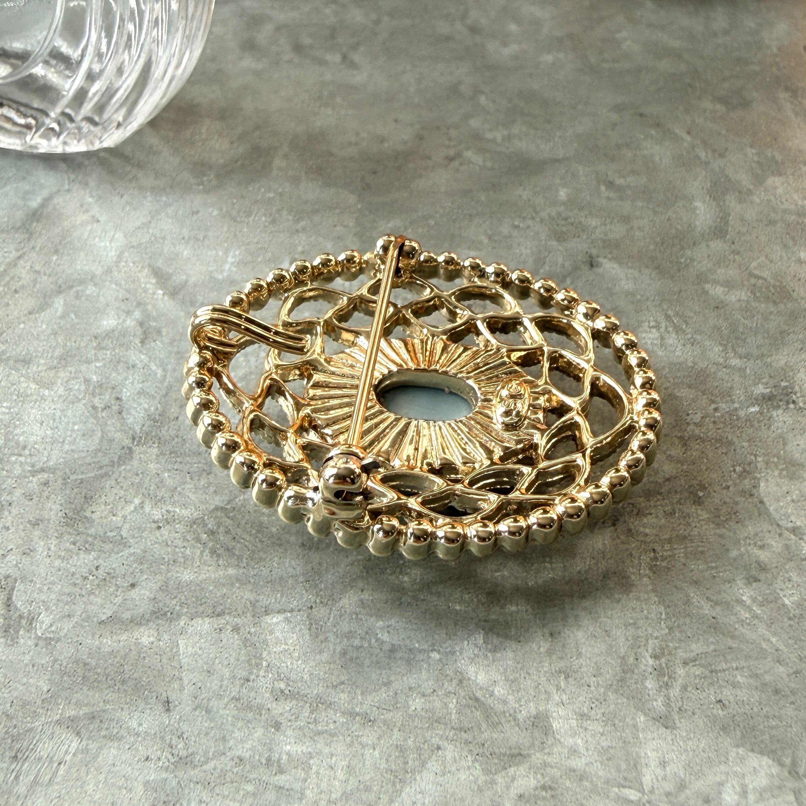 ライトブルーとホワイトのカメオと、フィリグリーレースデザインがクラシックで美しいブローチ。