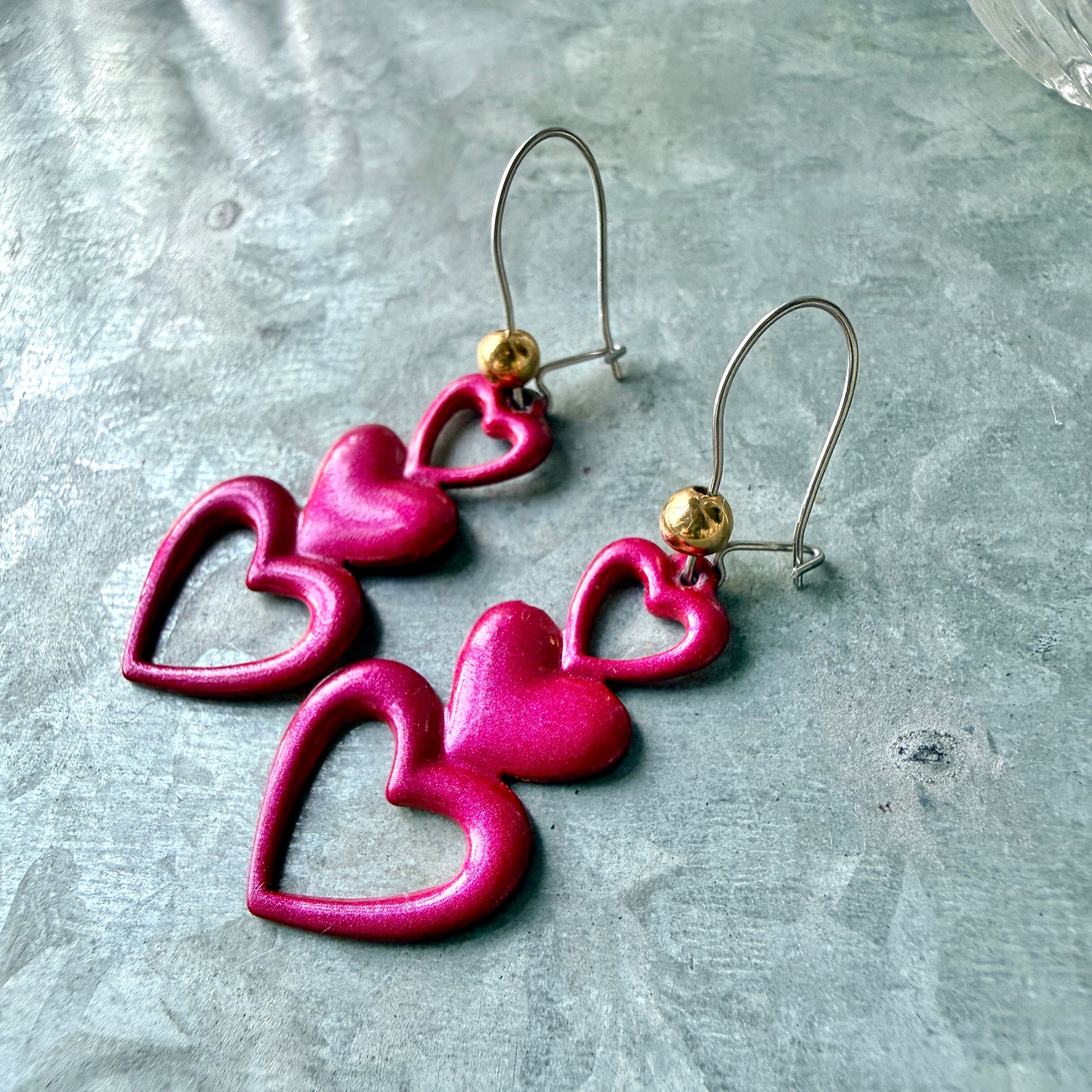 PA451-【 AVON 】エイボン・ヴィンテージピアス 1988 "Heart to Heart" Dangle Cutout in Dark Pink with Surgical Steel Post