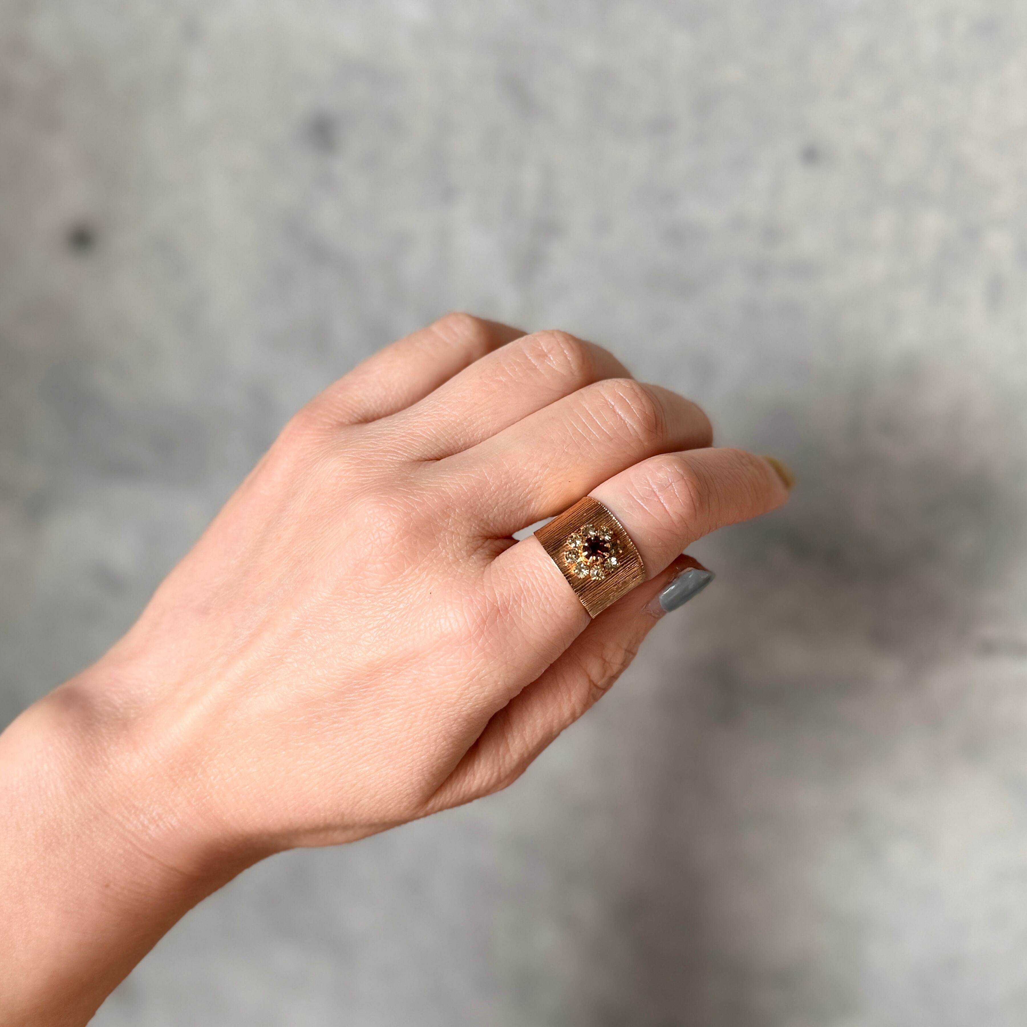 ワイドリングがレトロなムードを演出し、一つ付けるだけで、一気に華やかな雰囲気を纏わせます。