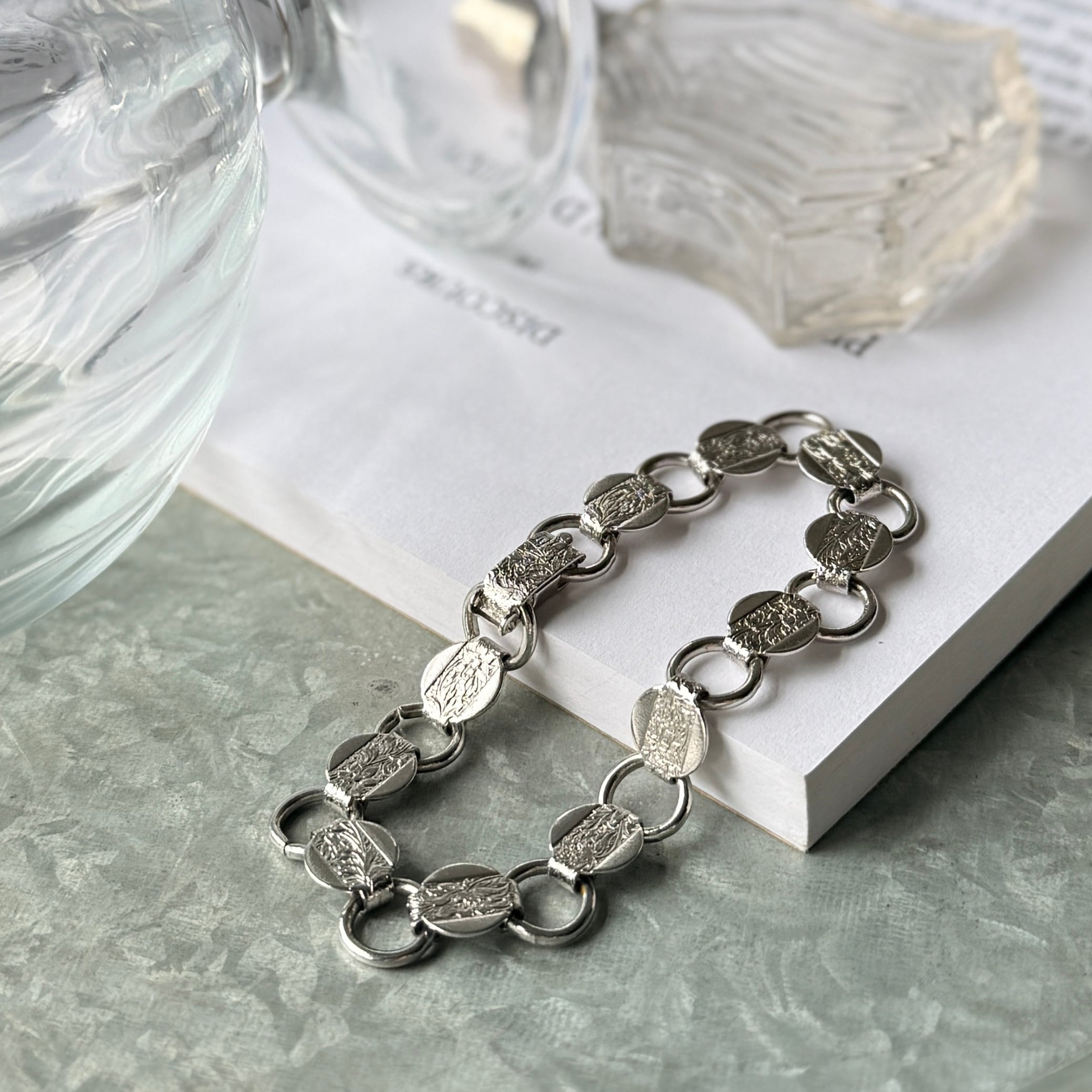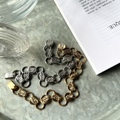 ボタニカル模様がエンボス加工されたラウンドプレートとフープが交互に連なるデザイン。